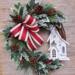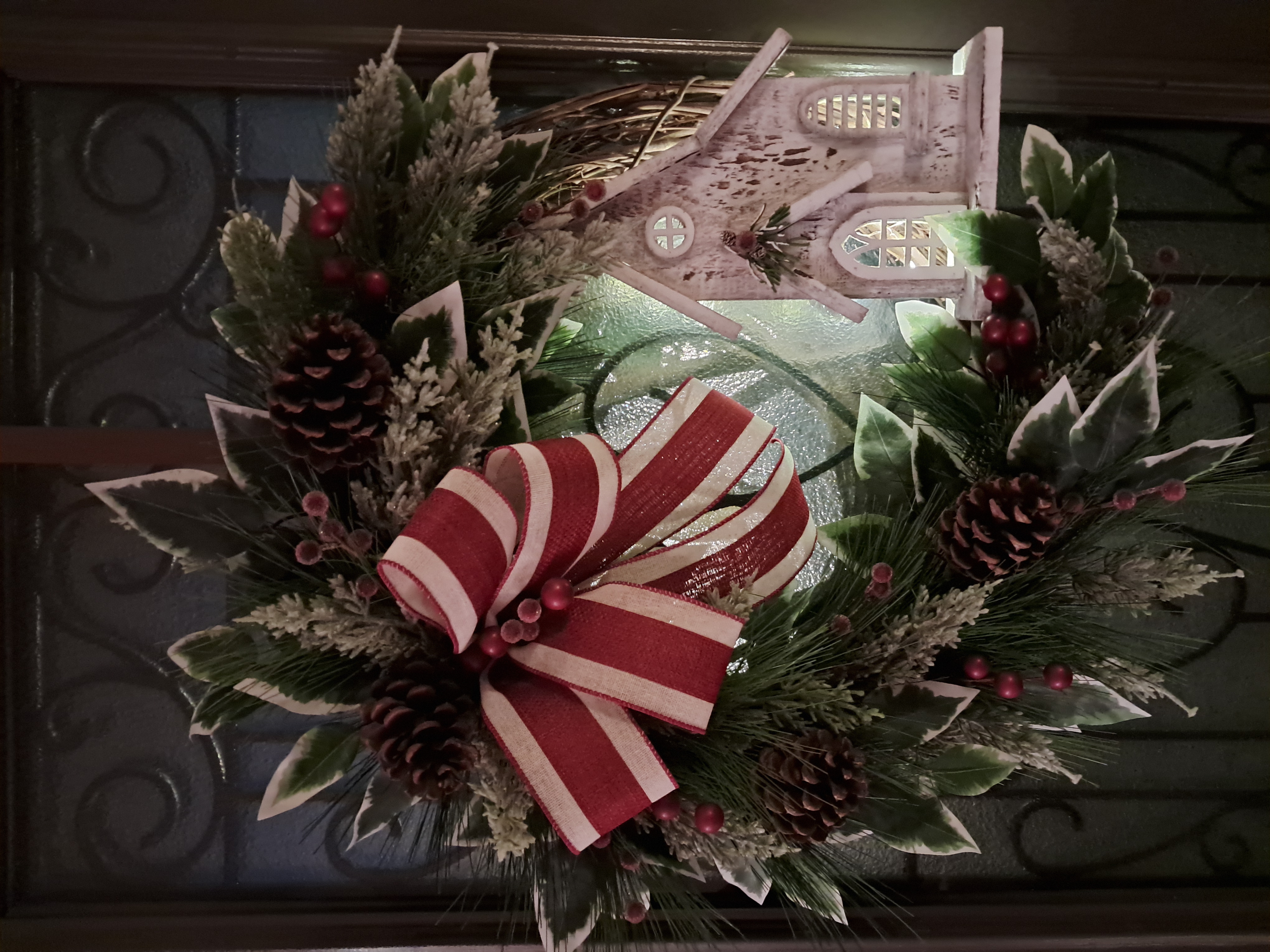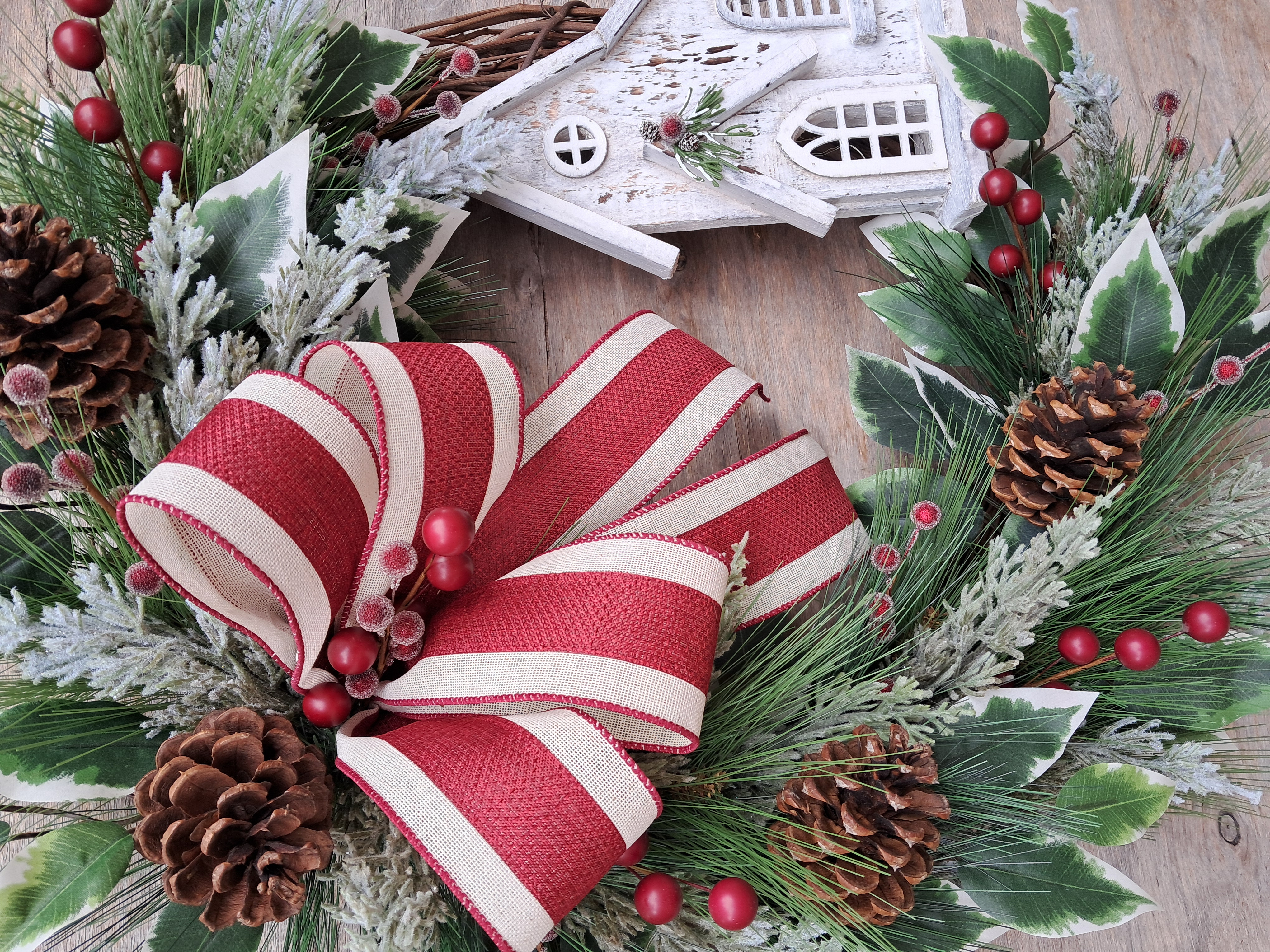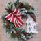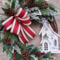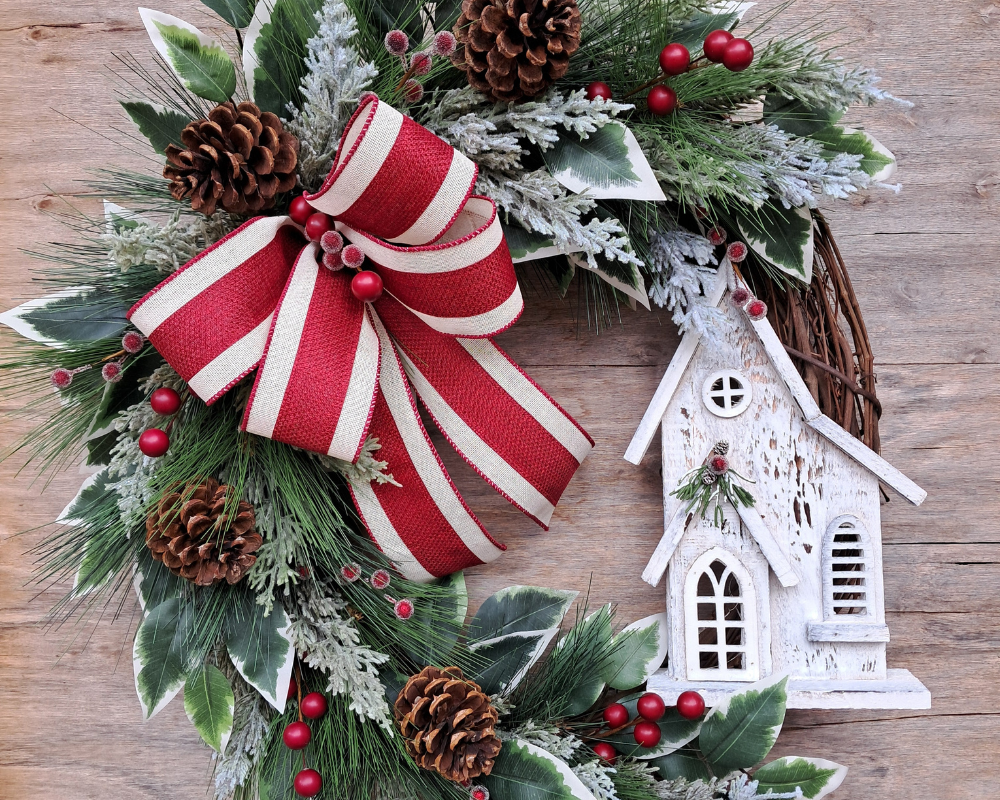 Bring timeless rustic charm to your Christmas decor with this beautifully handcrafted wreath. Built on a natural grapevine base, it features a quaint rustic church that lights up with a soft, warm glow — a battery-operated detail that adds cozy magic to your holiday evenings. Surrounding the church are layers of variegated ficus, long-needle pine, shimmering cedar, pine cones, and rich red berries. A red and ivory bow completes the look, blending festive color with refined, homespun elegance.