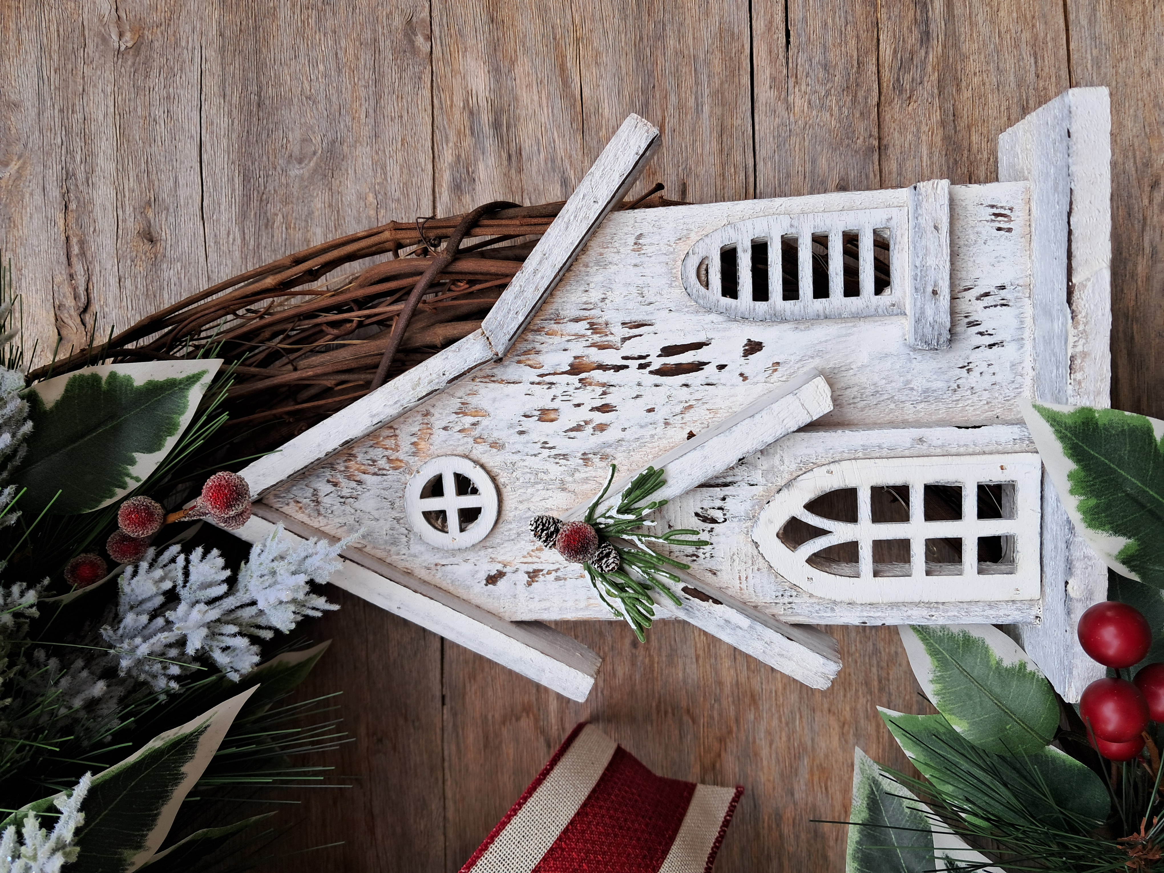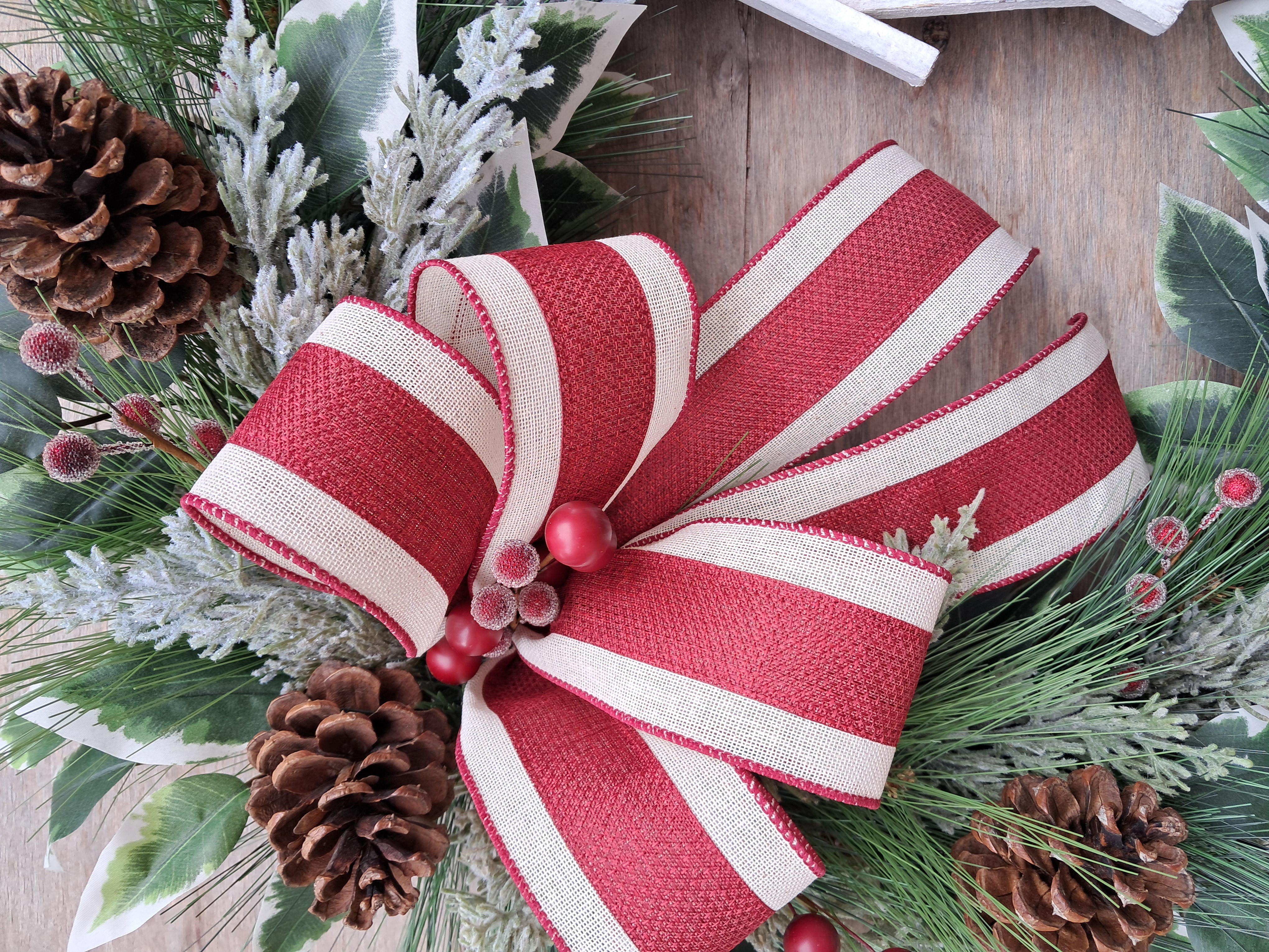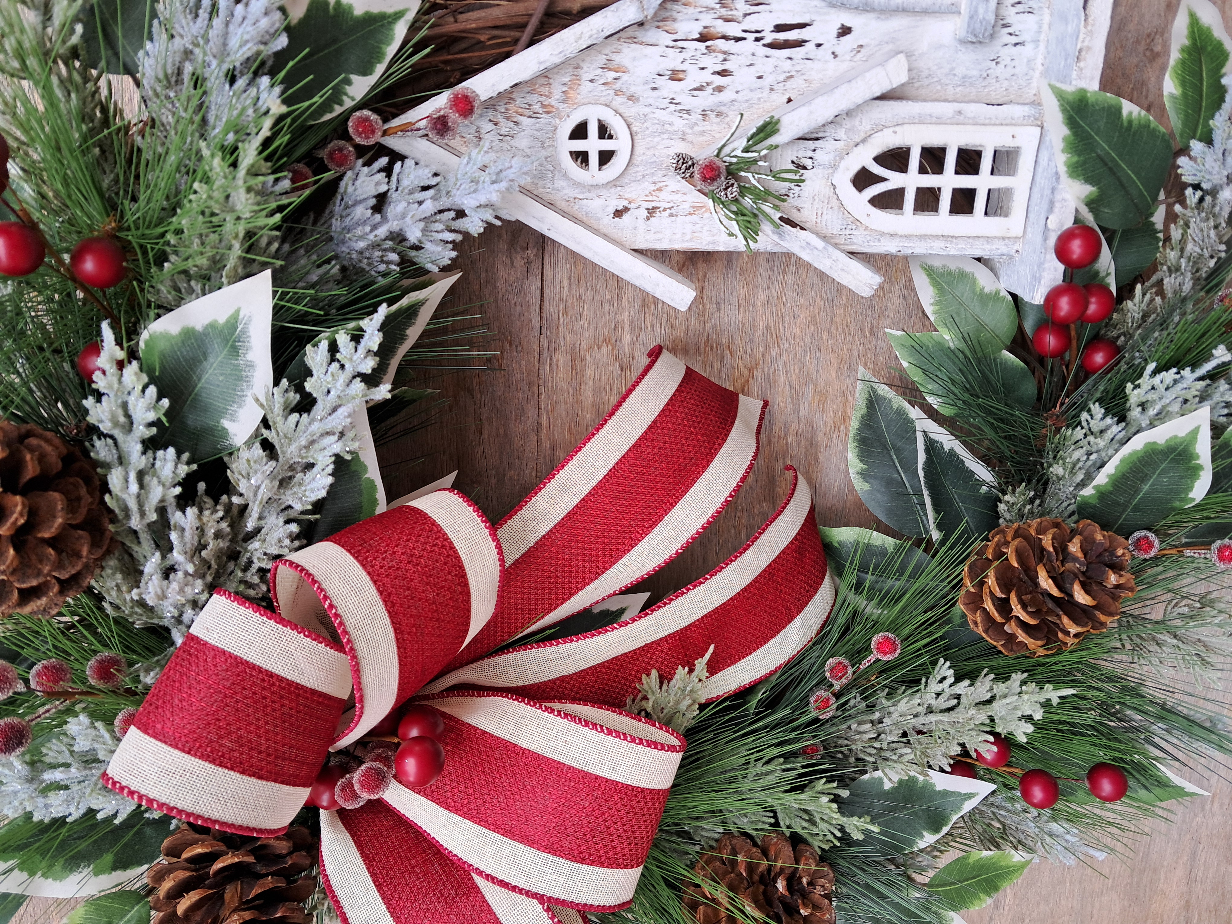 Bring timeless rustic charm to your Christmas decor with this beautifully handcrafted wreath. Built on a natural grapevine base, it features a quaint rustic church that lights up with a soft, warm glow — a battery-operated detail that adds cozy magic to your holiday evenings. Surrounding the church are layers of variegated ficus, long-needle pine, shimmering cedar, pine cones, and rich red berries. A red and ivory bow completes the look, blending festive color with refined, homespun elegance.