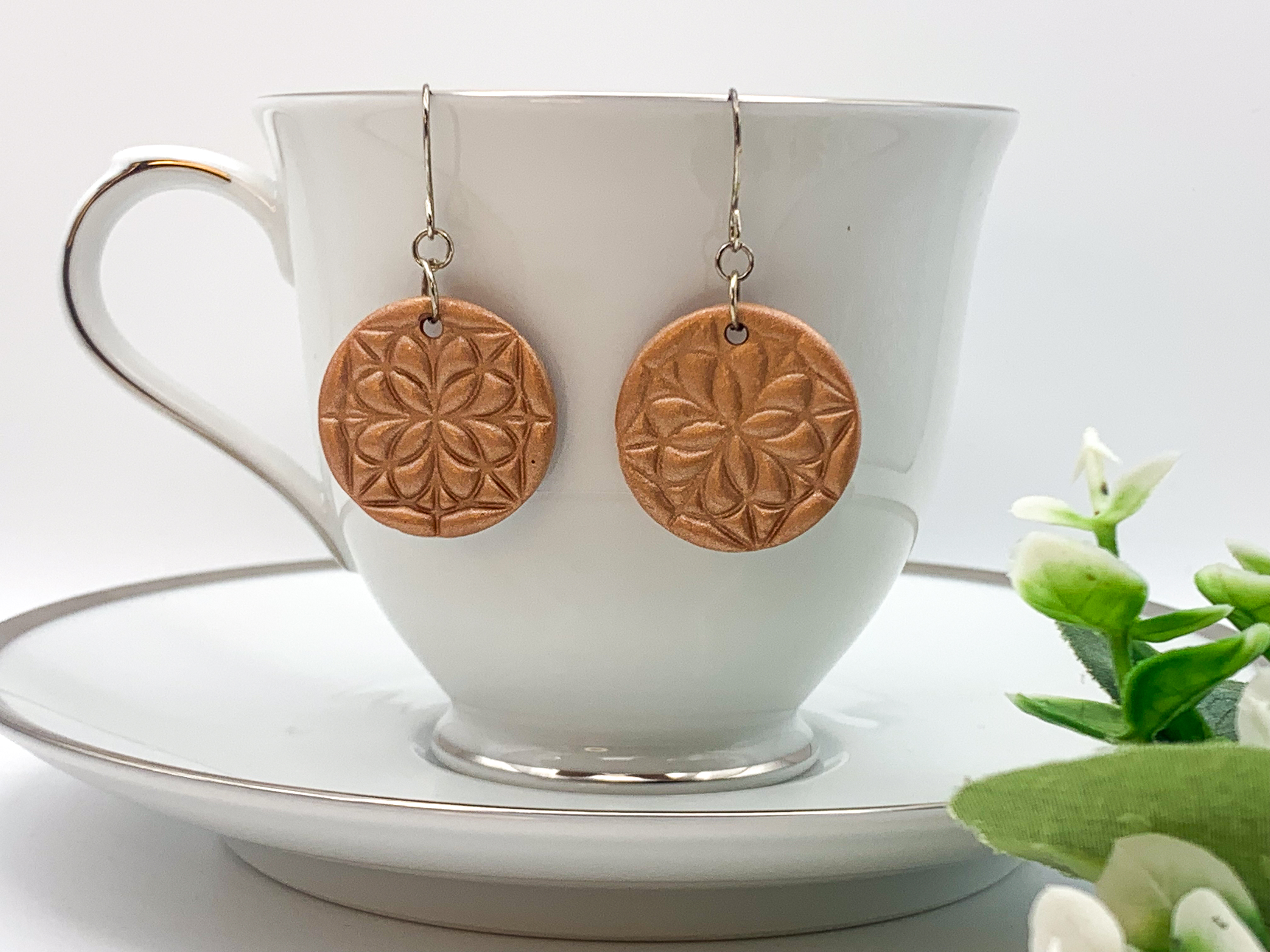 Embossed with a delicate floral pattern, these copper-toned earrings bring earthy elegance to any outfit. Perfect for boho vibes or autumn looks!