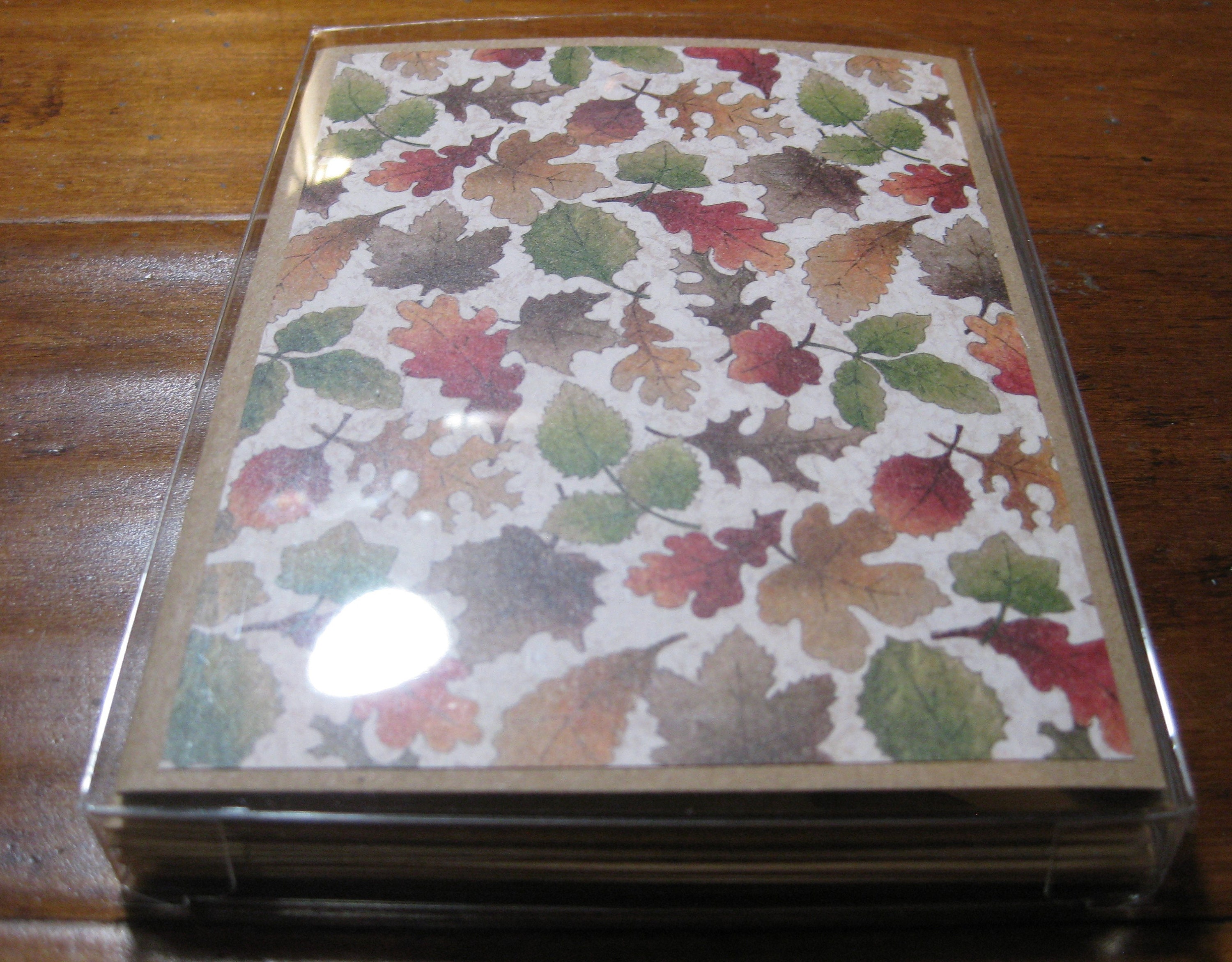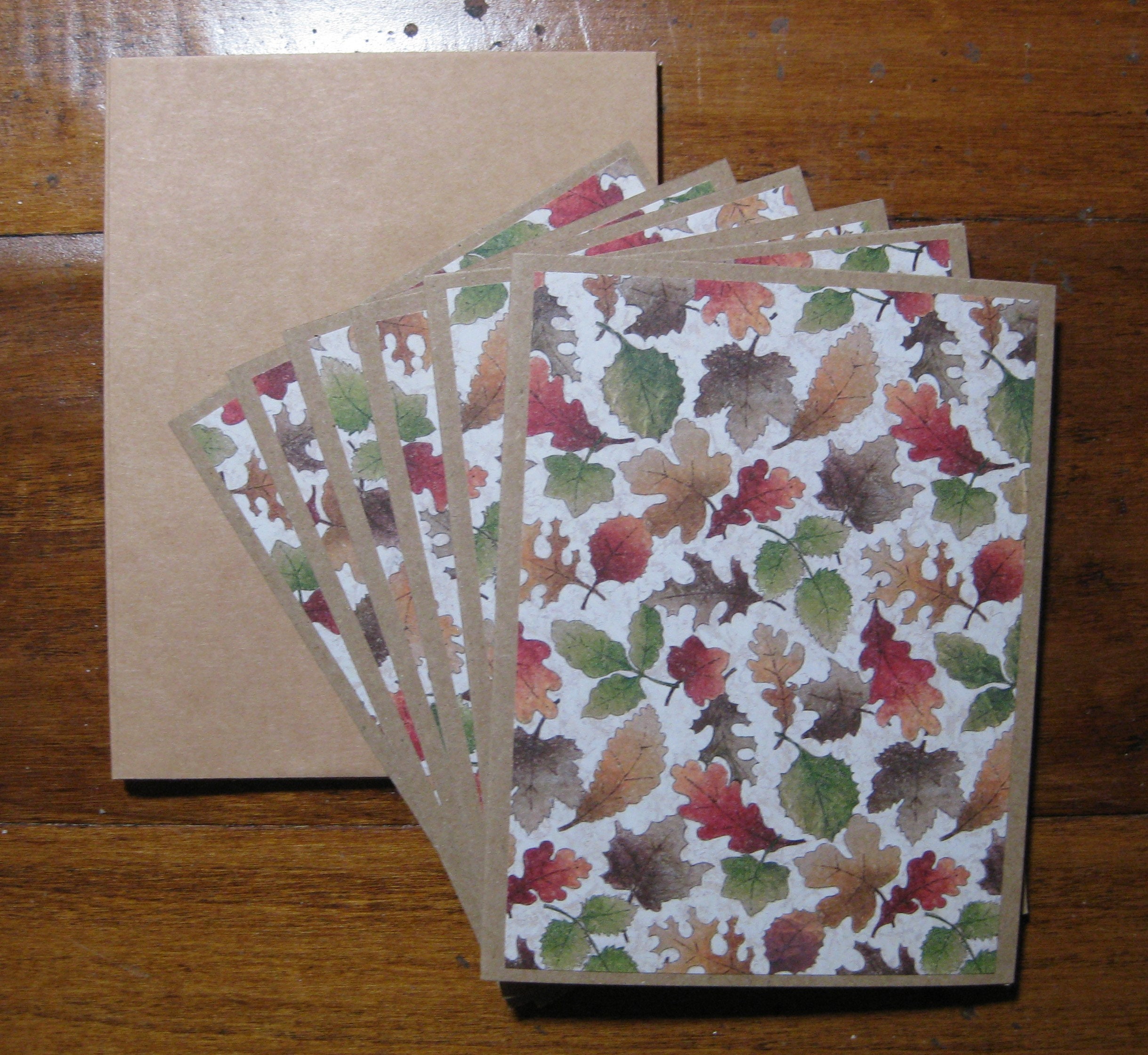 6 Rustic leaves cards and 6 kraft envelopes. Crackle cream background filled with colorful fall leaves. Cardstock is kraft brown.