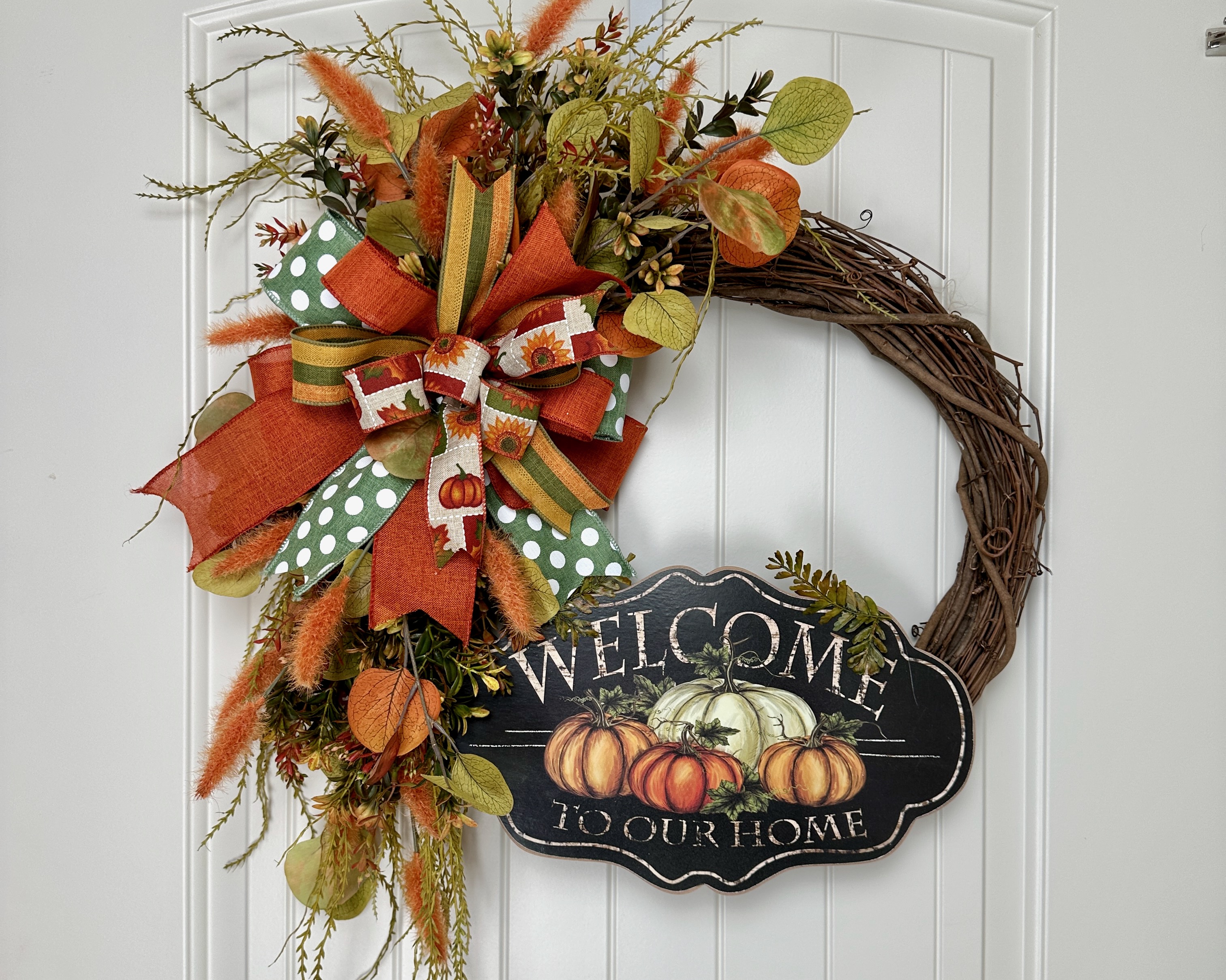 Welcome the autumn season with our beautifully handcrafted fall wreath! The centerpiece is a welcoming sign that reads "Welcome to Our Home," making it a perfect fall addition to your front door or any entryway decor.