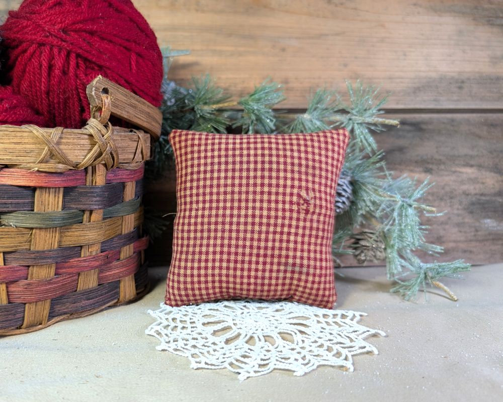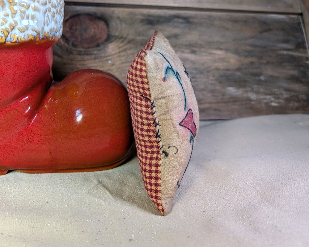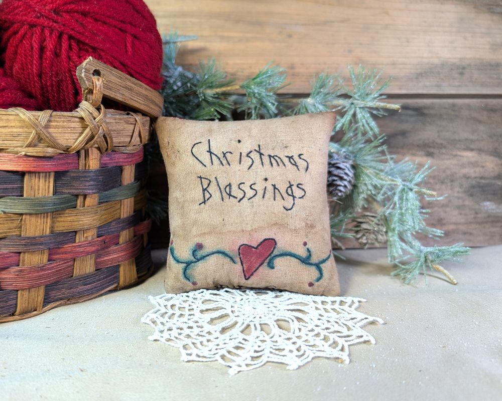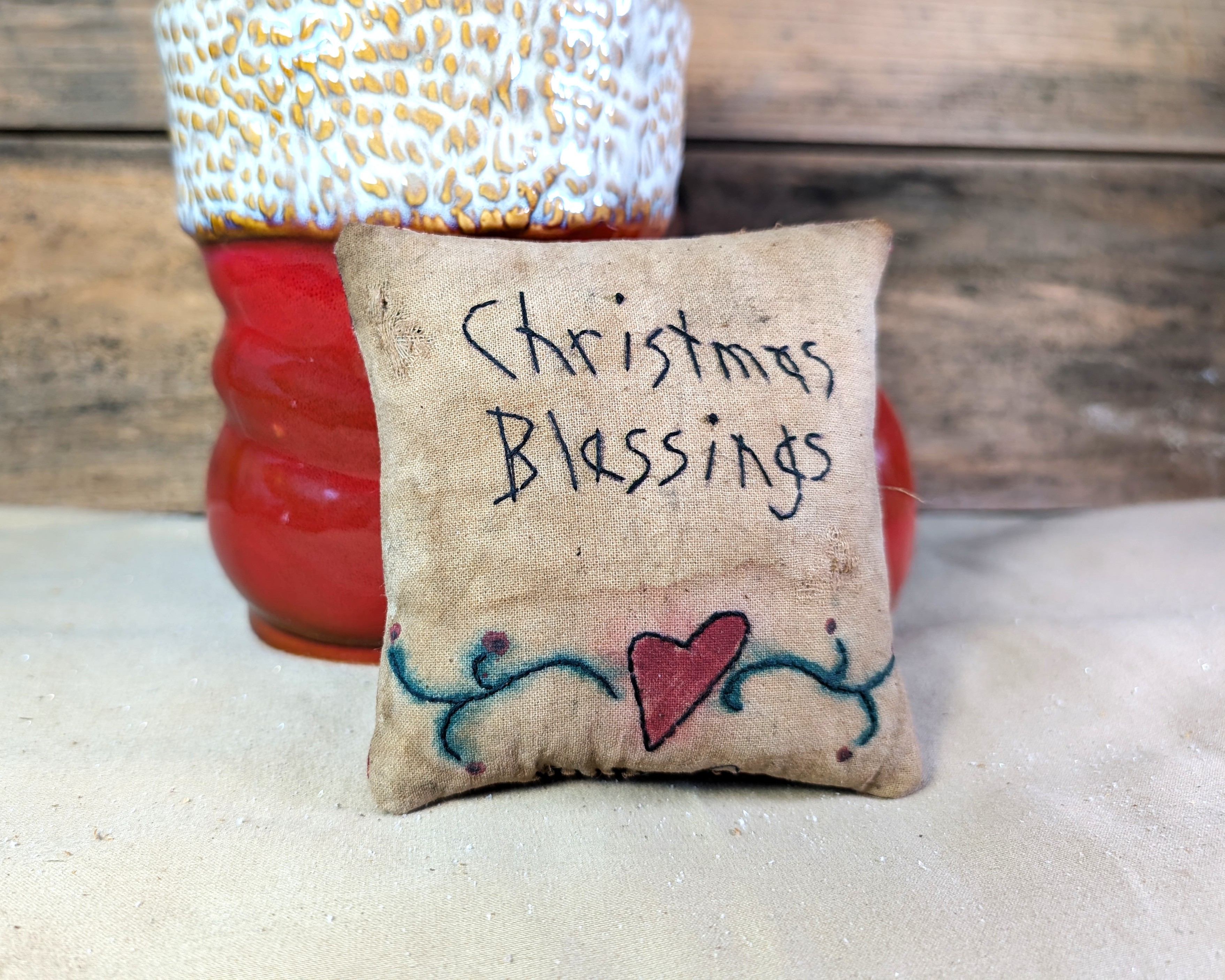 A rustic farmhouse 4-inch mini pillow that is hand stitched to look authentically old and used is sure to bring extra old timey vibes to your Christmas decor. Christmas Blessings is embroidered on the front of the pillow and the back is red and beige gingham homespun fabric. A cute little holiday treasure to display in your home or to give as a stocking stuffer or hostess gift.