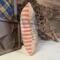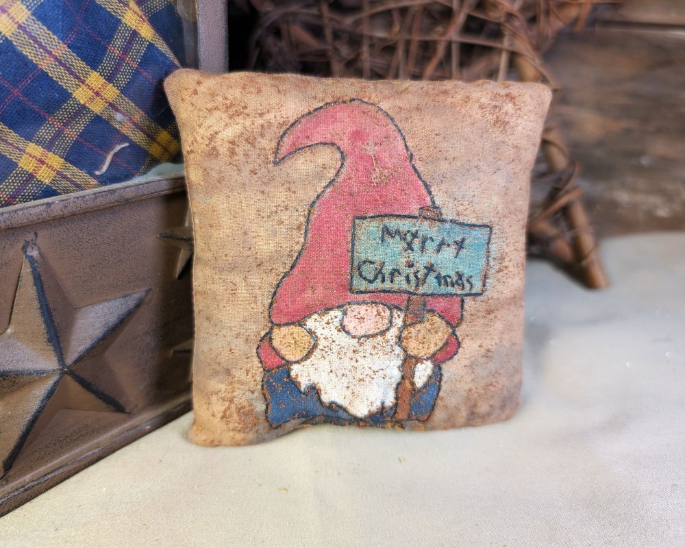 This festive little gnome will add whimsy to your Christmas decor this year. He is sporting a Merry Christmas sign and is wearing the traditional red gnome hat. This 4-inch decor pillow is individually handmade using stained fabric, hand embroidery, and paint to give it a rustic farmhouse look. A light coat of stiffener and cinnamon have been added for extra vintage appeal.