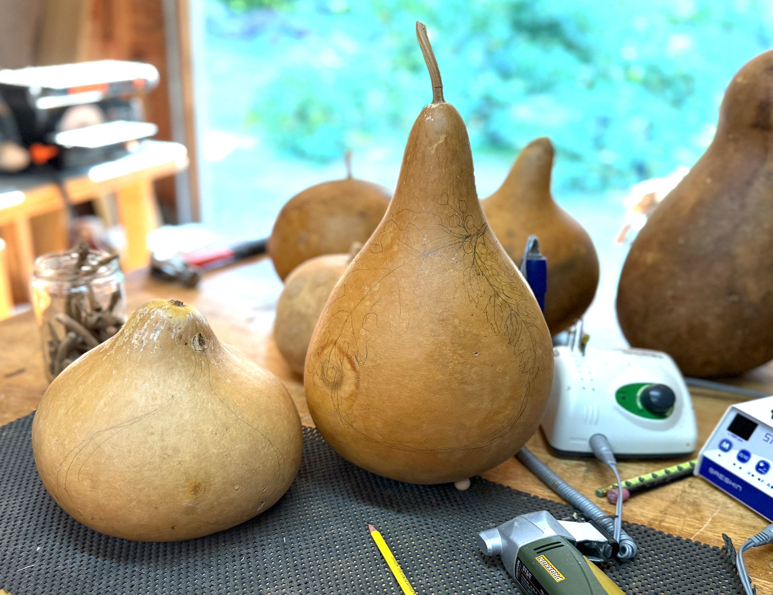 When I discovered the incredibly versatile dried gourds, it was love at first sight! I instantly added them to my creative routine. I've always adored pumpkin carving, and here was a similar natural vegetable that will for many years without the shelf life of a fresh pumpkin. The dried gourd shells are very hard and perfect for carving and pyrography!