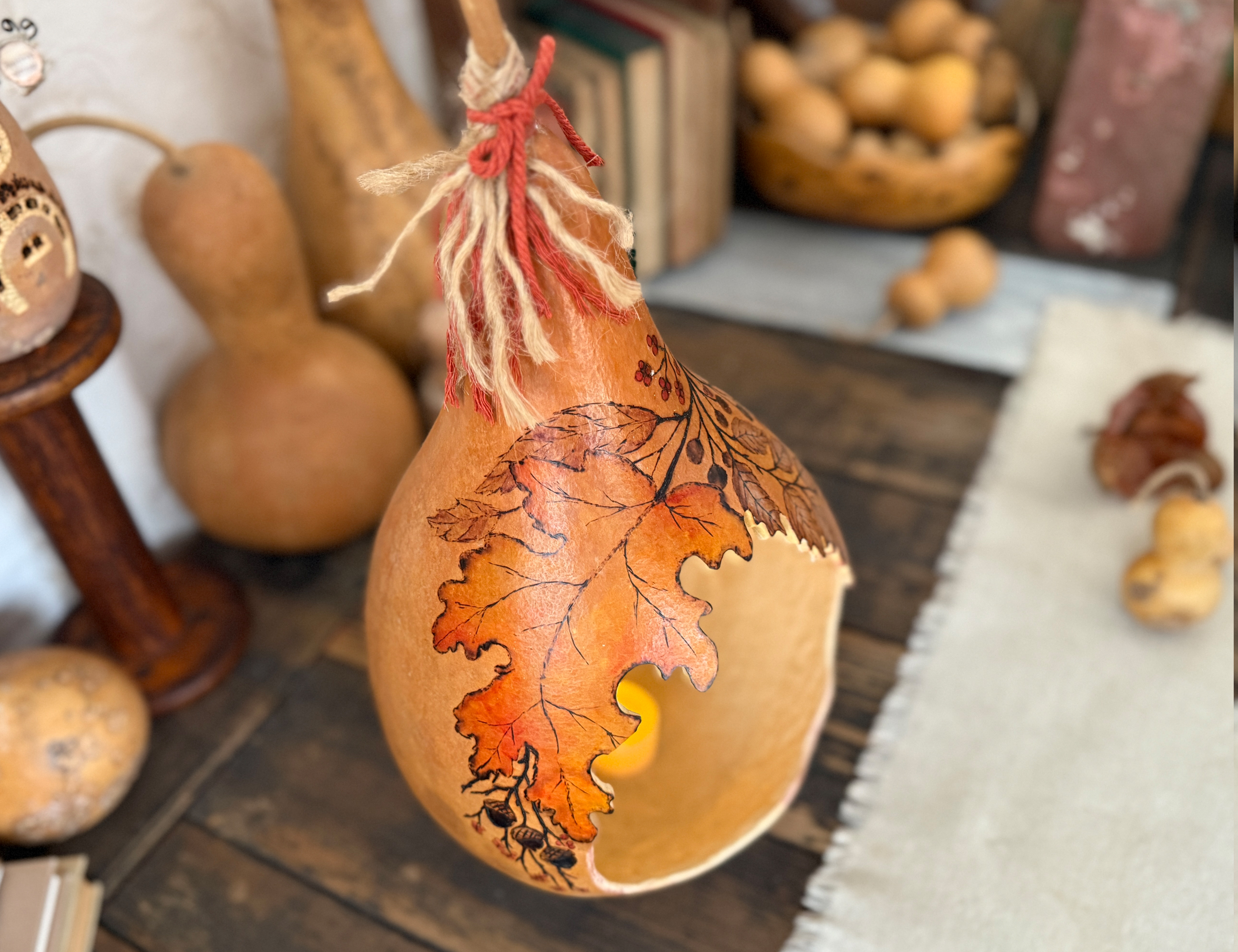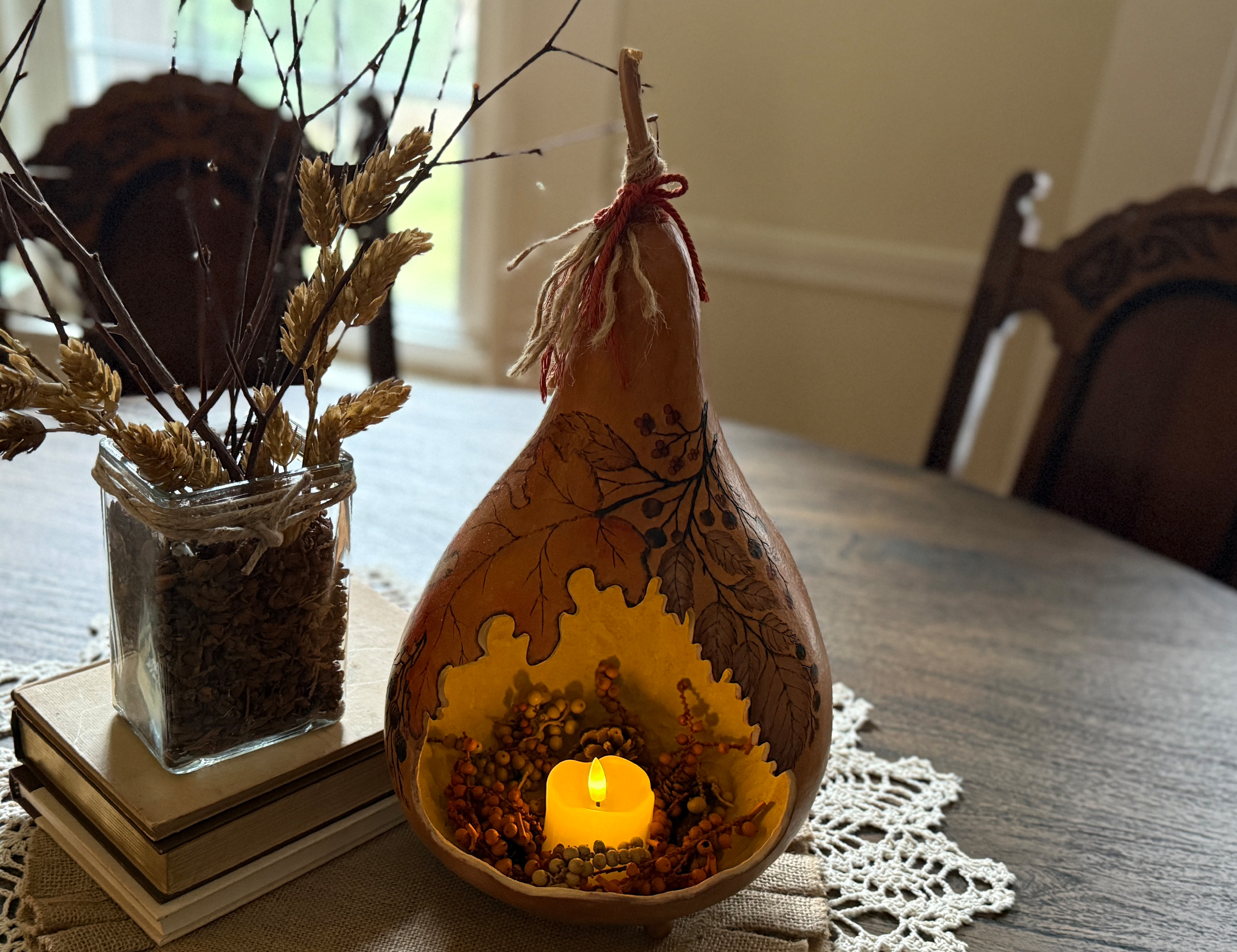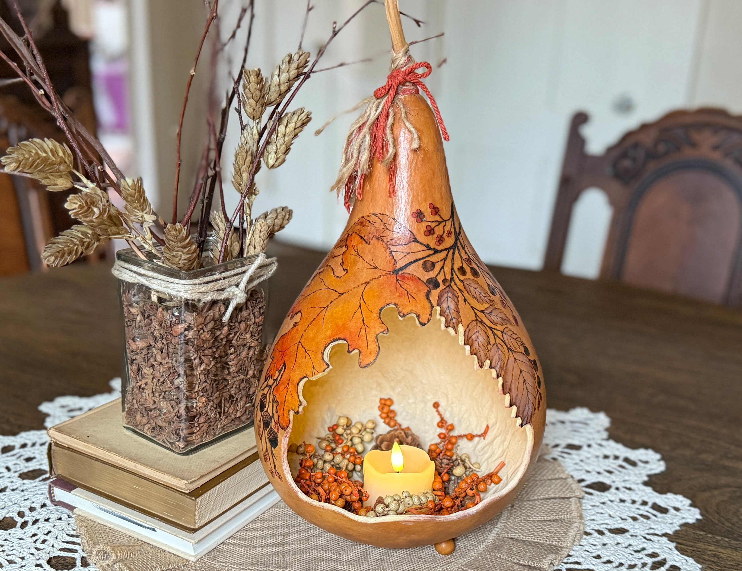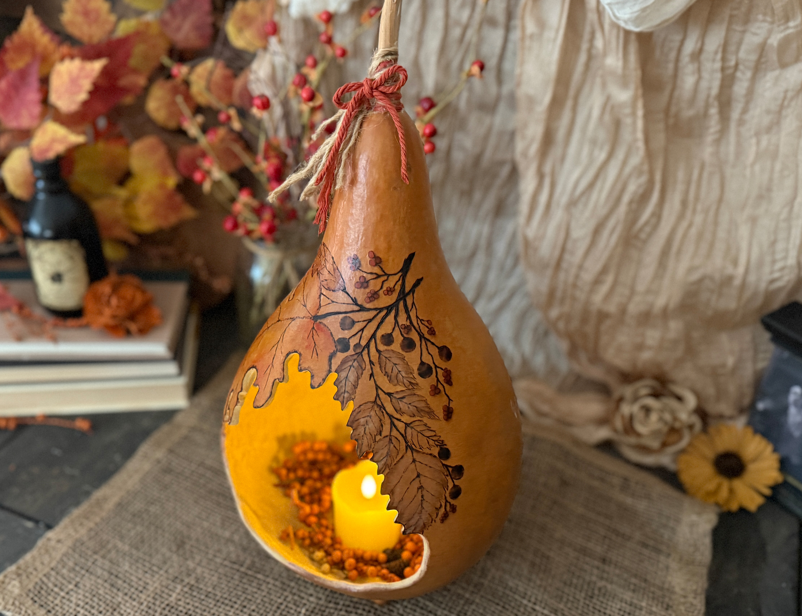 This unique piece is made from a real, naturally dried gourd and transformed into a beautiful rustic luminary. The interior is fully cleaned, stippled for texture, and hand-painted to enhance the gentle candlelight. The exterior features detailed pyrography foliage artwork, giving it a pencil-sketched botanical look. Transparent stains in warm autumn tones highlight the natural gourd shell and enhance its organic character.