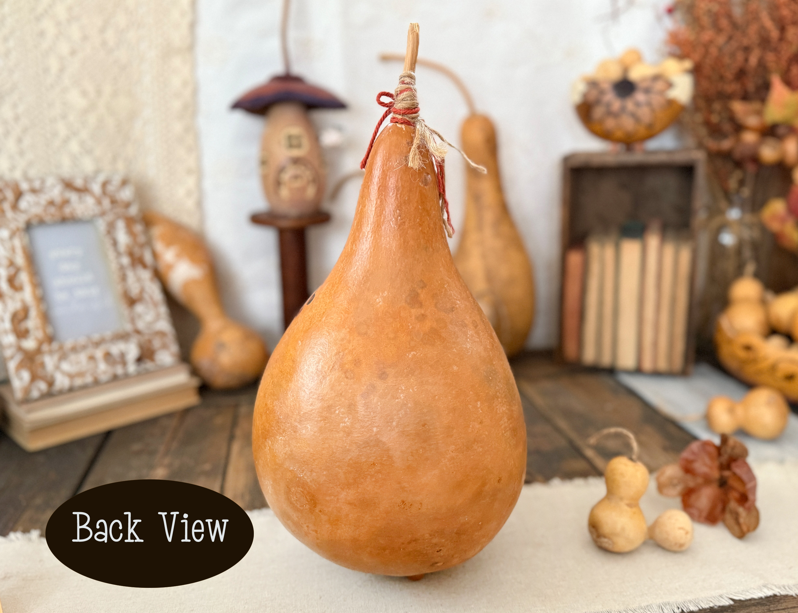 4. Can I name my gourd? Sure! If you would like to name a gourd just let me know. This would fall into a custom piece, so I would just need a week or so to create this gourd for you.