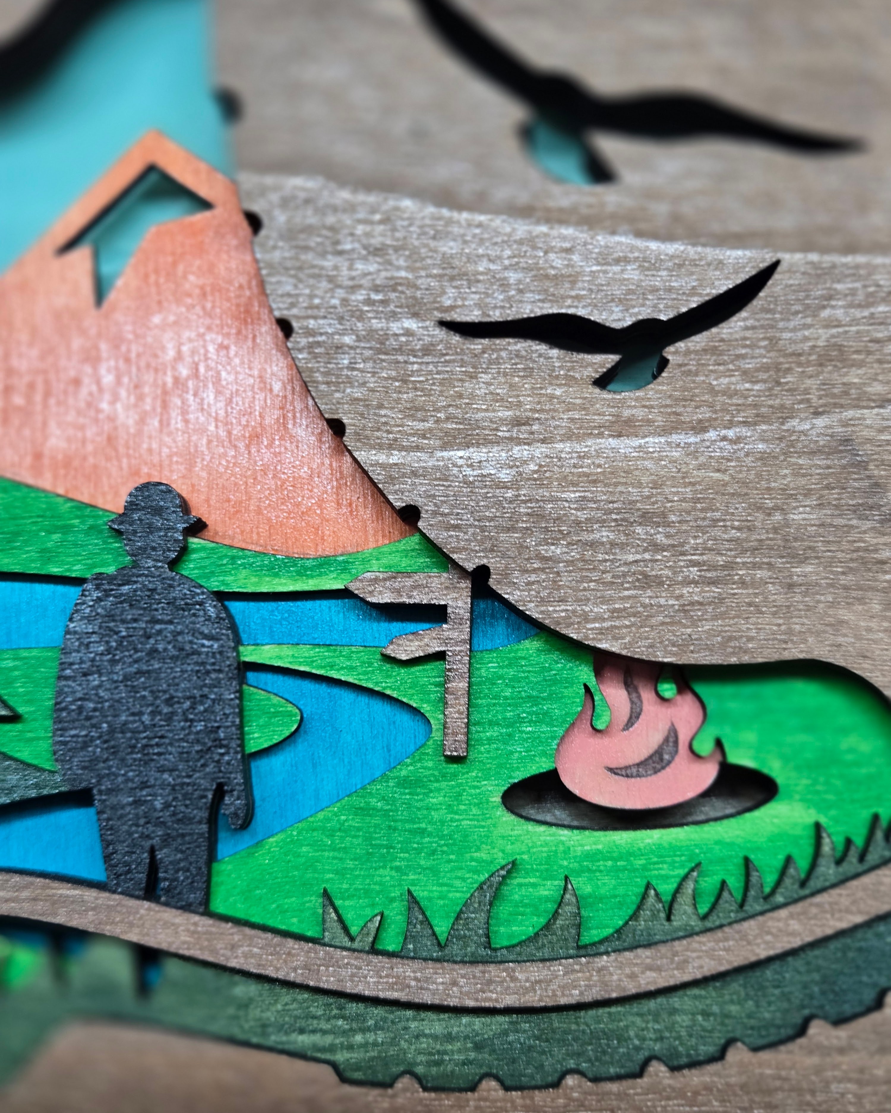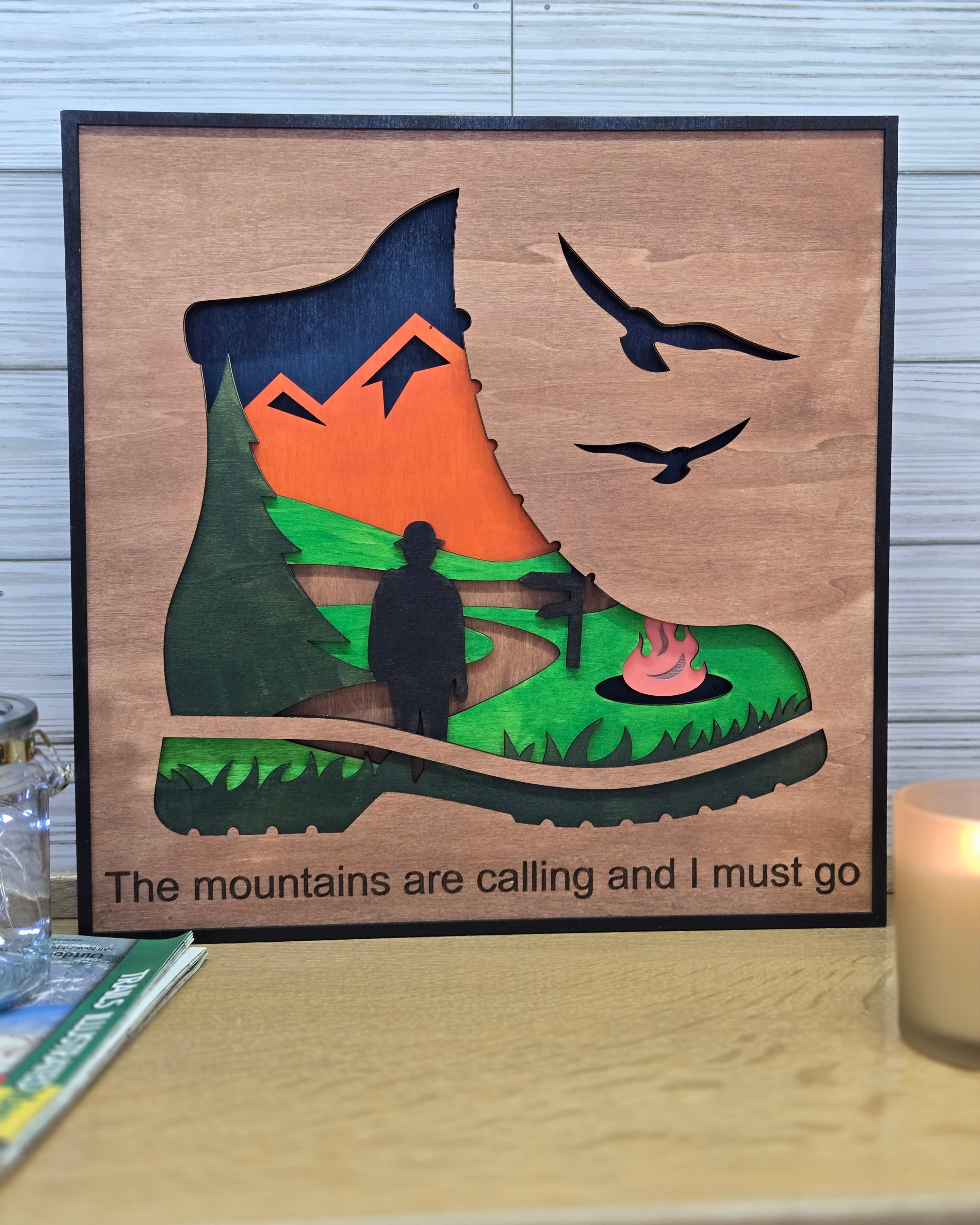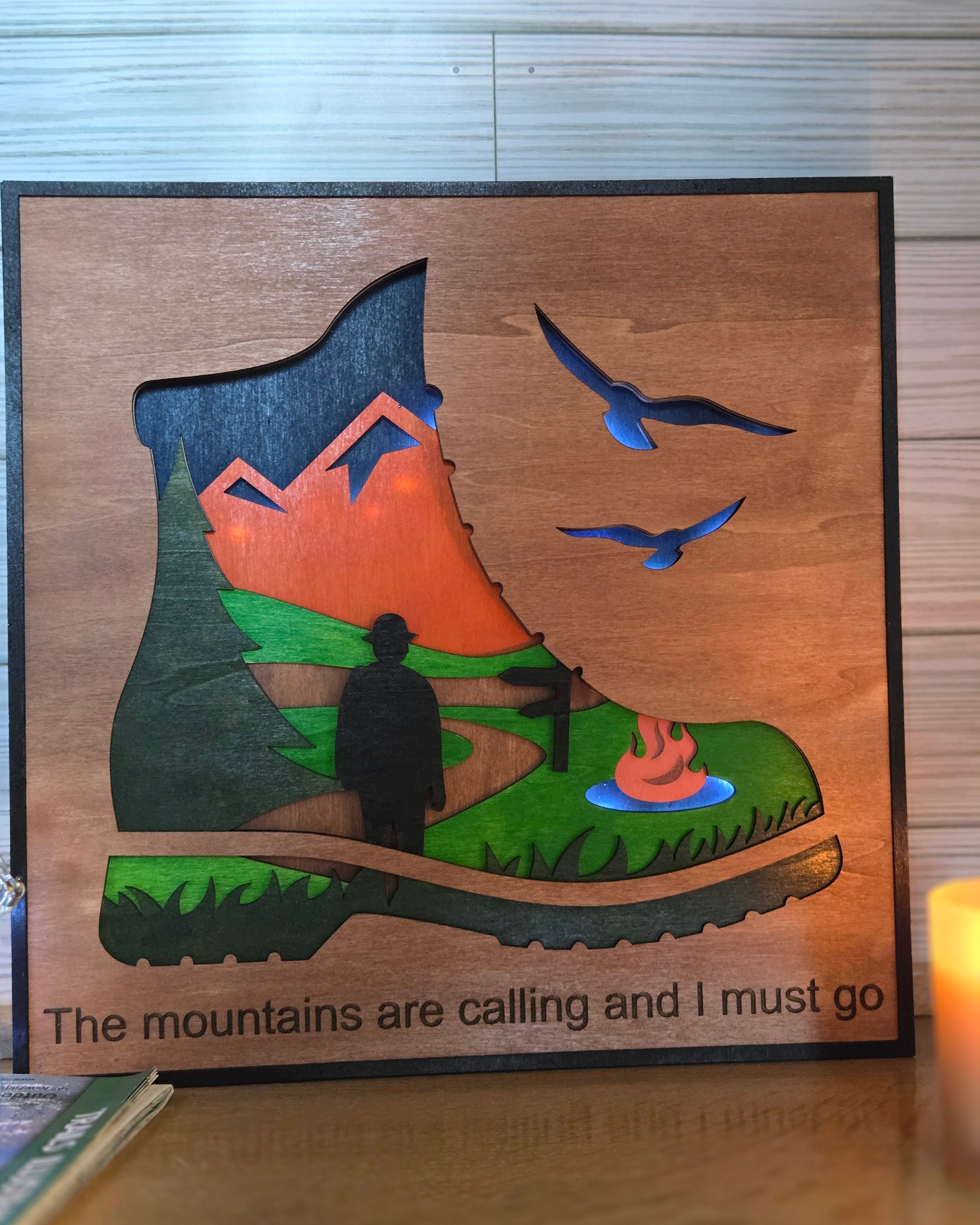 Bring the spirit of adventure home with this laser-cut layered wood shadow box featuring a hiking boot cutout and the inspiring phrase, “The mountains are calling and I must go.” A hiker on a mountain trail is beautifully illuminated by LED fairy lights layered behind the scene, creating a cozy, glowing depth.