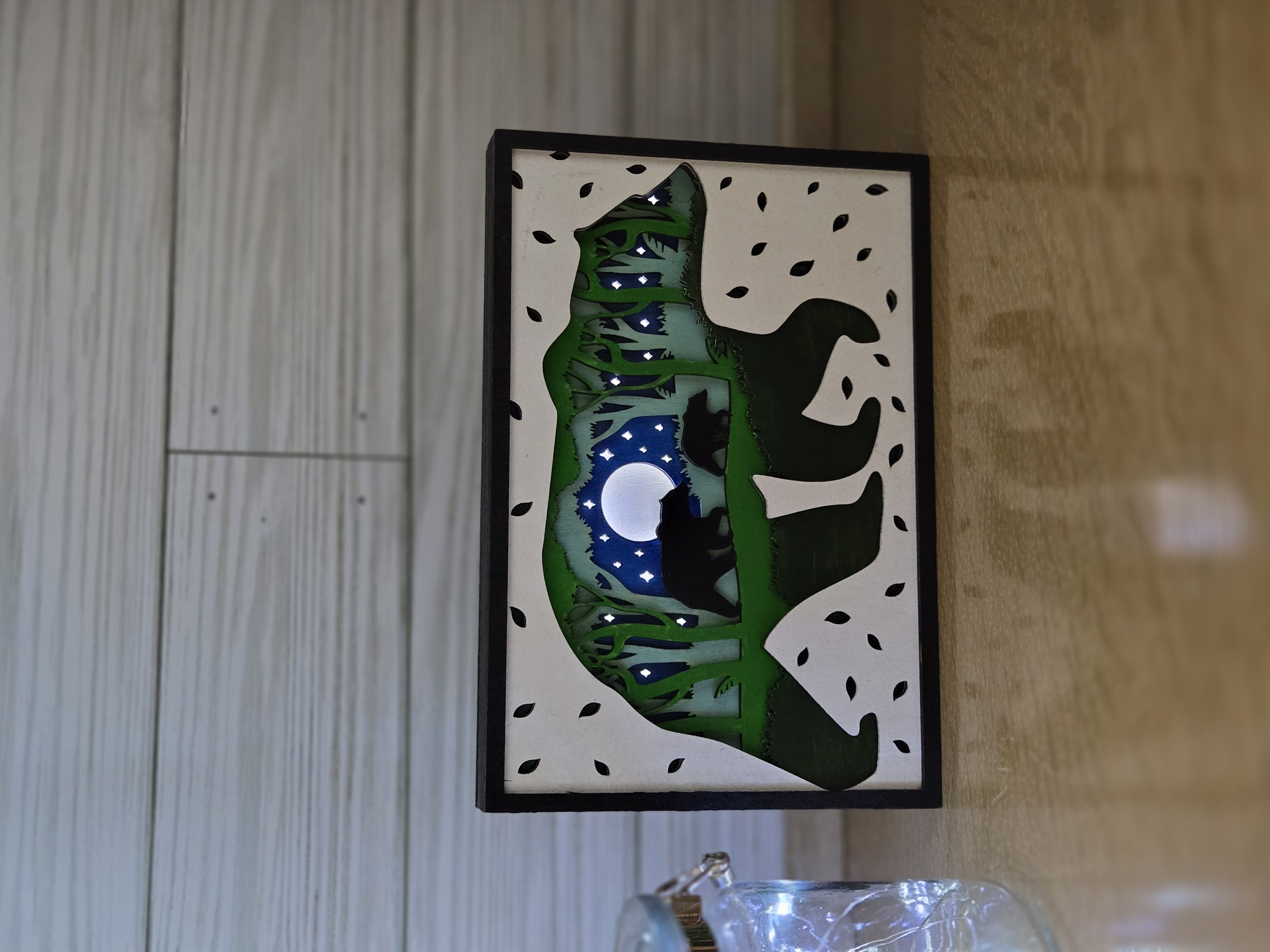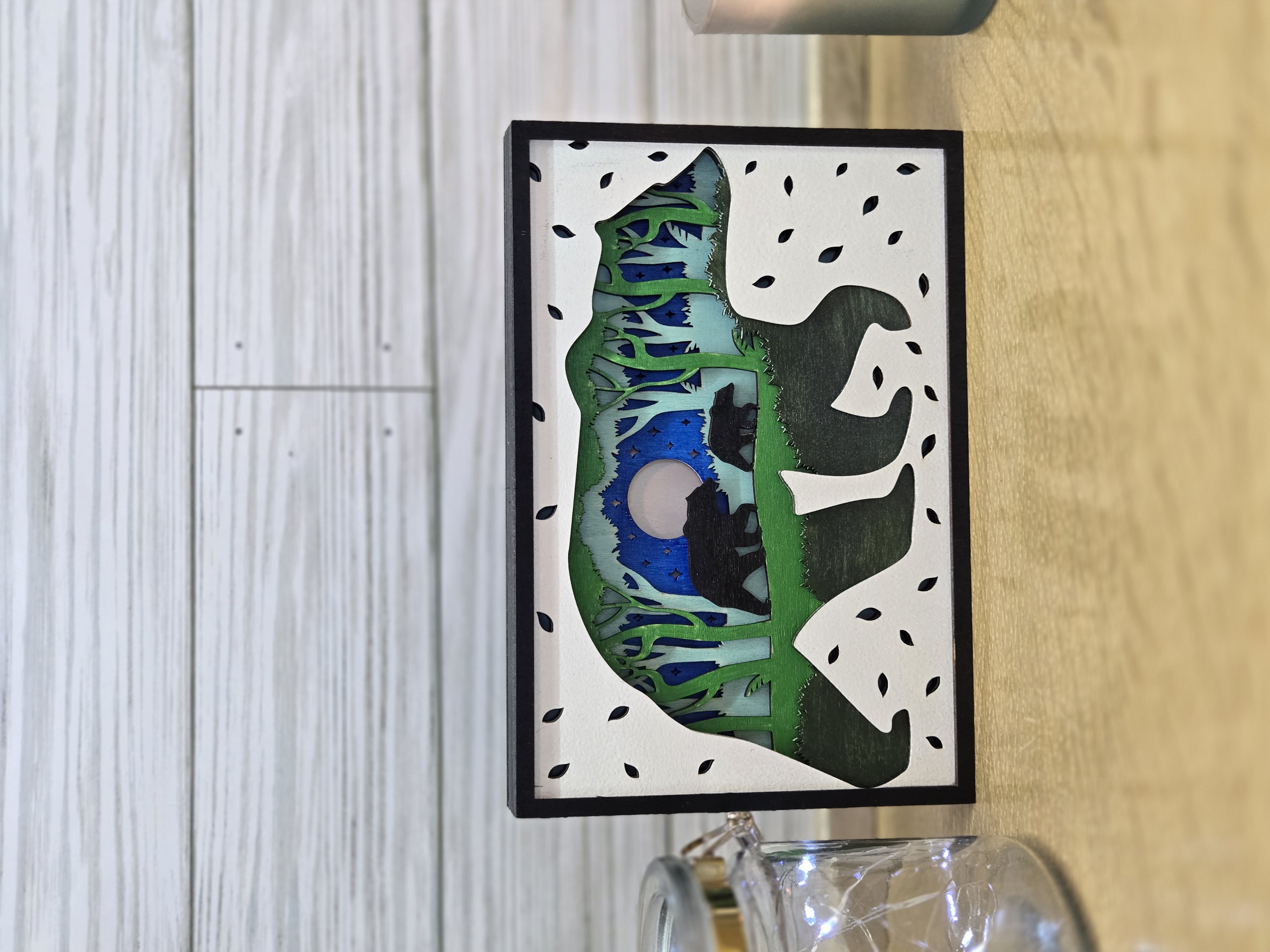 Bring the heartwarming beauty of nature into your home with this laser-cut layered wood wall or shelf decor featuring a bear and cub silhouette in a peaceful forest setting. Designed with multiple layers for a stunning 3D effect, this handcrafted piece adds warmth and depth to any space.