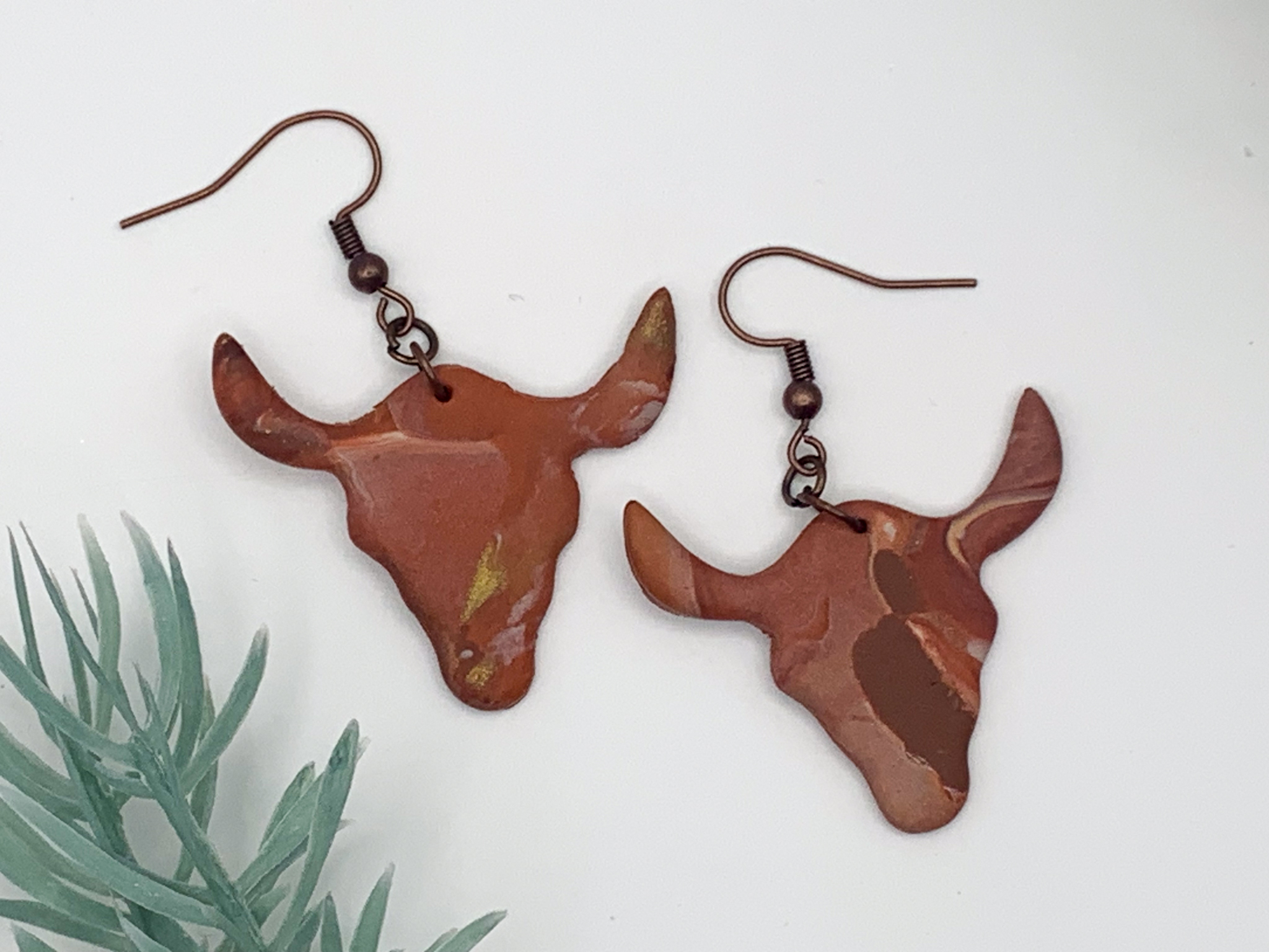 Western vibes with a modern twist! These marbled clay longhorn earrings in earthy tones are perfect for country-chic fashion lovers.