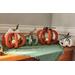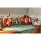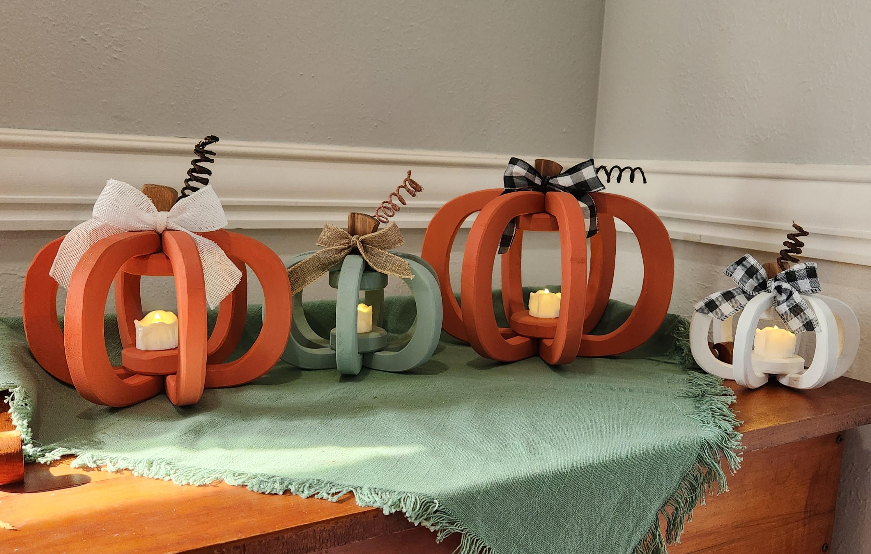 Made from pine or poplar, each pumpkin spine, base, and stem are cut and shaped individually before painted and assembled, then sealed with acrylic finish. Grapevine wire is used for the stem tendril, and jute wired bow help complete this simple rustic design.
