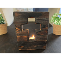 Add warmth and charm to your space with this handmade rustic tealight holder, crafted from reclaimed wood and finished in a rich dark walnut stain. Whether you're creating a cozy atmosphere in your home or searching for the perfect farmhouse-style gift, this 9.5-inch wooden candle holder is a timeless addition to any space.