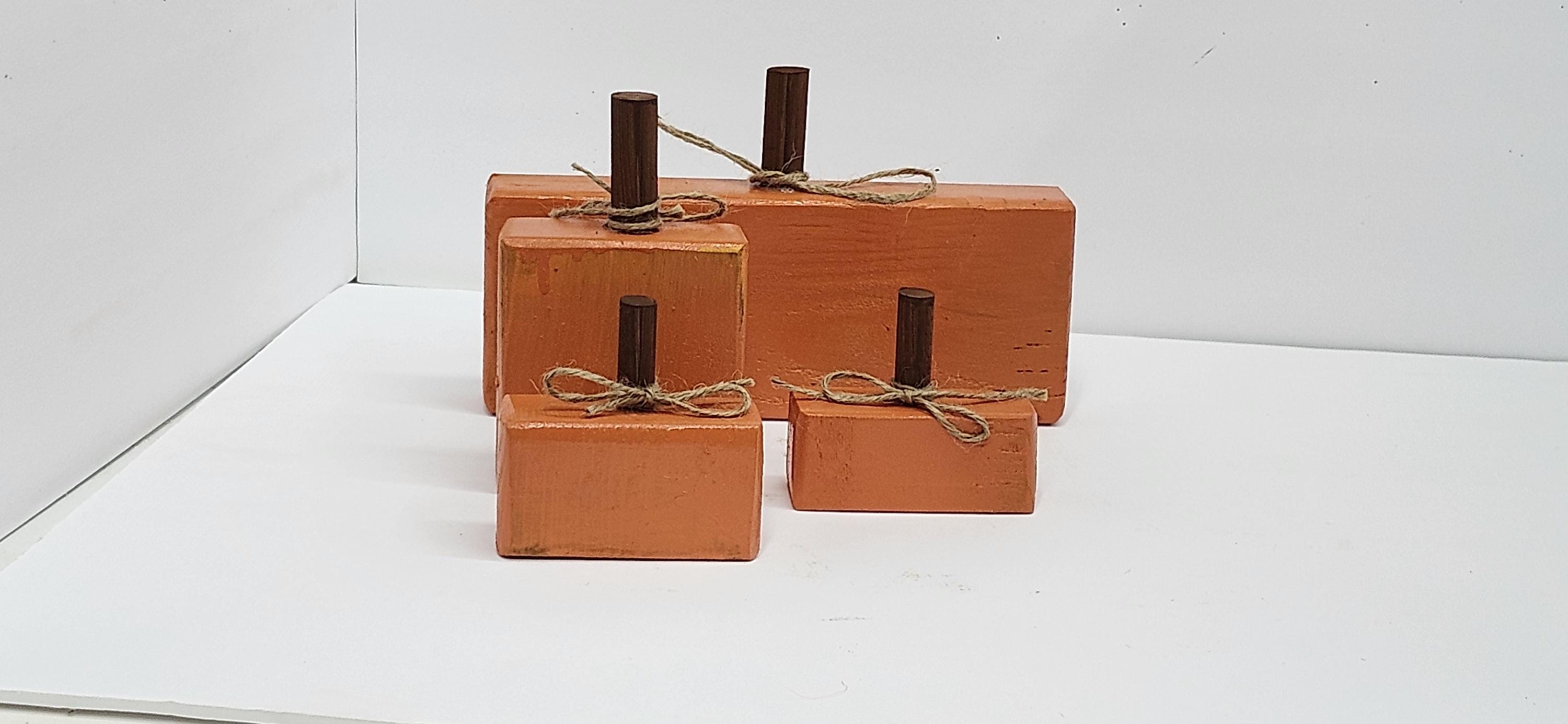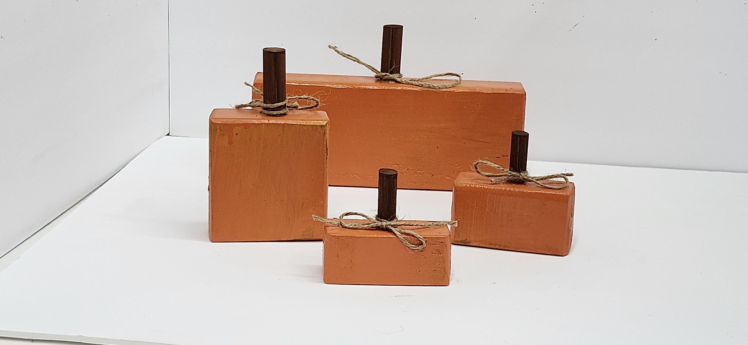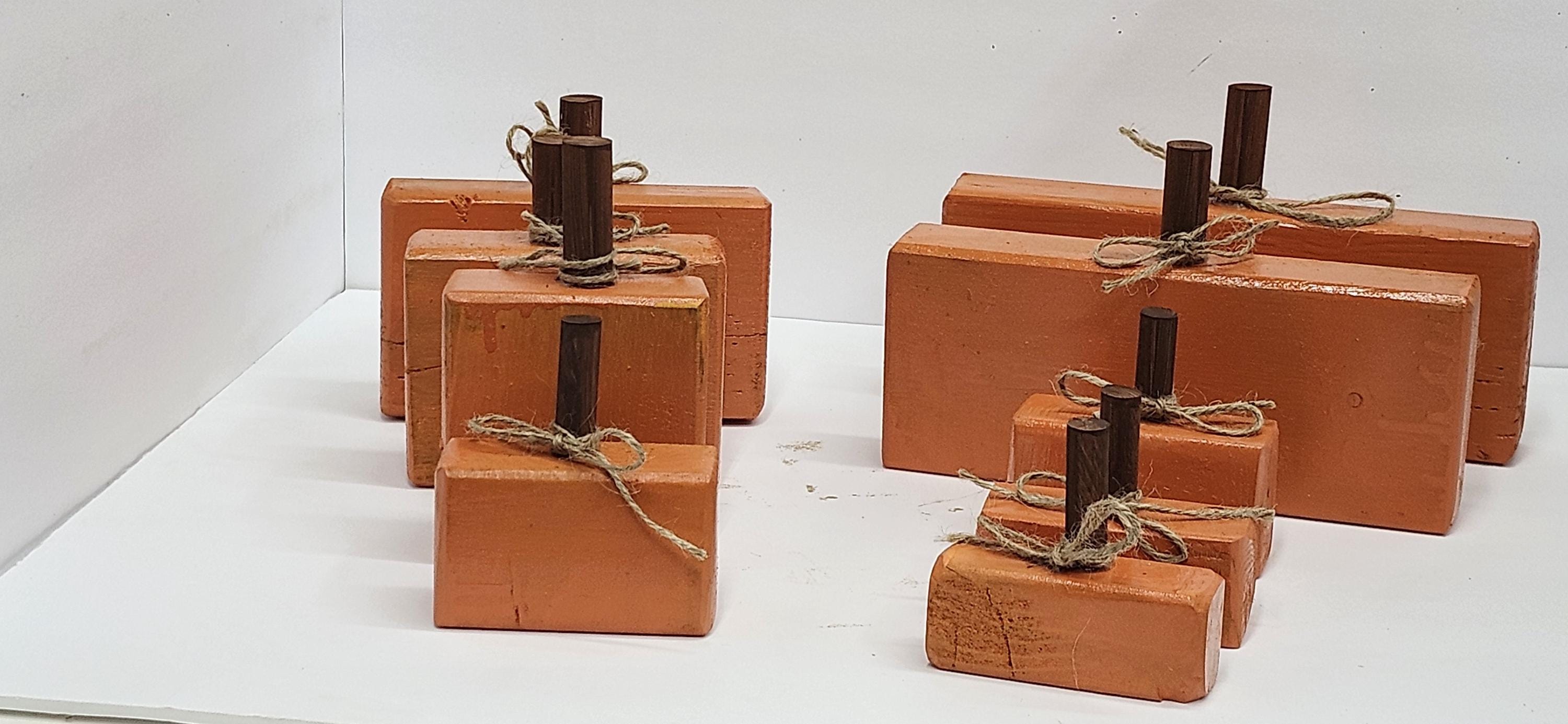 These scrap Wood Pumpkins are made from a variety of construction grade lumber left over or reclaimed from the scrap heap.