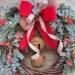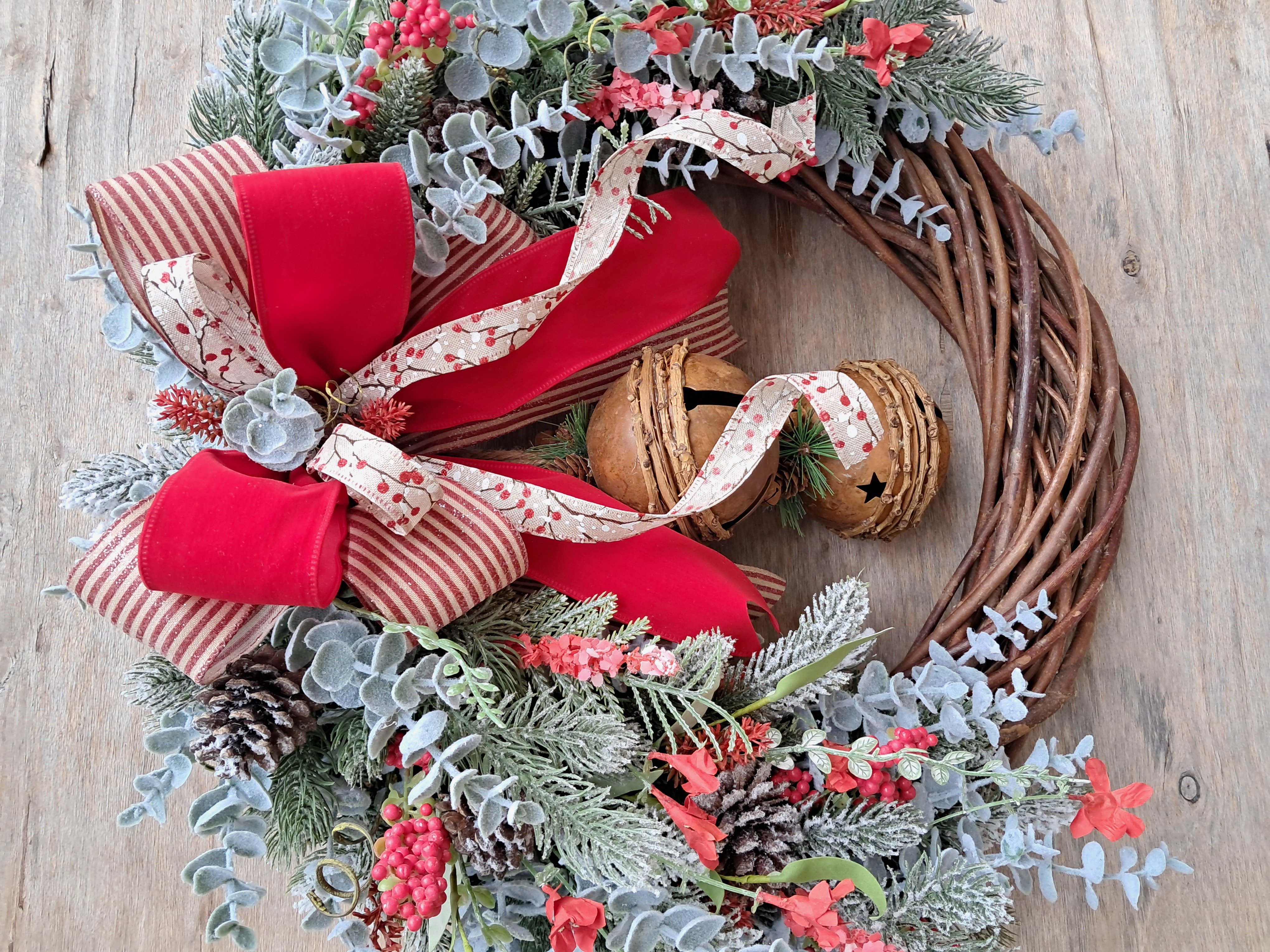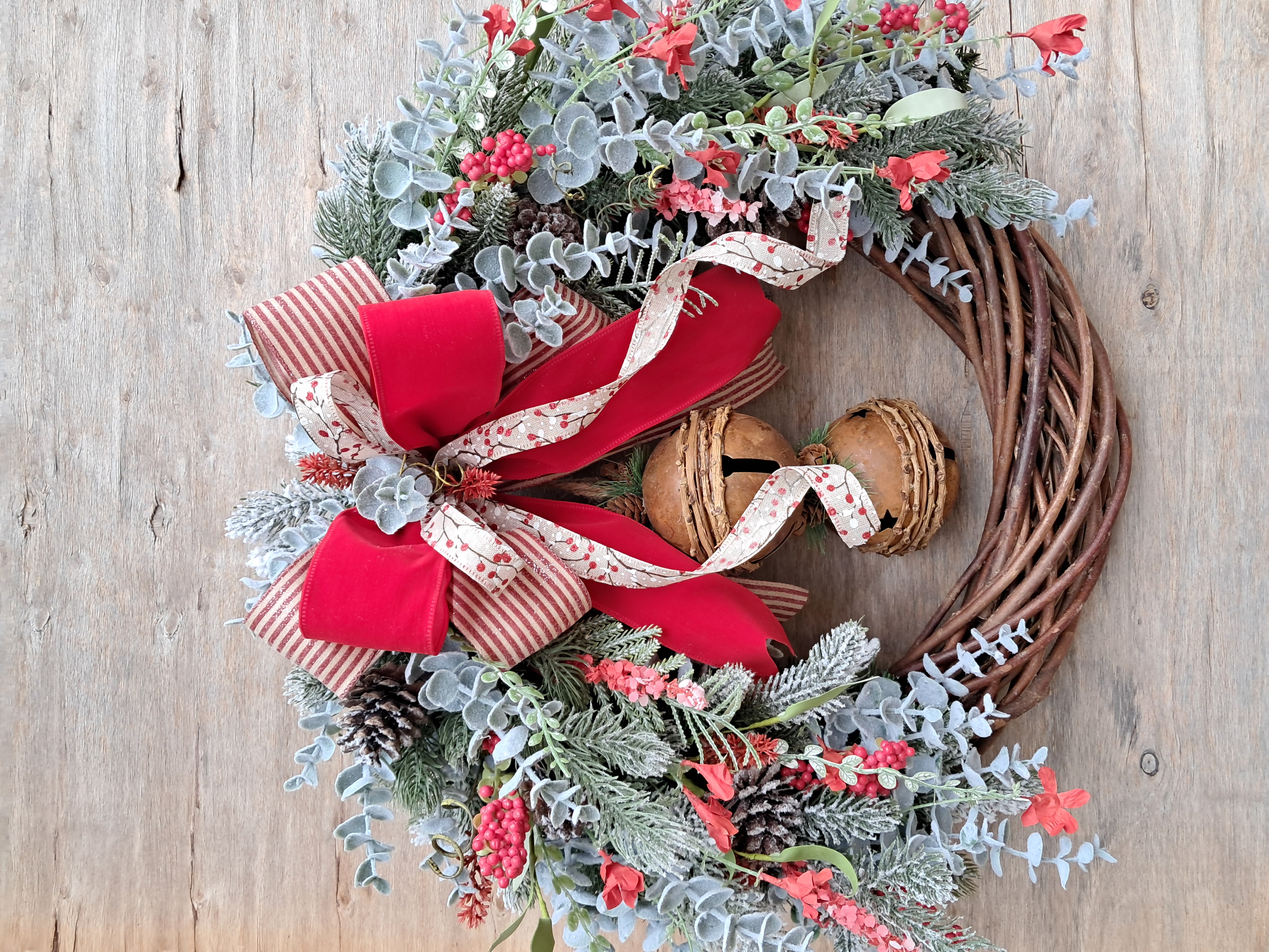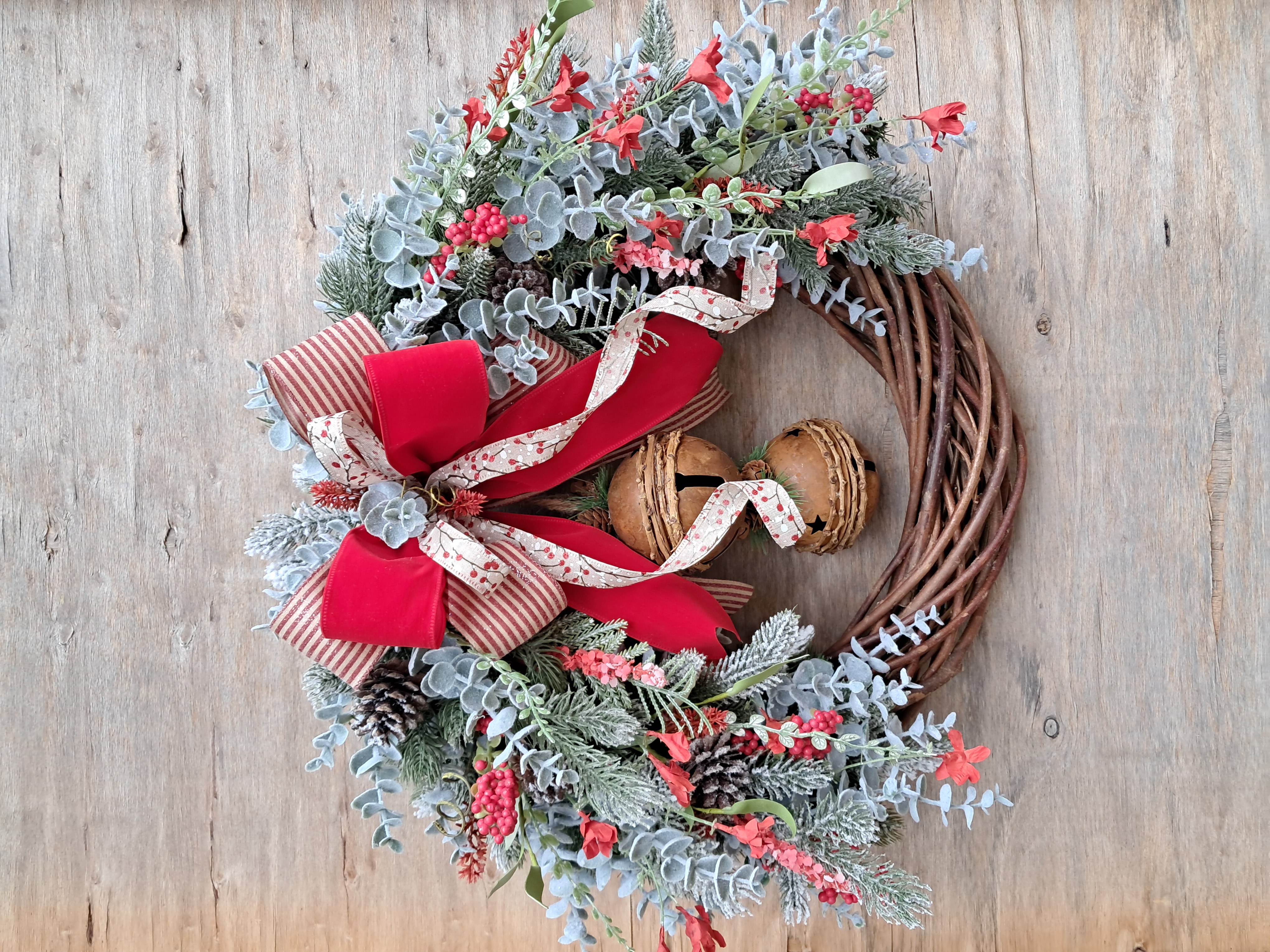 Add a touch of rustic elegance to your winter decor with our stunning Rustic Willow Holiday Wreath. Handcrafted on a natural willow base, this wreath is a harmonious blend of flocked cedar, frosted eucalyptus, rustic pine cones, vibrant red berries, and delicate heather that frame a pair of rustic bells. Atop it all, a luxurious sparkly and velvety bow adds a dash of sophistication, making it a perfect statement piece for your Christmas decor.