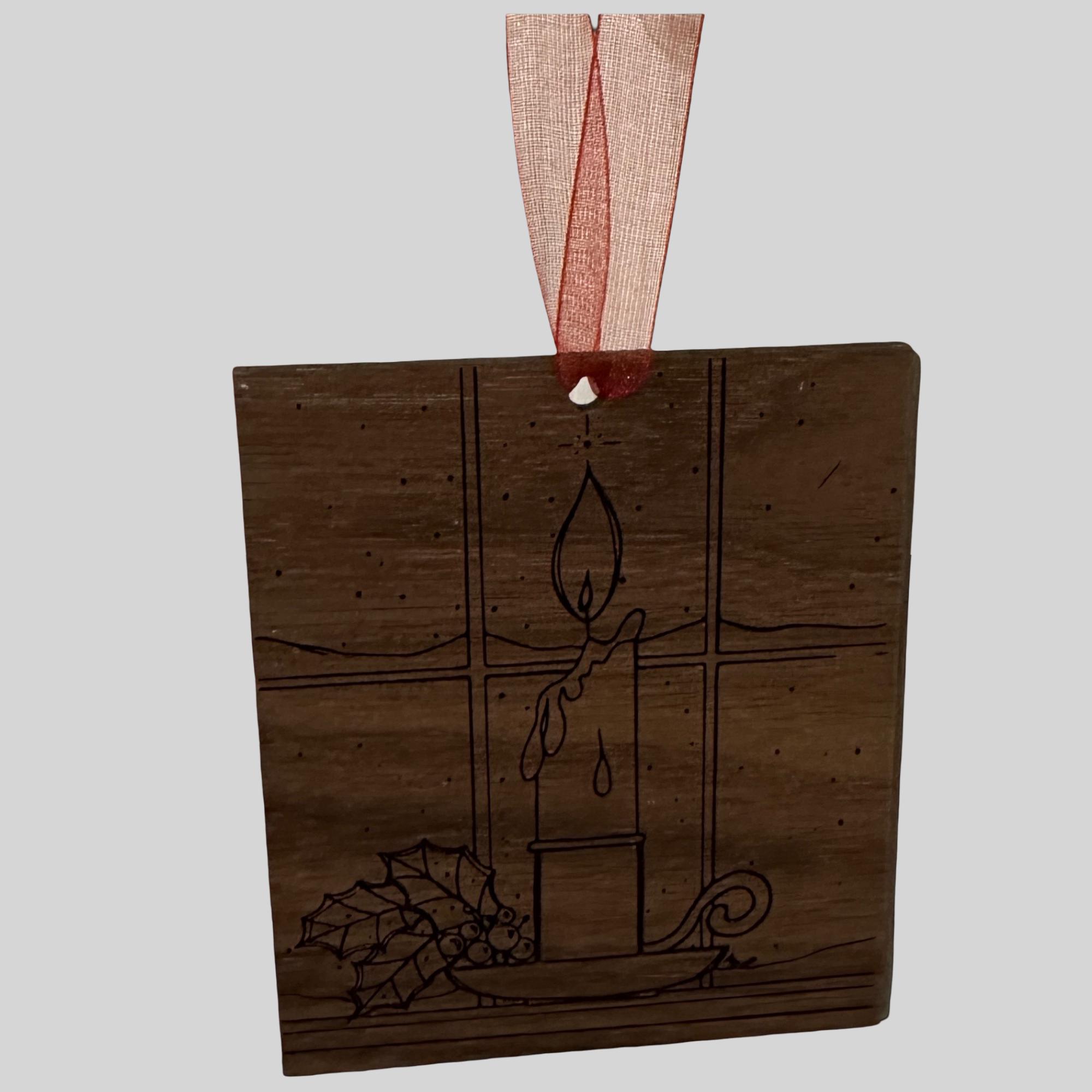 These are laser cut lightweight wood ornaments. They are made from 1/8 in thick medium walnut plywood. There is no design on the back. They vary in size. Sizes are in length only. Sizes are listed in the menu. They have a ribbon or twine for hanging. The different designs are available in the drop down menu.