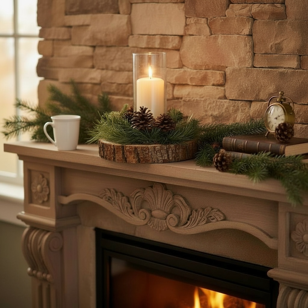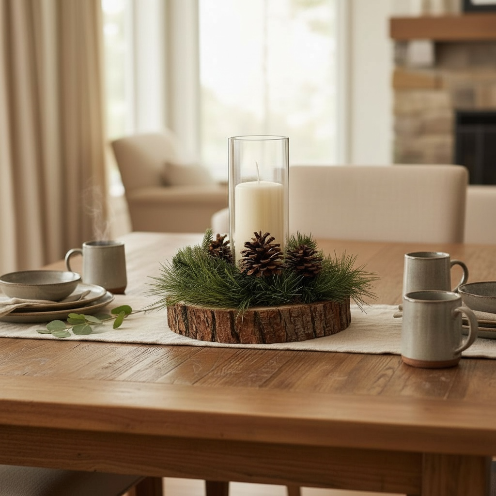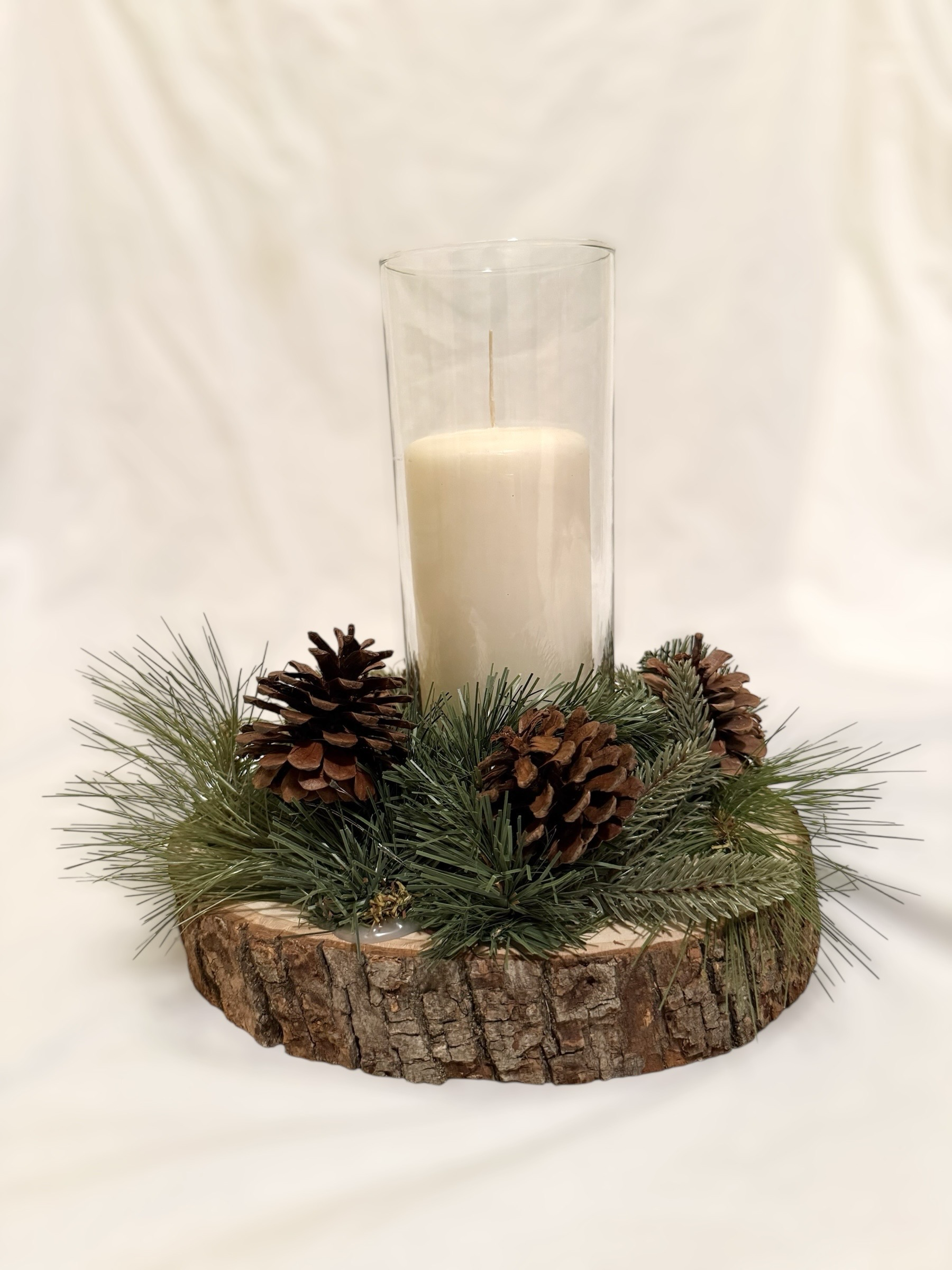 Add warmth, charm, and natural beauty to your home or special event with this handcrafted rustic wood slice candle centerpiece. Designed with a natural wood base, pine greenery, and pinecones, this piece brings a cozy farmhouse feel that blends beautifully with both everyday decor and special occasions.