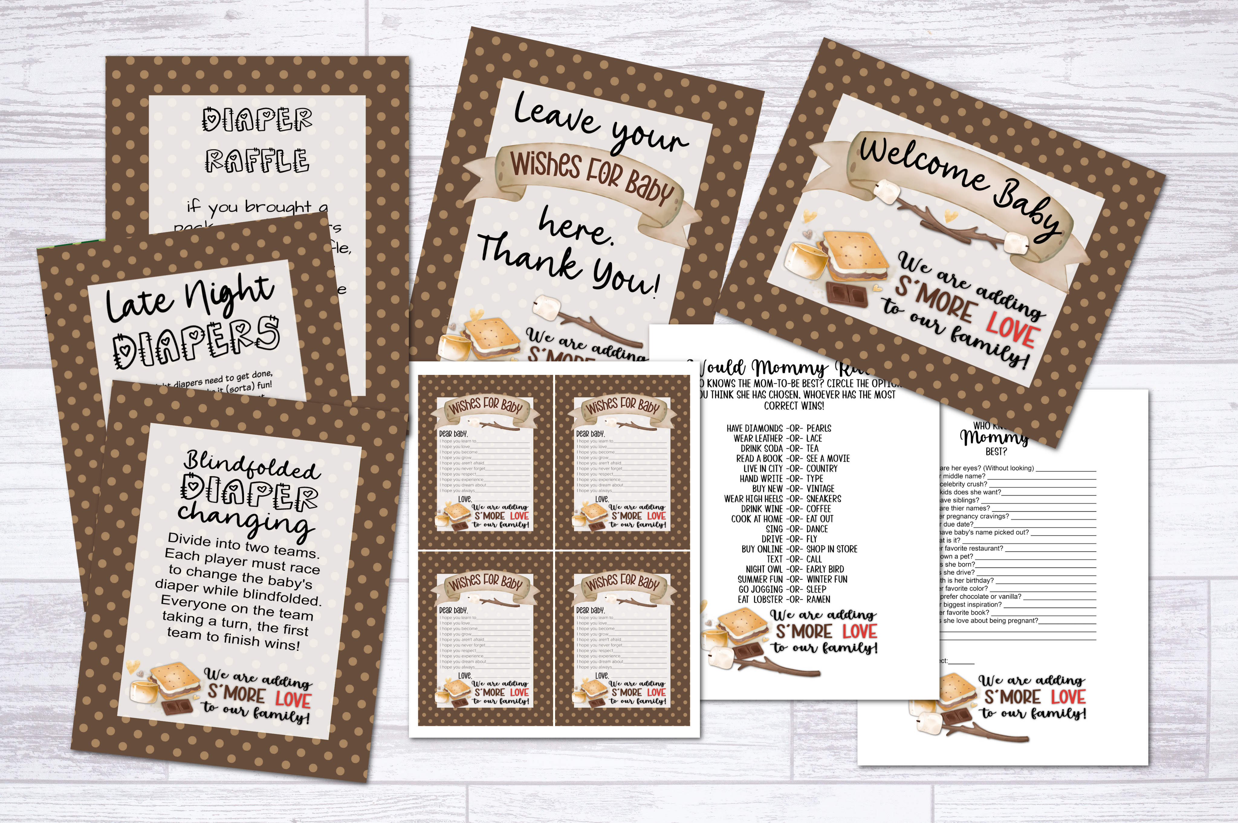 This set includes games and signs for your "Adding S'more love to our family" baby shower! *PLEASE NOTE* This is a digital download product, and no physical item will be shipped to you. Simply purchase, download and print. You can print at home or at a print shop. Images are 300dpi. For best results print on 8.5x11 semi-gloss cardstock.