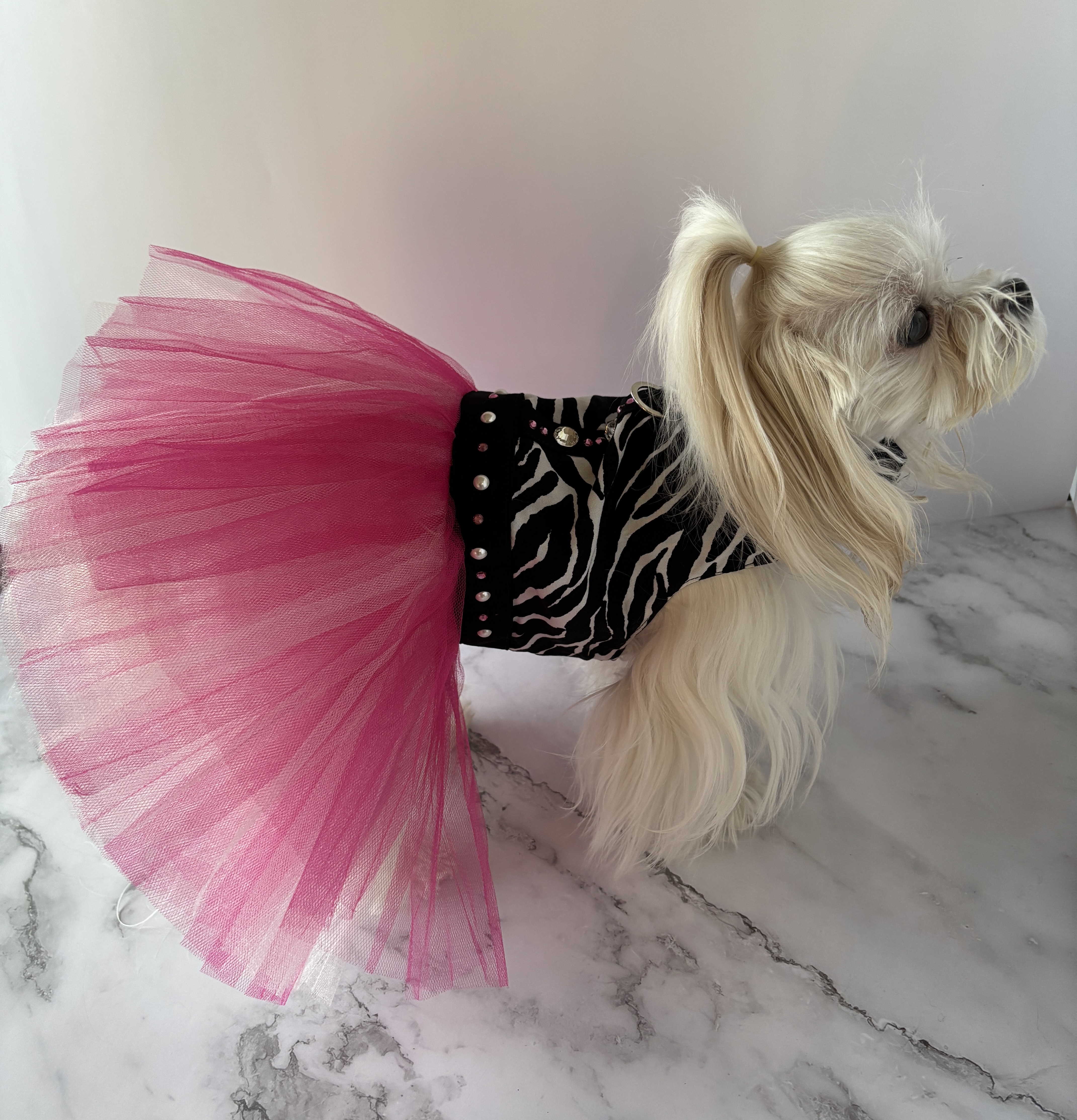 The harness is so fun and playful, and would be perfect to wear anywhere. It has a solid cast D-ring to use for a leash. I made this using pearls and pure Austrian Crystals (I can no longer use the name brand of the crystals because I am no longer a brand partner with them), and they are stunning and capture the light so beautifully.