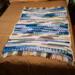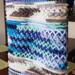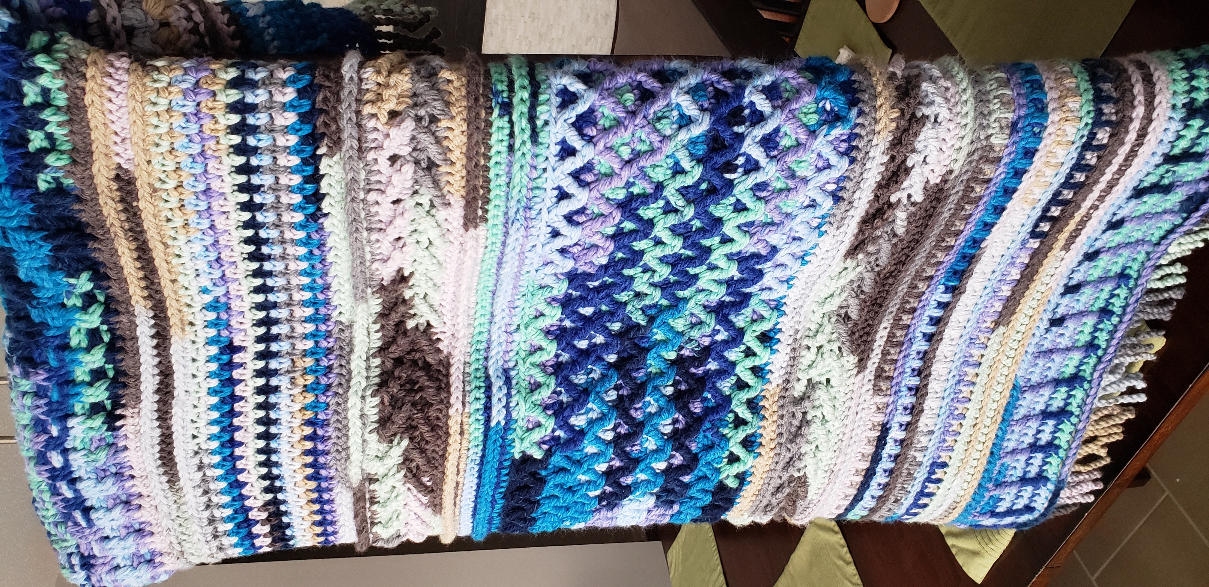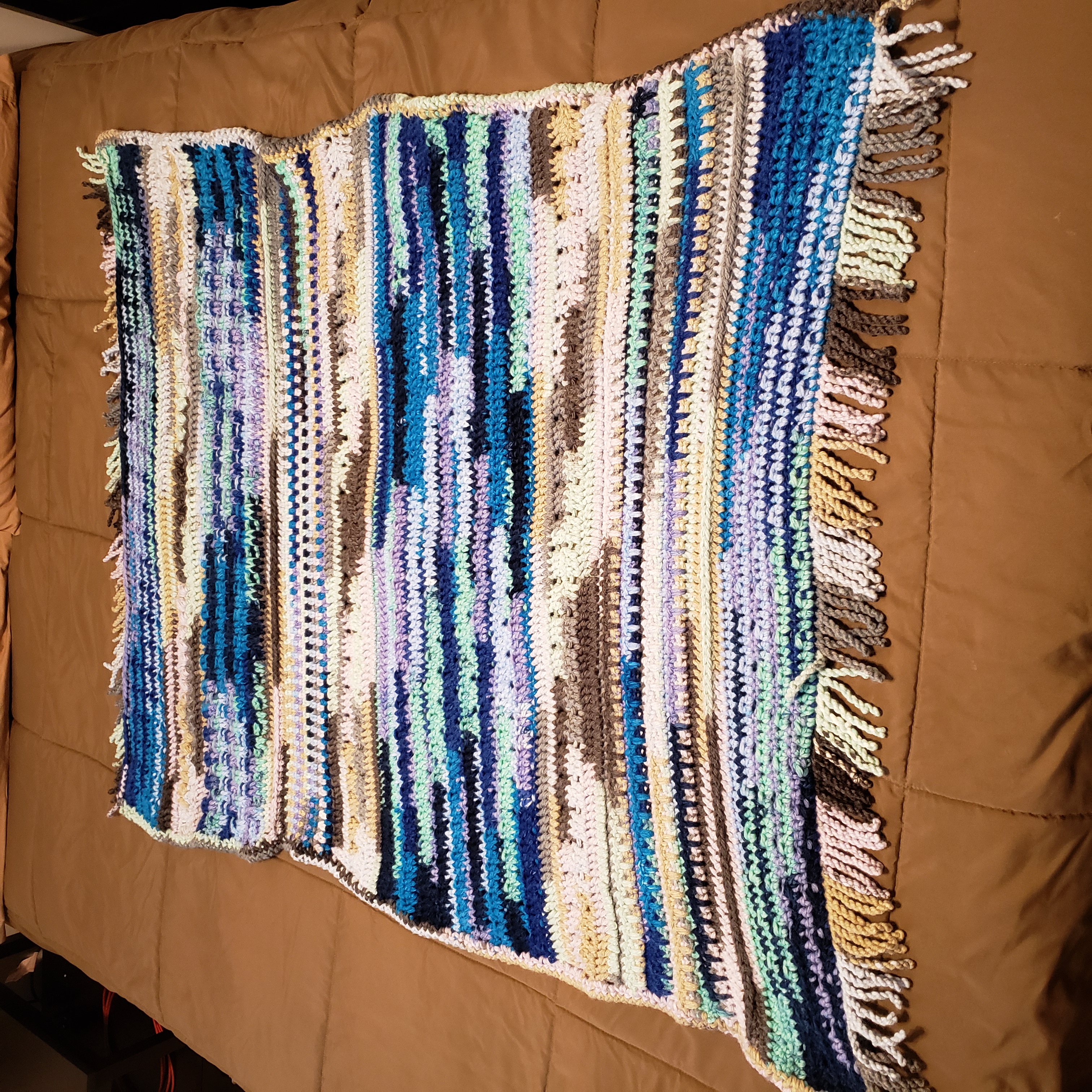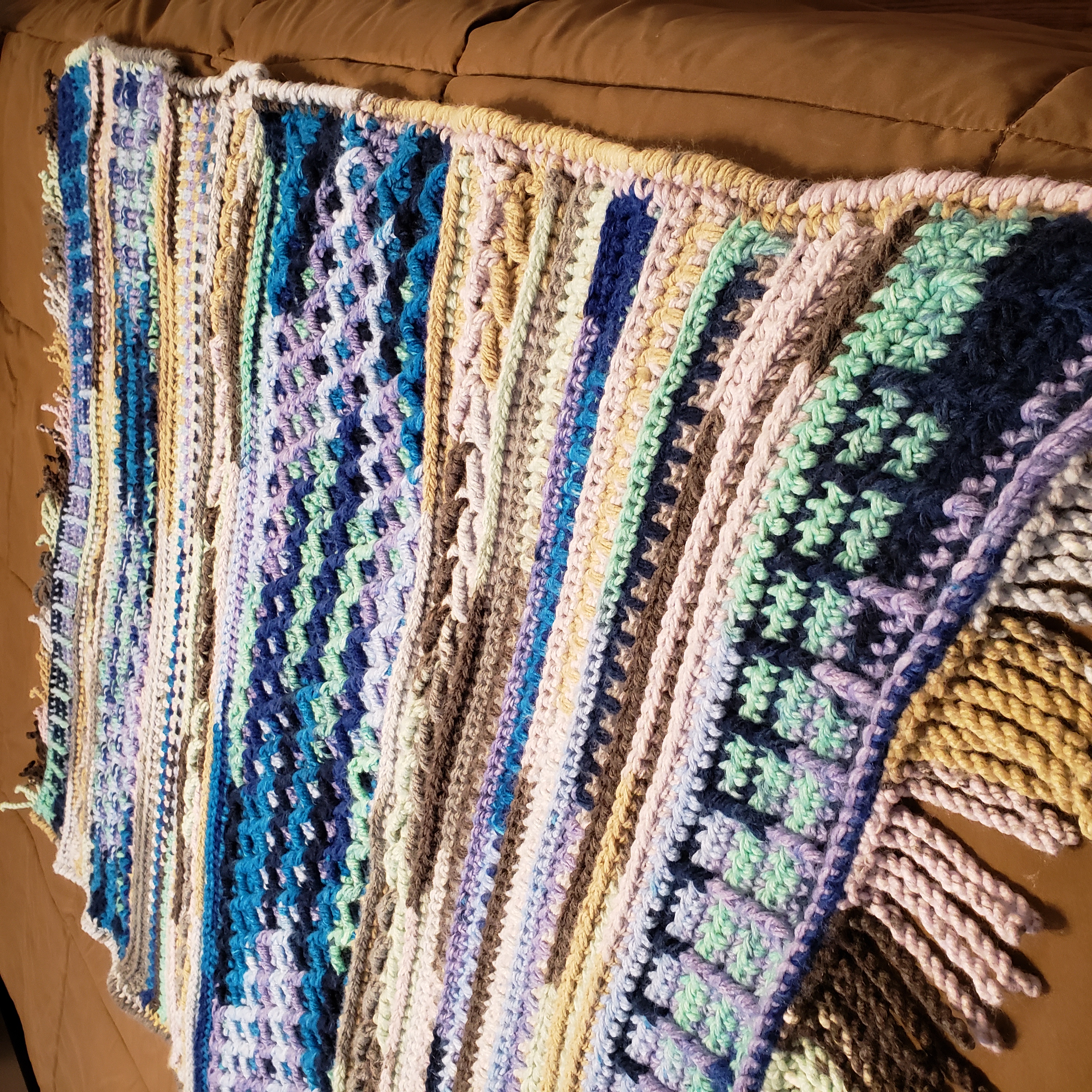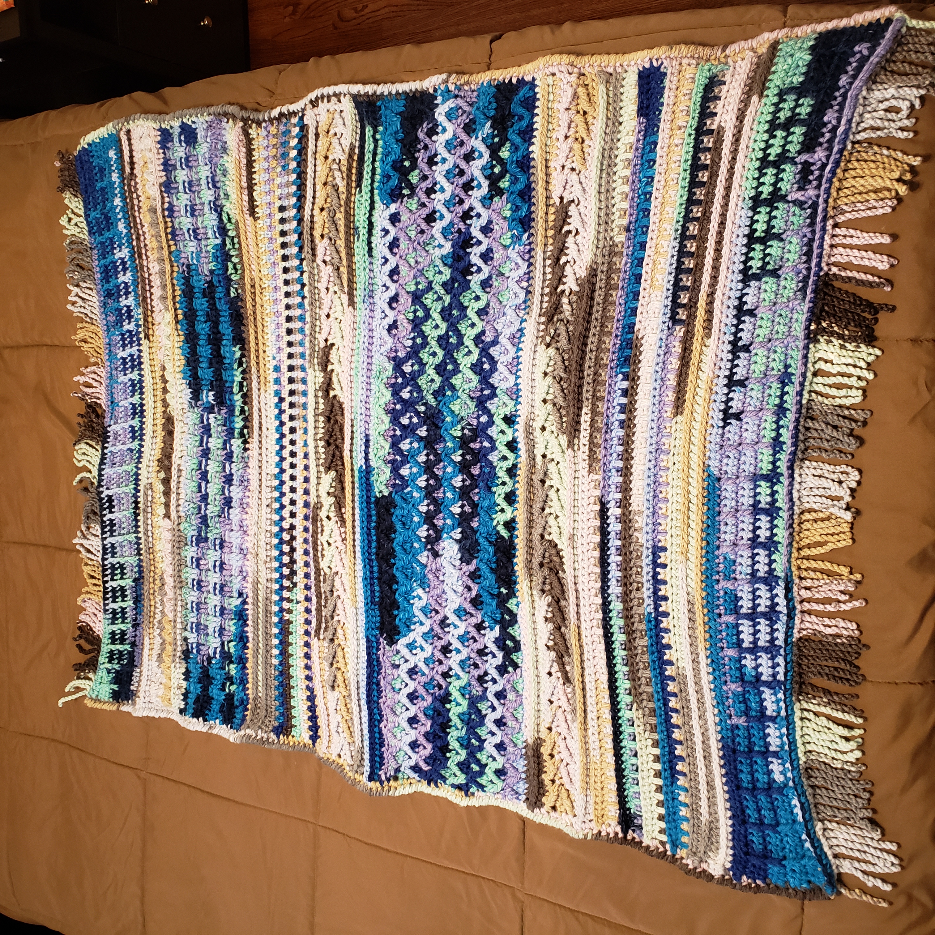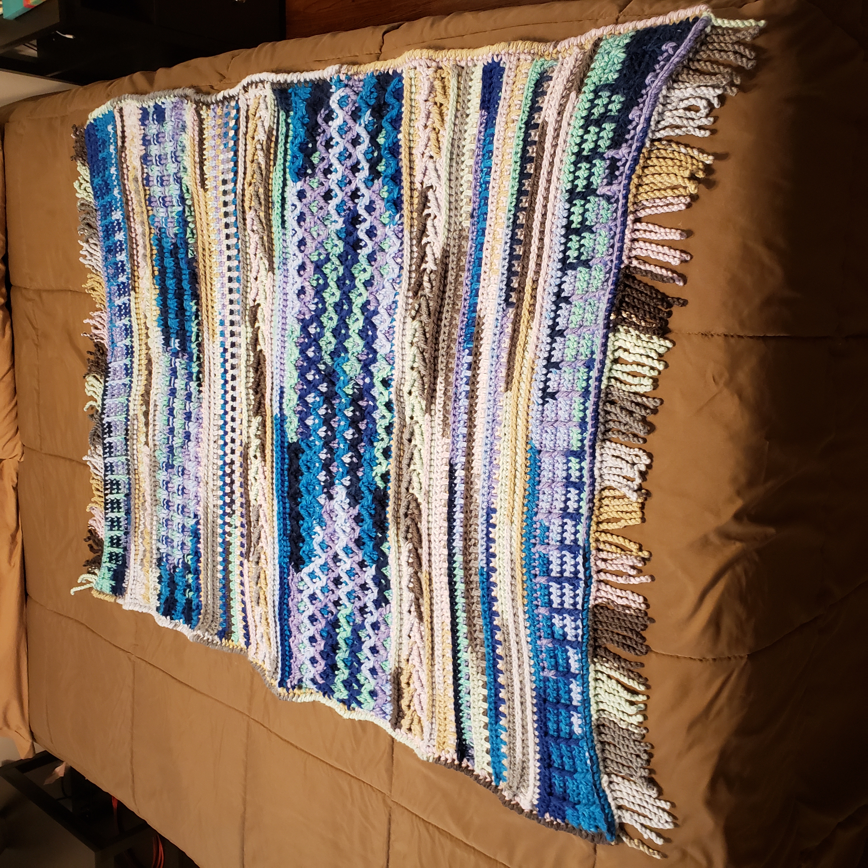 This product is a hand-crocheted sampler blanket/throw/afghan. The blanket is made with 100% acrylic yarn. It is made with a yarn called Caron Anniversary Cakes in the colorways Oceana and Cookie Mint. This pattern is by Yarnspirations Design Studio.