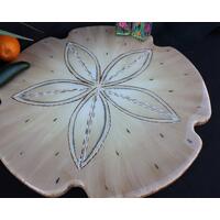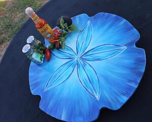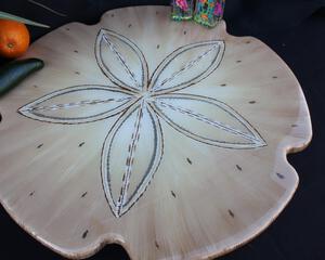 The sand dollar Lazy Susan is cut from 5/8" cabinet grade plywood. I cut, sand, prime and then paint the design with acrylic paint. To finish off each one, I coat the Lazy Susan's with two coats of two part epoxy. The epoxy is what gives the piece that super shiny, thick glossy, glass like finish. I use the same type of epoxy that you might see on bar tops or restaurant tables. Most people that think it is made from glass or ceramic.