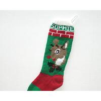 Stocking may be personalized at no extra cost. Name will be hand-stitched in top green panel, with white yarn. (Longer names will wrap around the stocking.) Jingle bell is attached to end of Santa's hat.