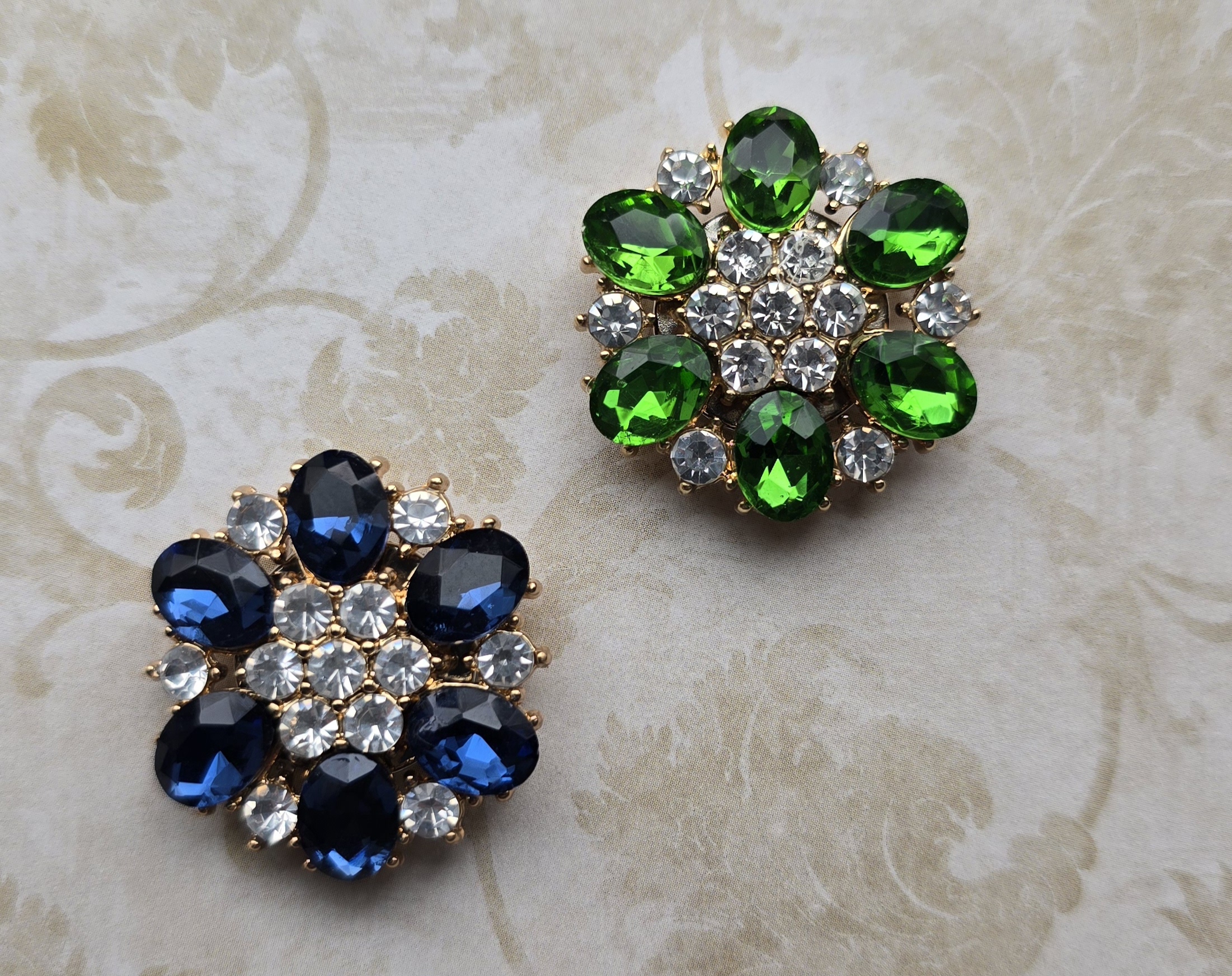 Darling magnetic brooches in 2 color choices: Dark Blue Sapphire or Kelly Green. Center clear daisy-like design accented with oval-shaped dark blue or bright green crystals. Set in gold alloy. Approximately the size of a Quarter. Packaged nicely in a secure container.