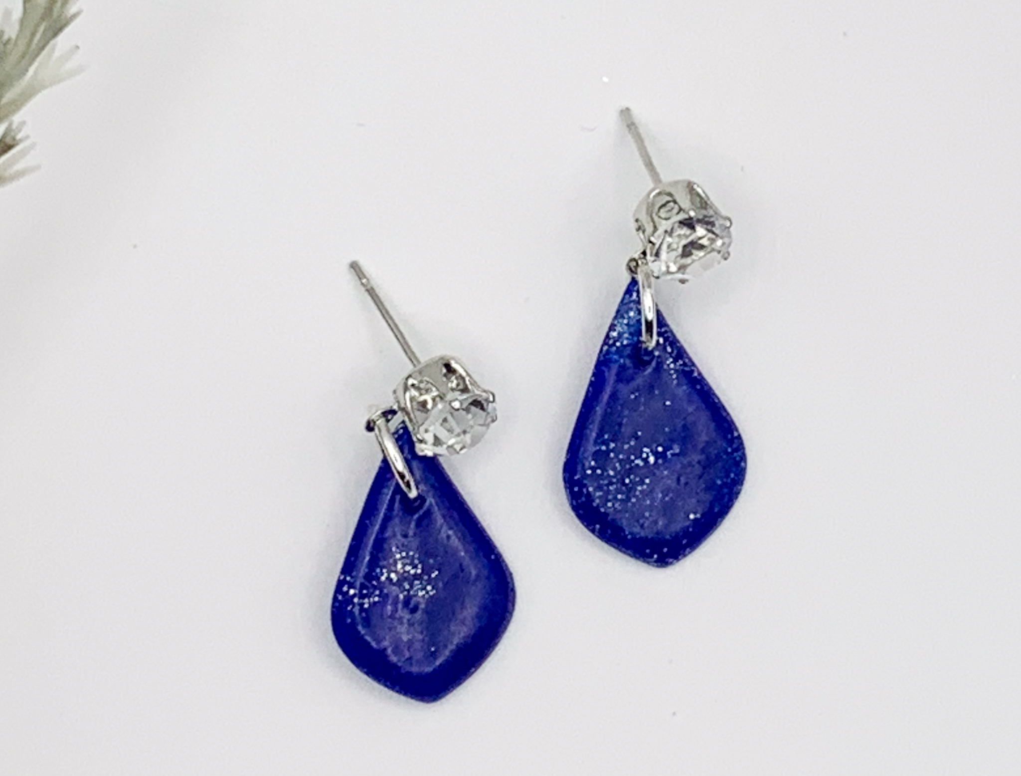 A pop of rich sapphire blue with a hint of shimmer! These teardrop-shaped polymer clay earrings are paired with sparkling crystal studs for a chic, elegant finish.
