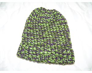 Using Sashay Purple Glitter yarn, this scarf is approximately 5 feet long. It is lacy and stylish for those bohemian days and nights. It is a rich purple with purple glitter highlights. I would hand wash and lay flat to dry.