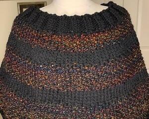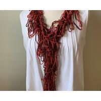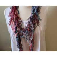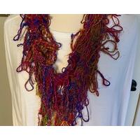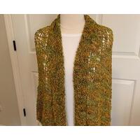 This triangle shawl is made from animal print colored yarn. The fringe adds a little extra sassiness to the piece. It can be worn a variety of ways. Turn the long end over a few inches to create a "collar" look, and wrap it like a cowl, or drape it around your shoulders and fasten with your own shawl pin (pin not included in sale). This shawl is made from an acrylic/wool blend with a wonderful drape. This shawl measures 58 inches from tip to tip and 24 inches long at the point. This can be hand washed or dry cleaned.