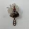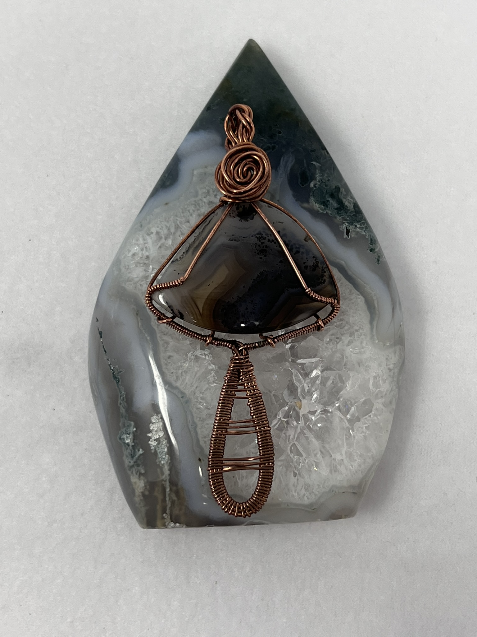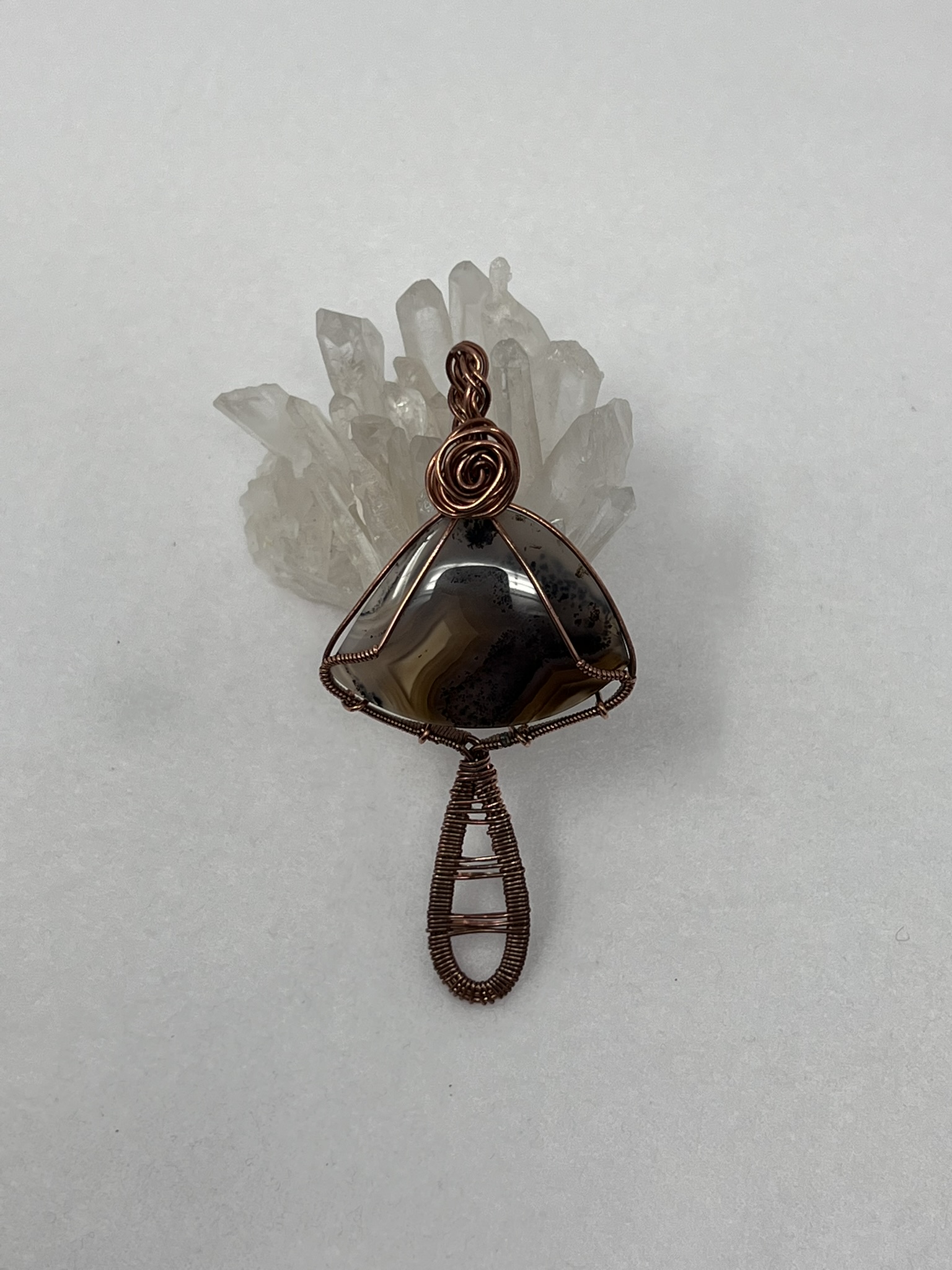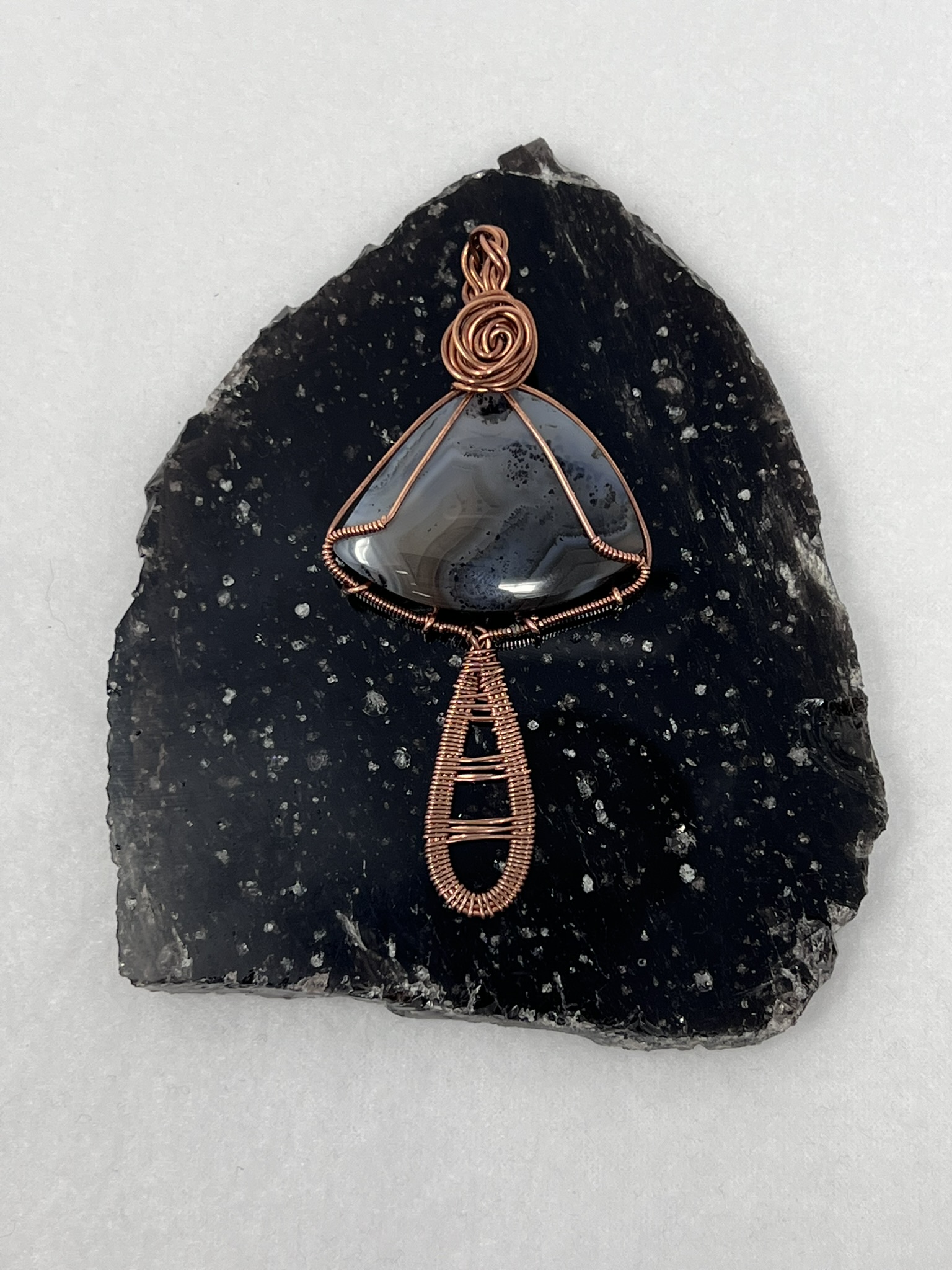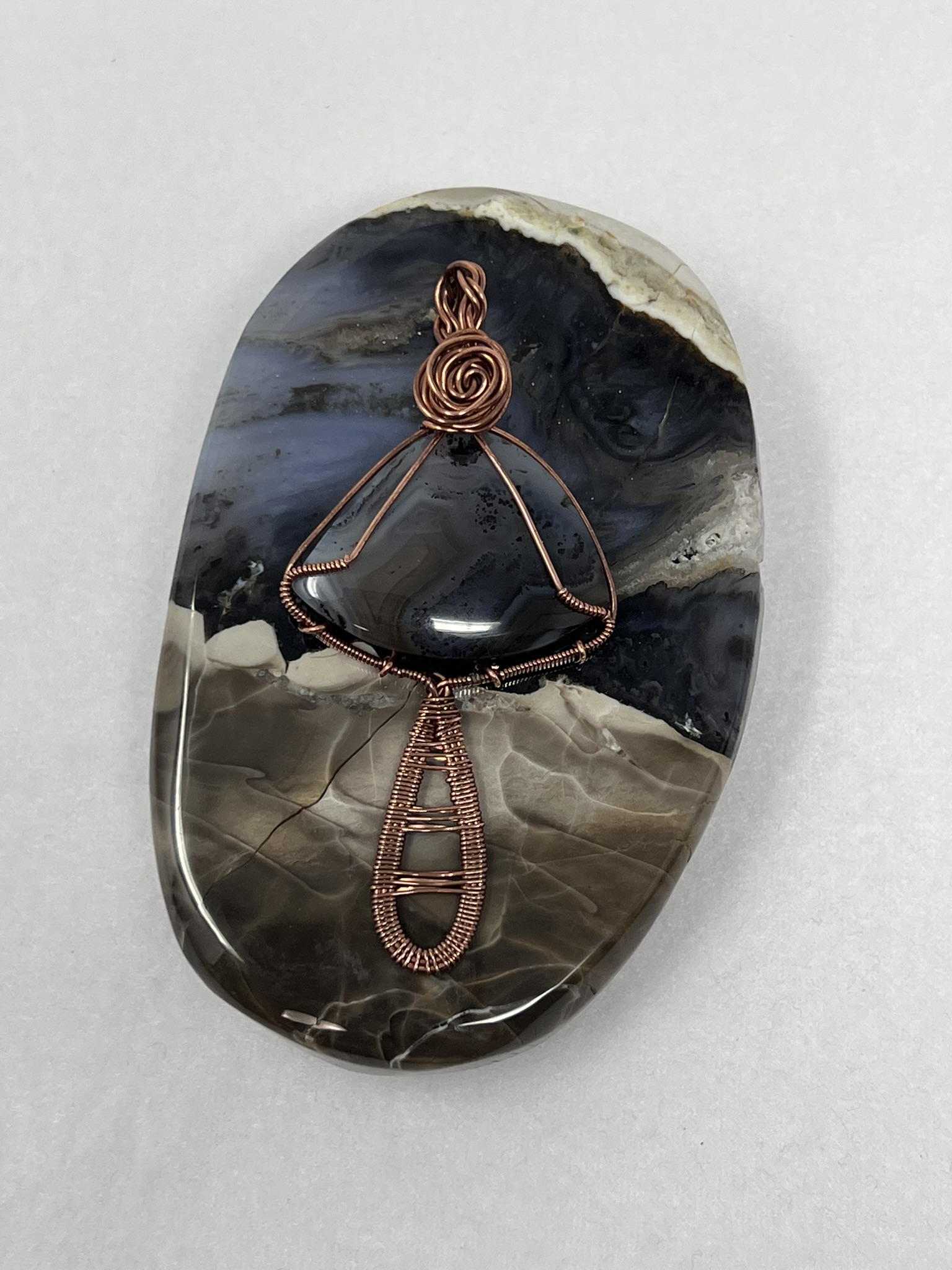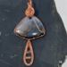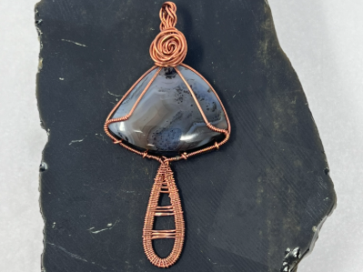 This fun pendant features an agate cabochon that has been wrapped in copper wire. It is wrapped in 3 pieces of 20 gauge round copper and a piece of 24 gauge half round copper wire. The stem of the mushroom is made by wrapping the 24 gauge half round copper wire around the 3 pieces of 20 gauge round copper wire. The stone that makes the mushroom cap is held in with the extra pieces of the 20 gauge round copper wire. The bail is made by wrapping braiding 4 pieces of the 20 gauge round copper wire and the rose is made by twisting 2 pieces of the 20 gauge round copper wire together. This piece is handmade in Minnesota.