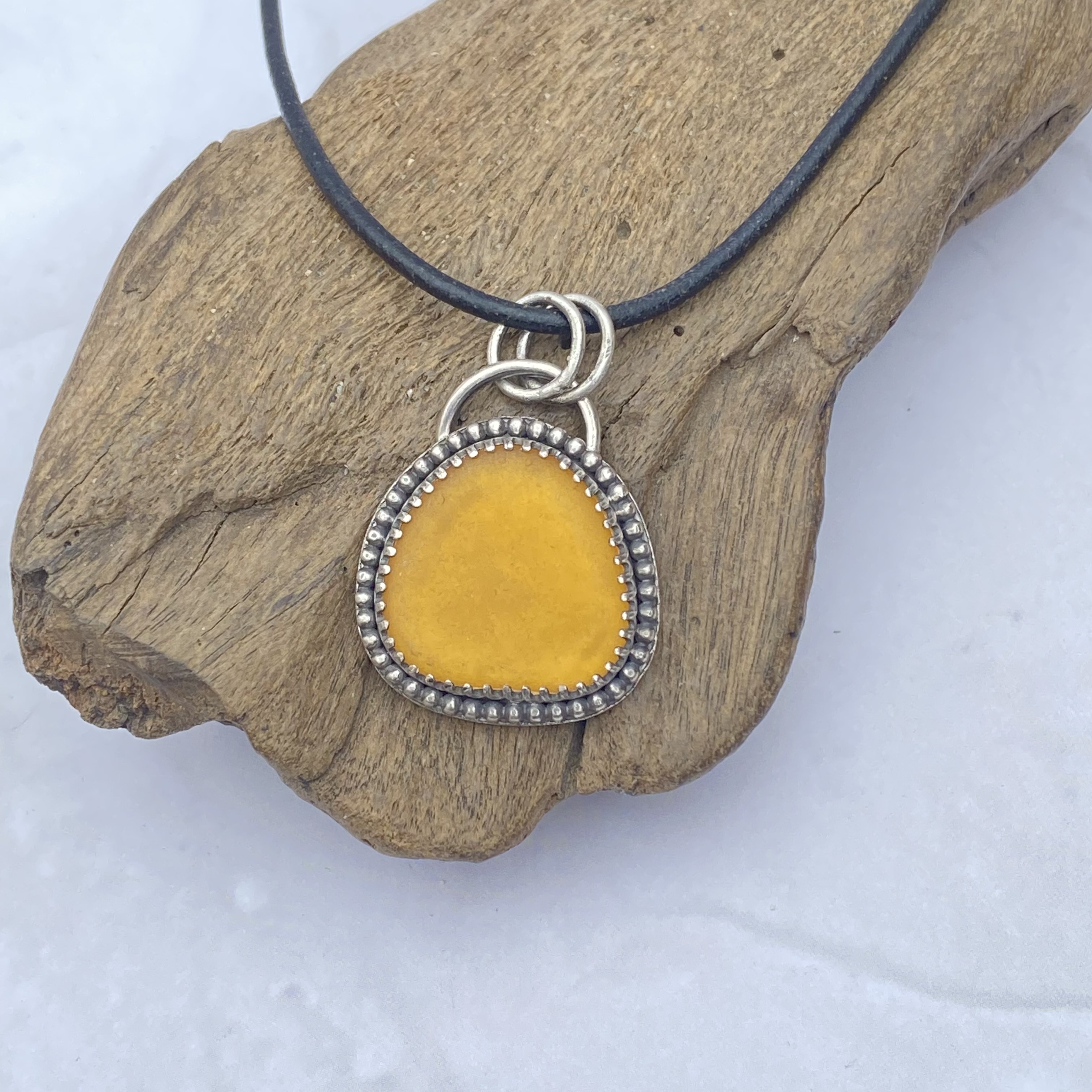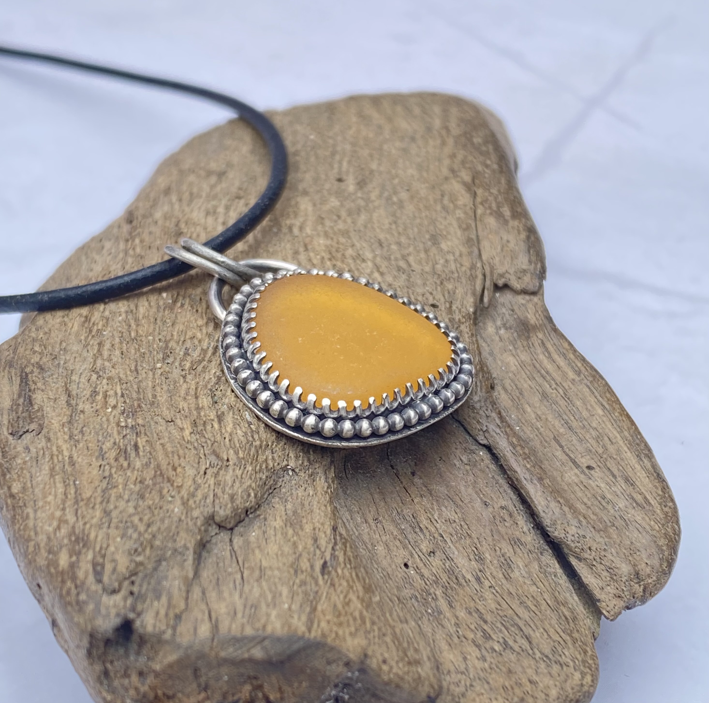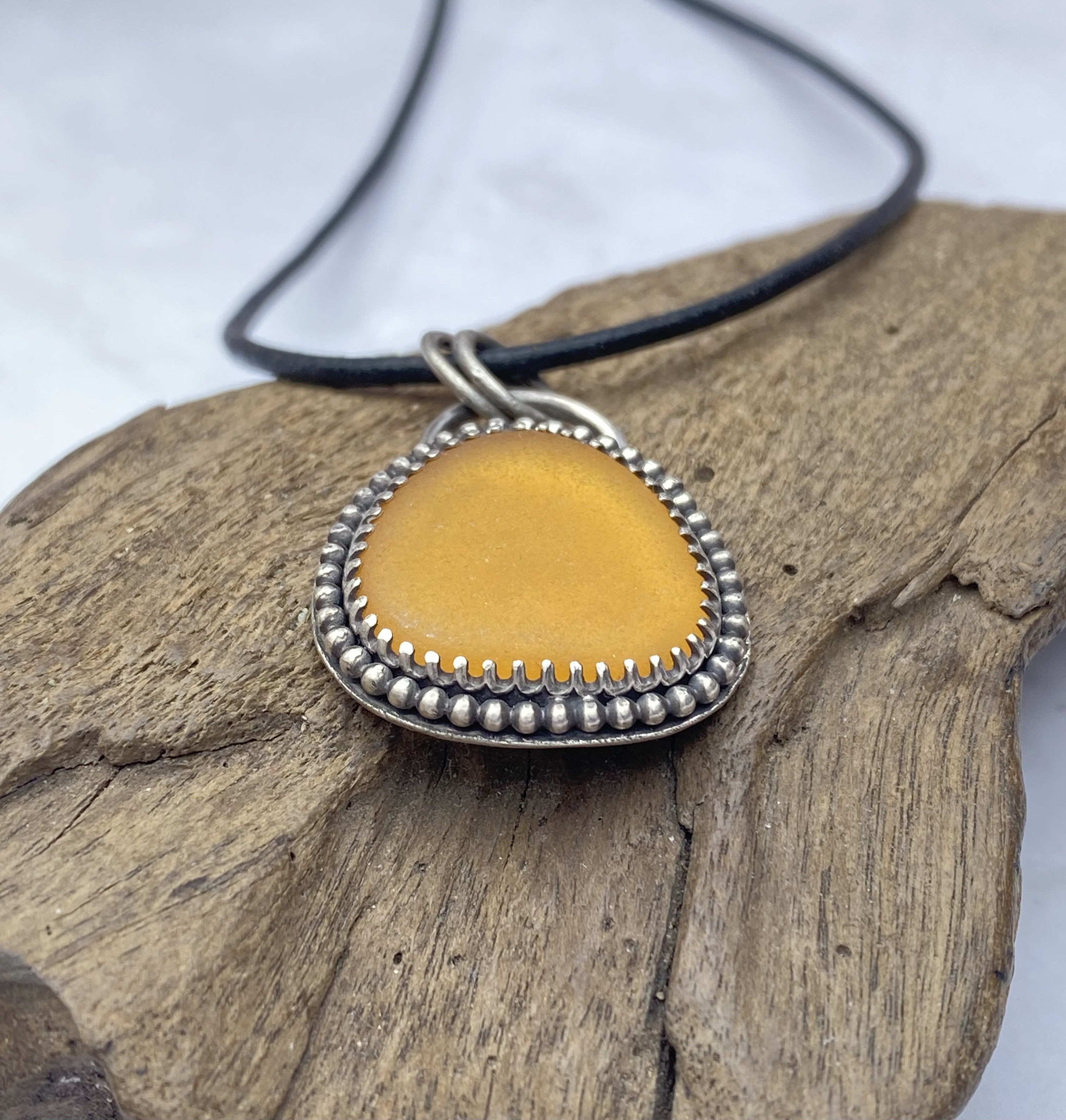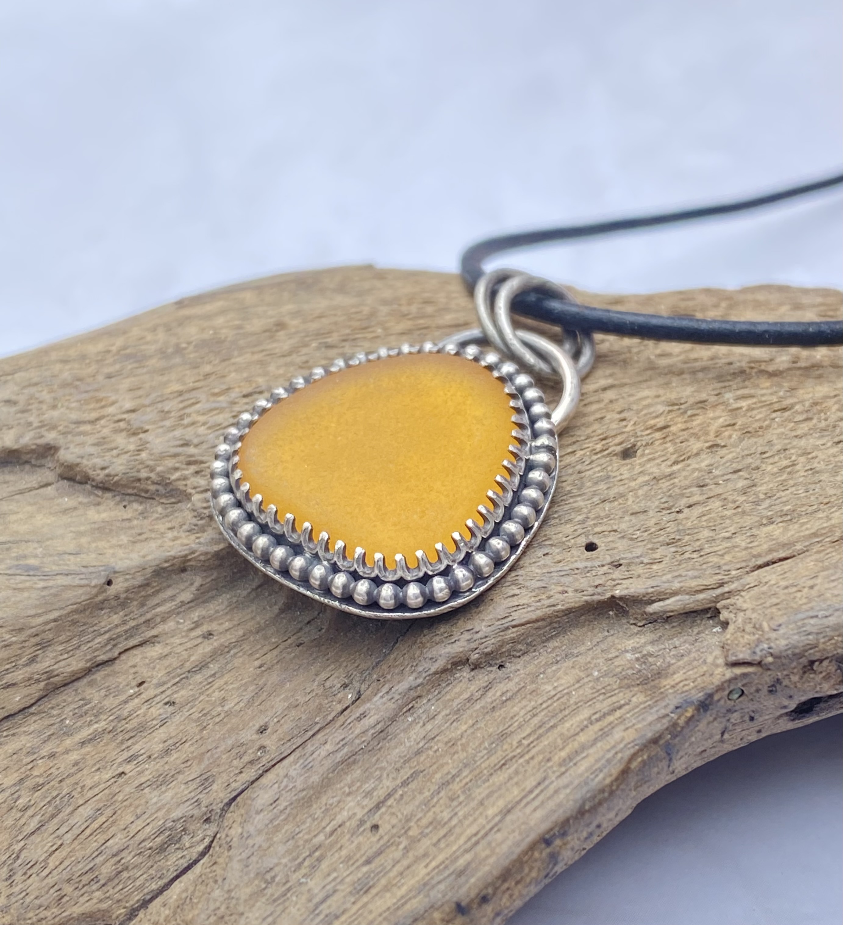 This magnificent sea glass is from Puerto Rico & the color is absolutely perfect for the season, and all year round, for that matter! It is a gorgeous honey-amber-apricot color that I haven't seen before, and the sea glass hunter told me she has kept it in her collection for quite some time before releasing it! I set it in .925 sterling silver with a decorative bezel wire framed by a beaded wire. I then antiqued the silver to make this amazing color pop right out at you! Healing properties for sea glass will be included with your purchase. The pendant measures approximately 1-1/8" x 7/8" from top to bottom. This listing is for a pendant only. If you would like a chain or cord, please message me for current market prices.