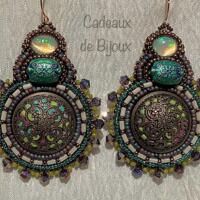 Regal, elegant and refreshing as the ocean surf. Athos Par Puca glass Cabochons surrounded by glass Czech and Japanese beads in tones of sea foam, mint green, aqua and sea glass with an elegant fringe. 2 15/16” drop from the ear wire. Surprisingly light weight at 8.06g / .284 oz. per earring