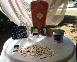 The large center shell is engraved with the couple's names and wedding date. The center shell measures approximately 3.5" wide by 3.25" tall. We'll provide a proof via email within 1-3 business days for your approval prior to production.