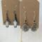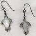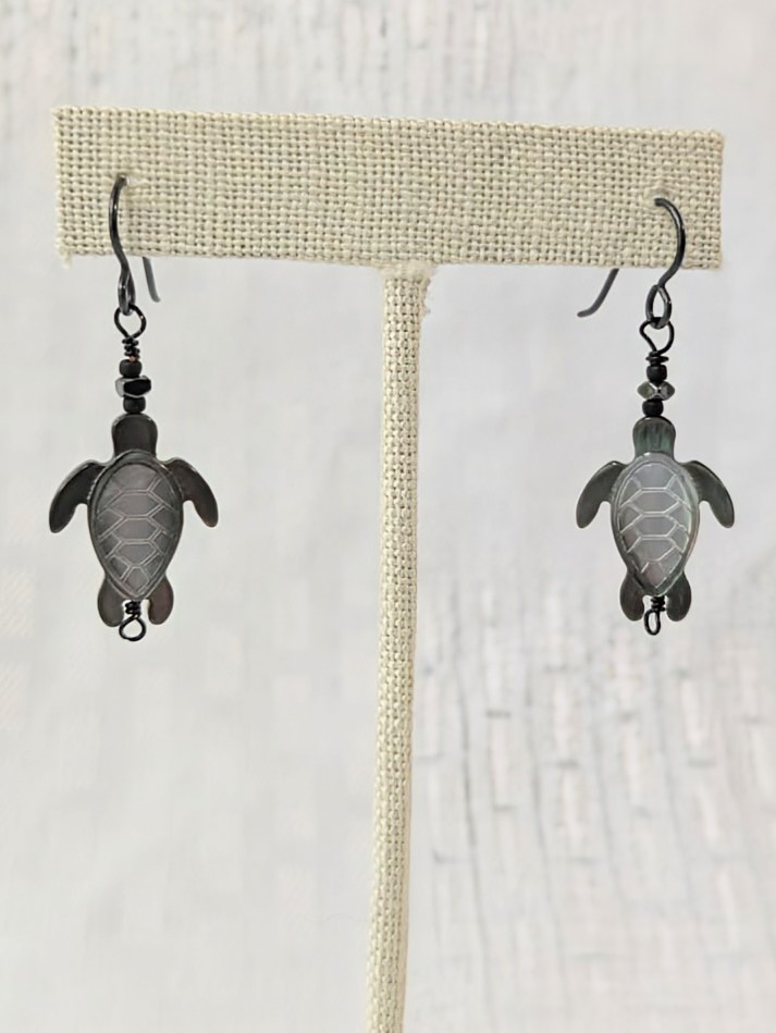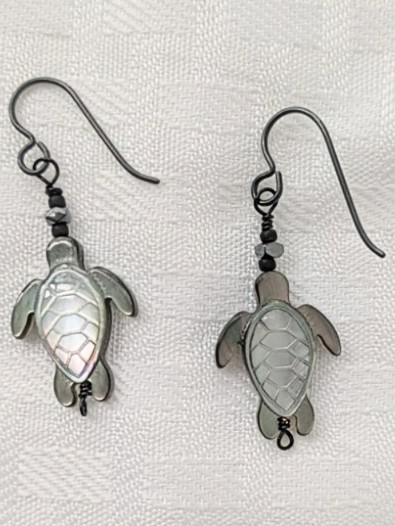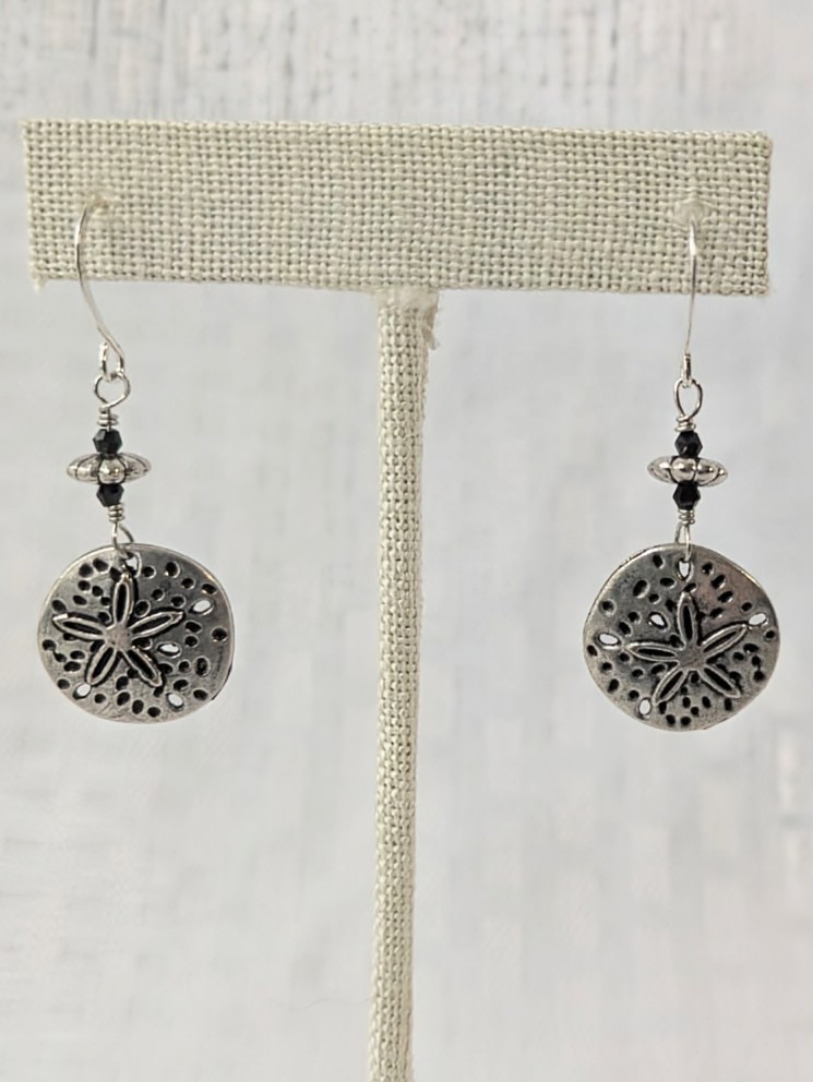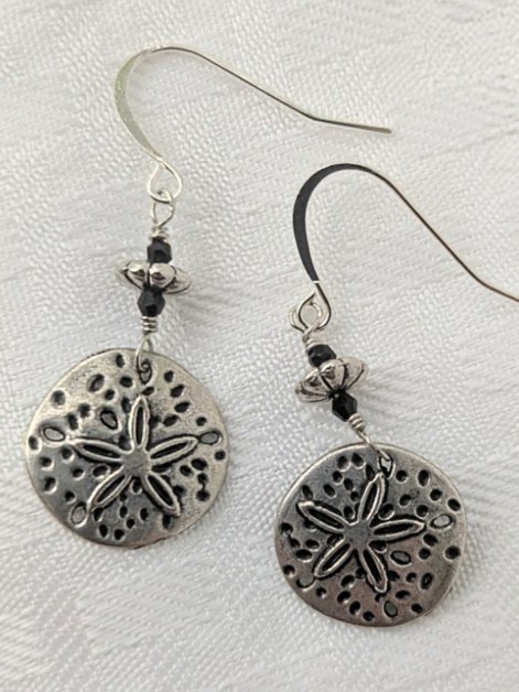 Sea Turtle Earrings are made of shell and are accented with glass seed beads and a hematite bead at the top. The length from the bottom of the ear wire to the bottom of the turtle is approximately 1 1/4" long. The metal Sand Dollar earrings are approximately 3/4" in diameter and are finished with a metal bead and two tiny crystal beads at the top. The length from the bottom of the ear wire is approximately 1 1/4". Both earrings are very lightweight.