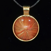 These are fun to do! I take the glass cabachon and dip it into freshly poured paint. Sometimes, I take run off from one of my paintings that I created or I will just pour on my table and create special pieces from there. Once cured I either set into an alloy setting or I will seal the back and glue on a bail for a "trayless" look.