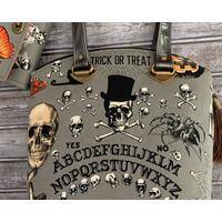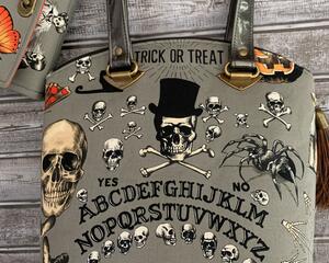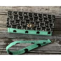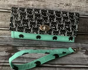 Emmaline Necessary Wallet / Clutch in Alexander Henry Seance fabric in smoke. Very cute, just grab it and go. No need for a purse. It has places for your cellphone, bills, debit/credit cards, and change. The wallet has 12 card slots, a zippered pouch, two places for paper dollar bills, and a center section to put your phone, receipts, checkbook, etc.