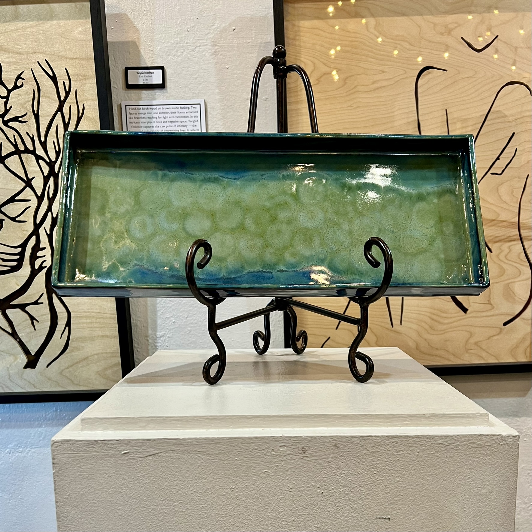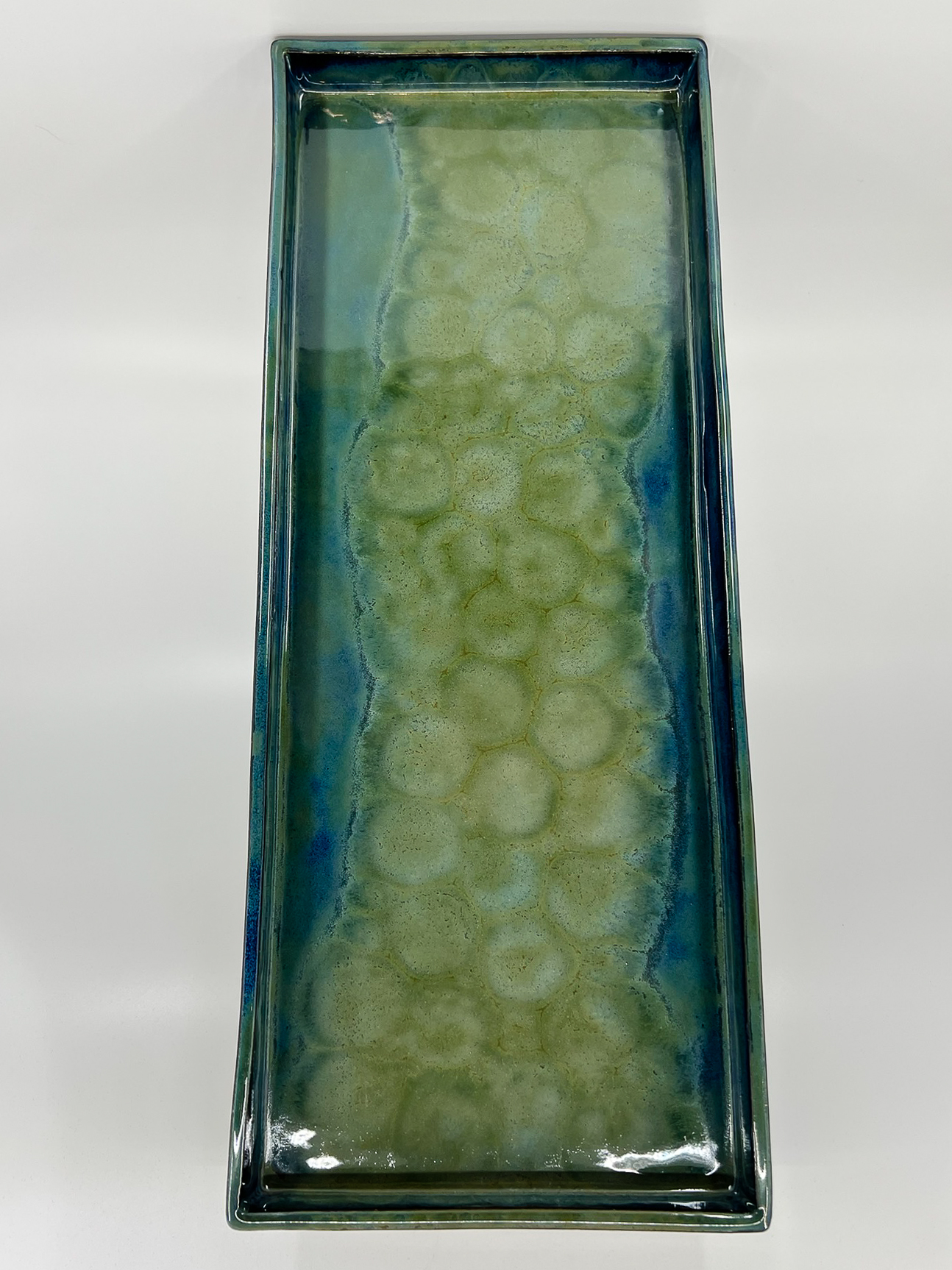 Glazed in layered hues of blue and green, this hand-built platter evokes the quiet rhythm of seaweed drifting on shifting water. The central glaze pools into soft organic forms, its surface revealing subtle depth where glaze meets clay. Along the edges, darker blues gather like deepening sea, framing the tranquil motion at the piece’s core. This balance between control and spontaneity — between the structured form and the organic flowing glaze — is what defines the piece. The contrast invites a contemplative pause: how earth and water, geometry and movement, come together in harmony through heat and time. Each time I make one of these platters, I’m reminded of the quiet pleasure that first drew me to clay and keeps me coming back to it.