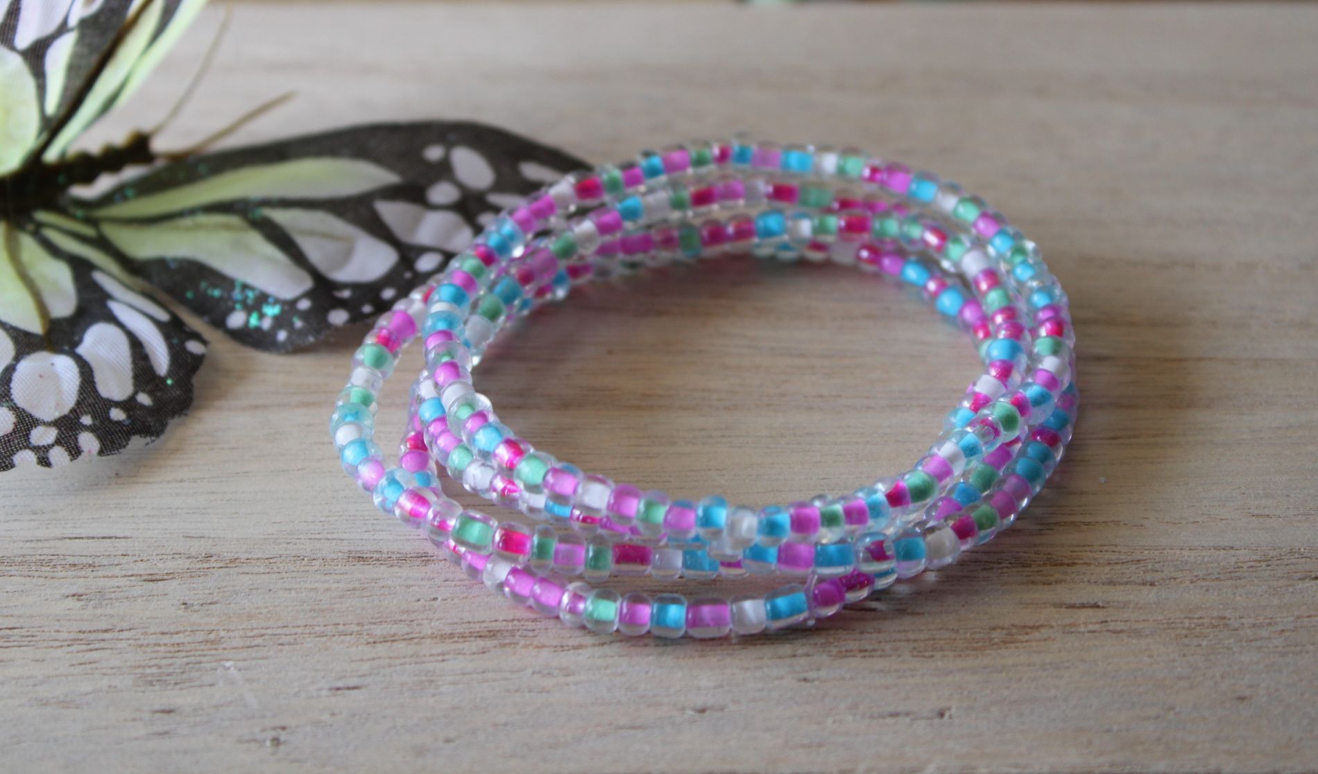 The bracelets are made of glass 6/0mm seed beads. I threaded high quality, fray free, non latex stretch cord through the beads.