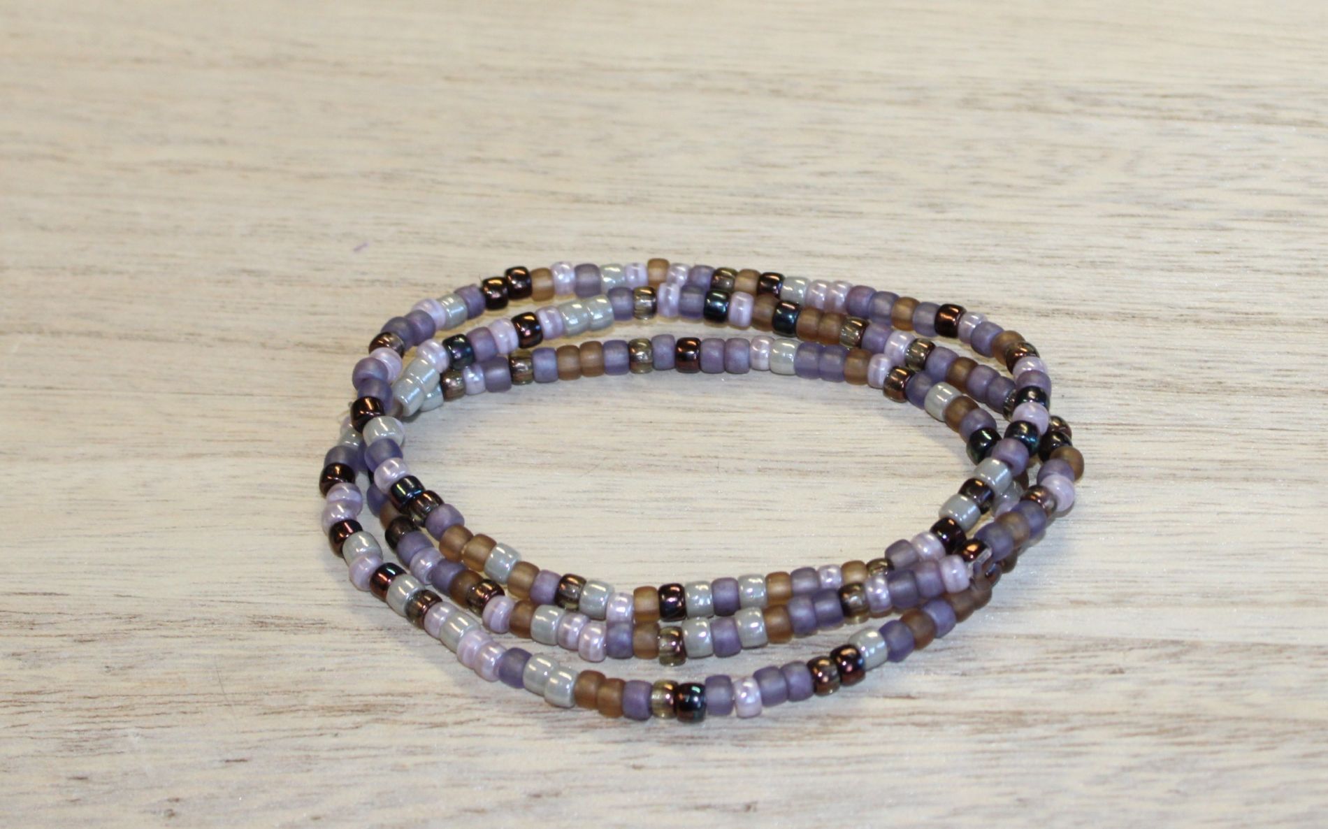 The glass beads are a mix of violet and neutral hues. 6/0 beads. The finishes are in matte semi-transparent, rainbow metallic, shiny opaque, and matte Picasso, which add to the unique look of the blend of beads. This bracelet is pretty enough on its own wearing a single bracelet or a larger stack.