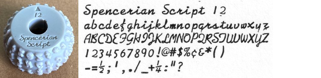 This ball features the Spencerian Script font from https://site.xavier.edu/polt/typewriters/spencerianscript.html, tweaked a bit to fix some printing issues (mainly, IBM's character layout doesn't really allow for a descending lower case z). All I can figure out from google is the typeface was apparently used on some Royal typewriters in the 60s. ¯\(ツ)/¯ But it's a really nice alternative to the IBM Script typeface, a bit looser and more fun I think.