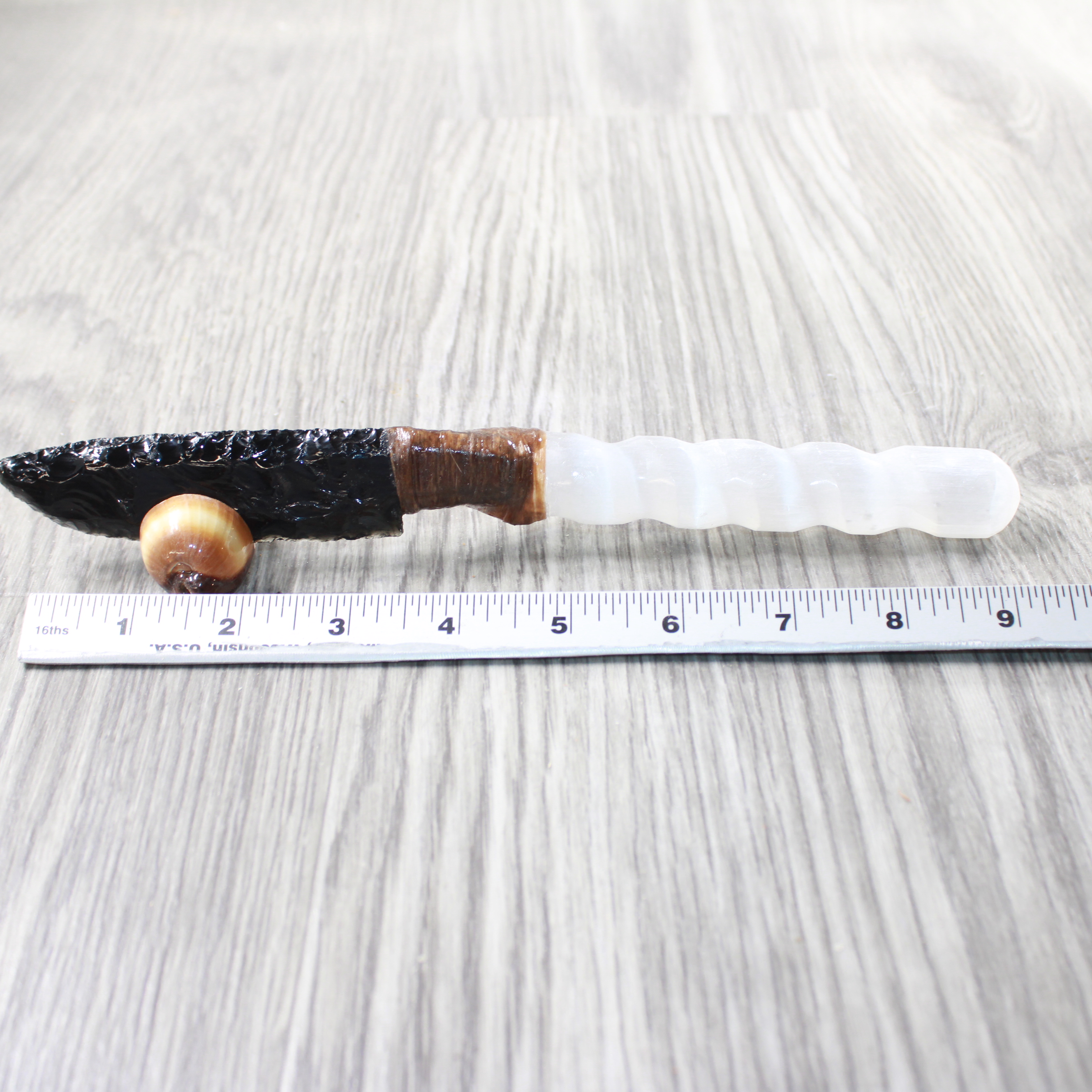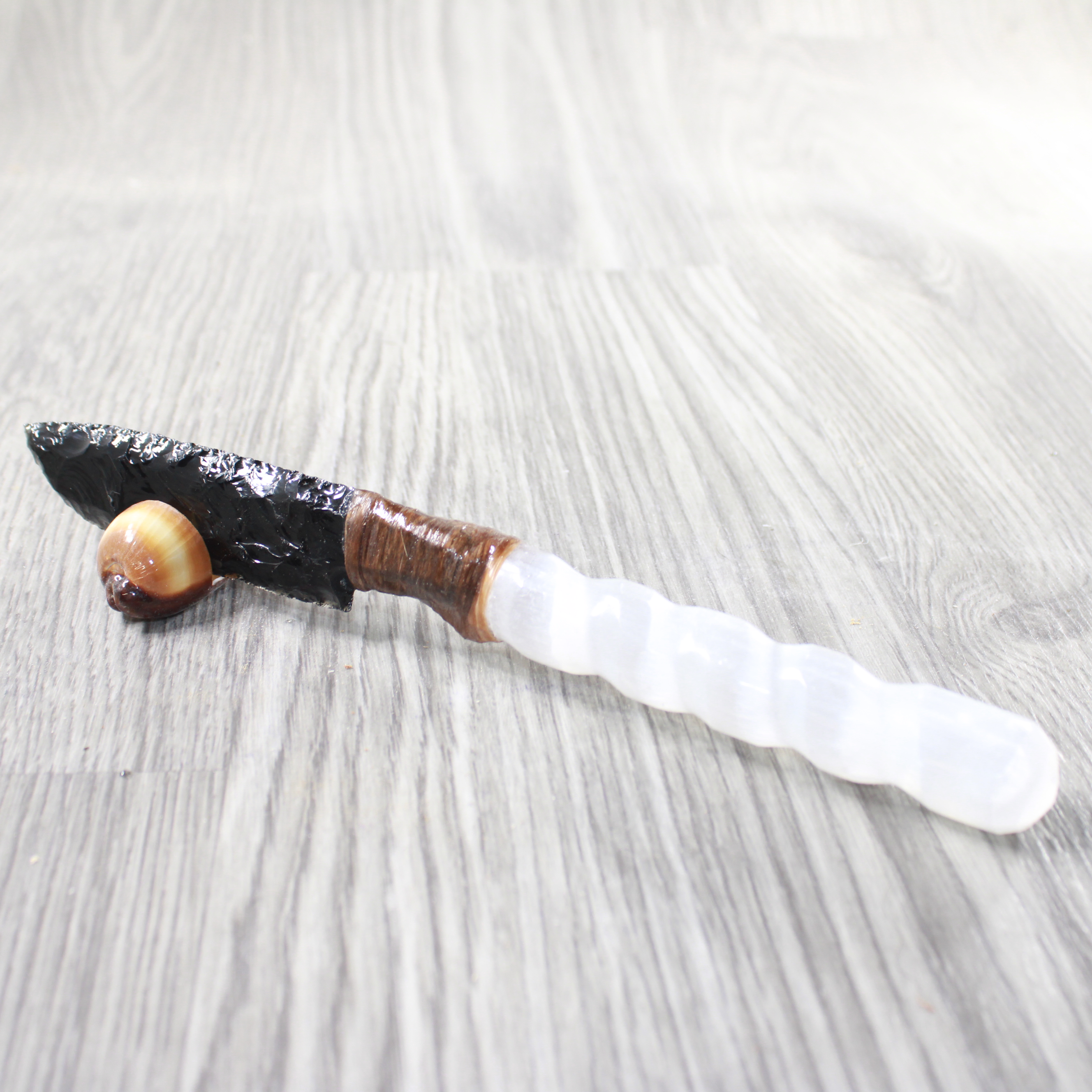 The handle is made from a selenite spiral.