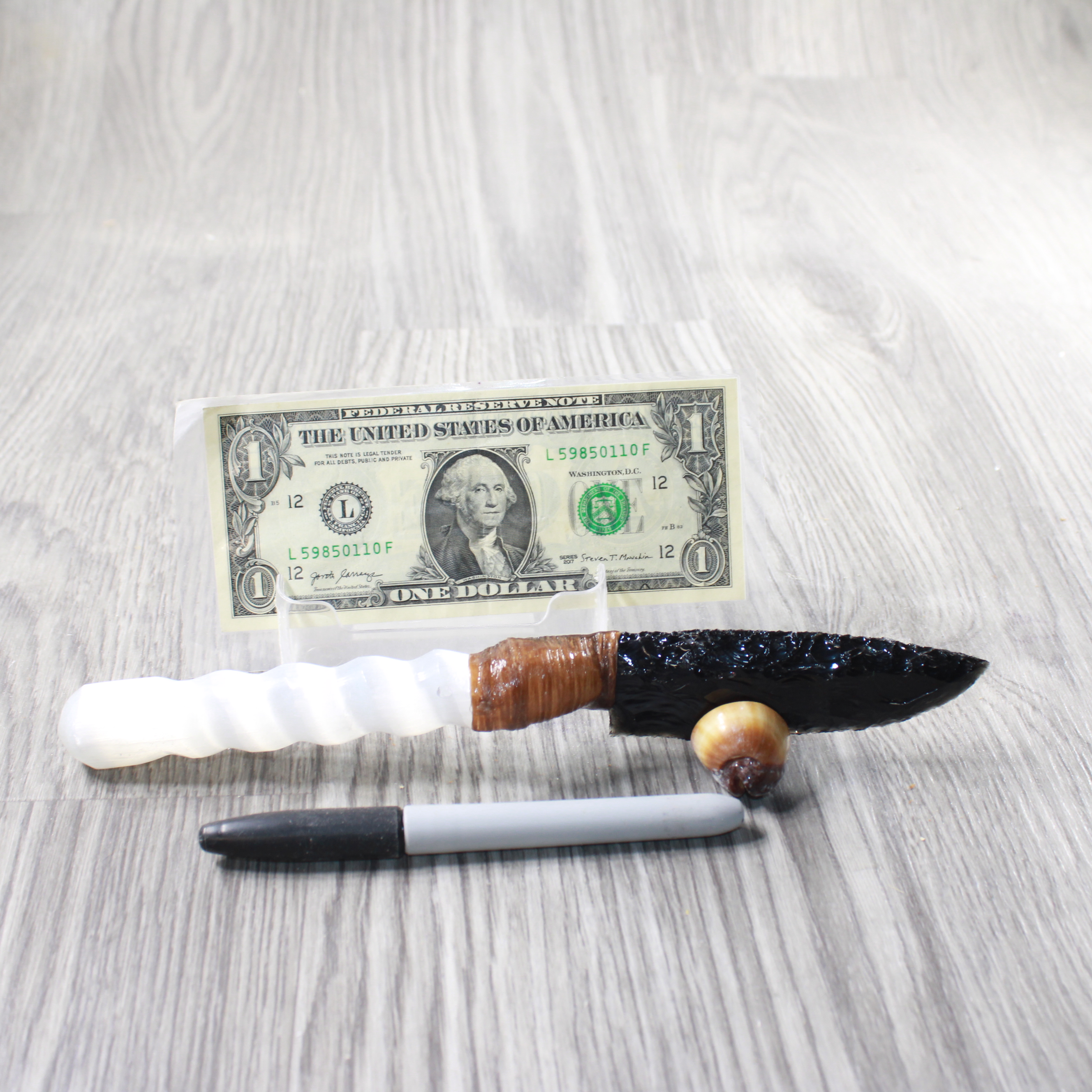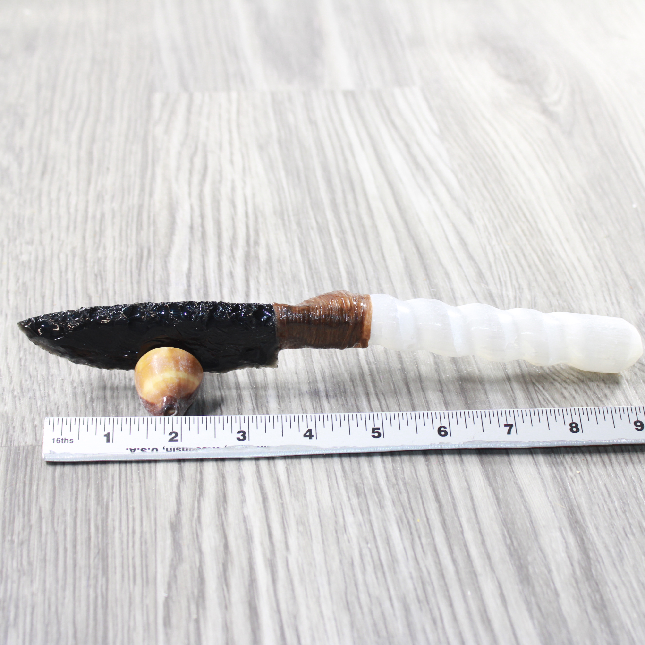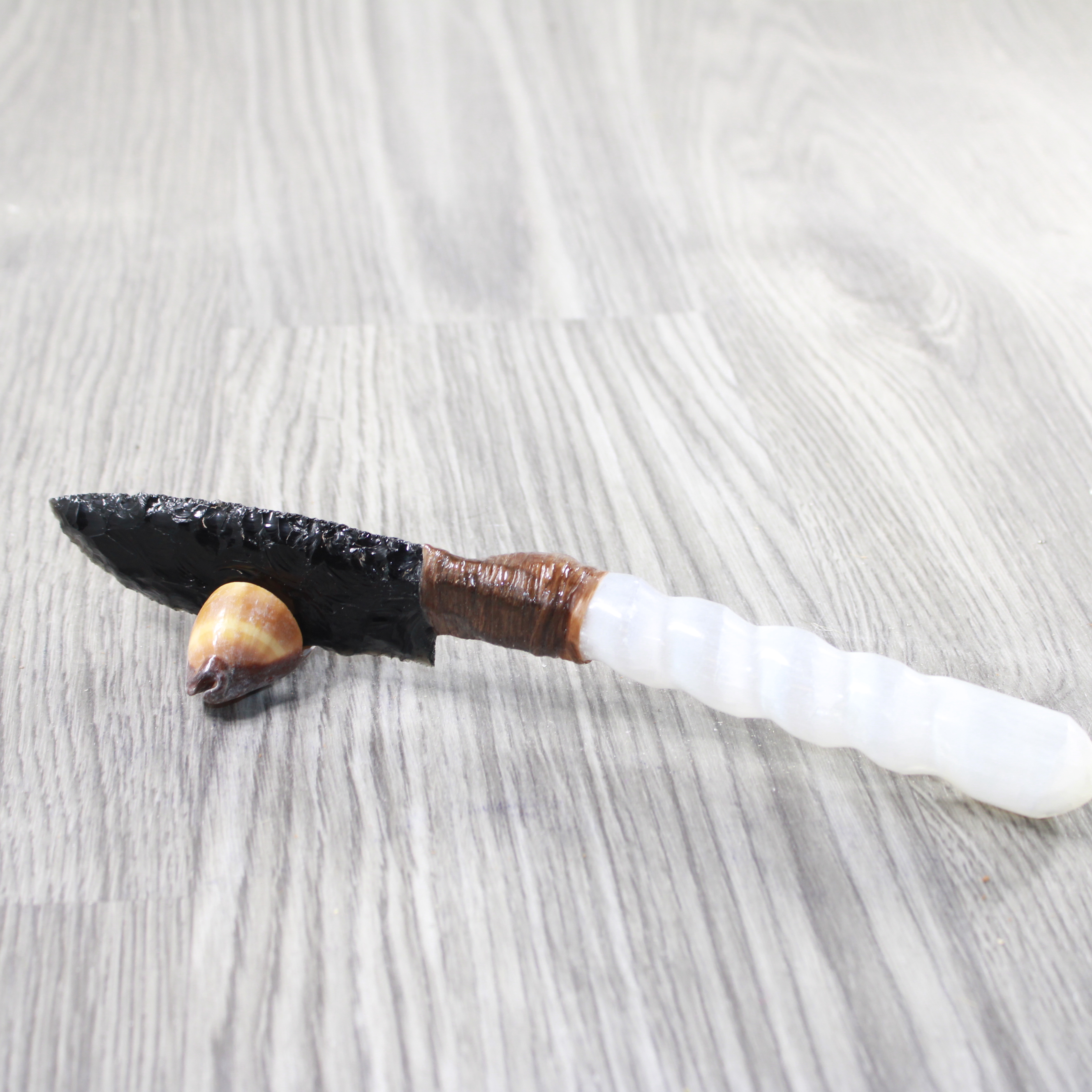 The handle is made from a selenite spiral.