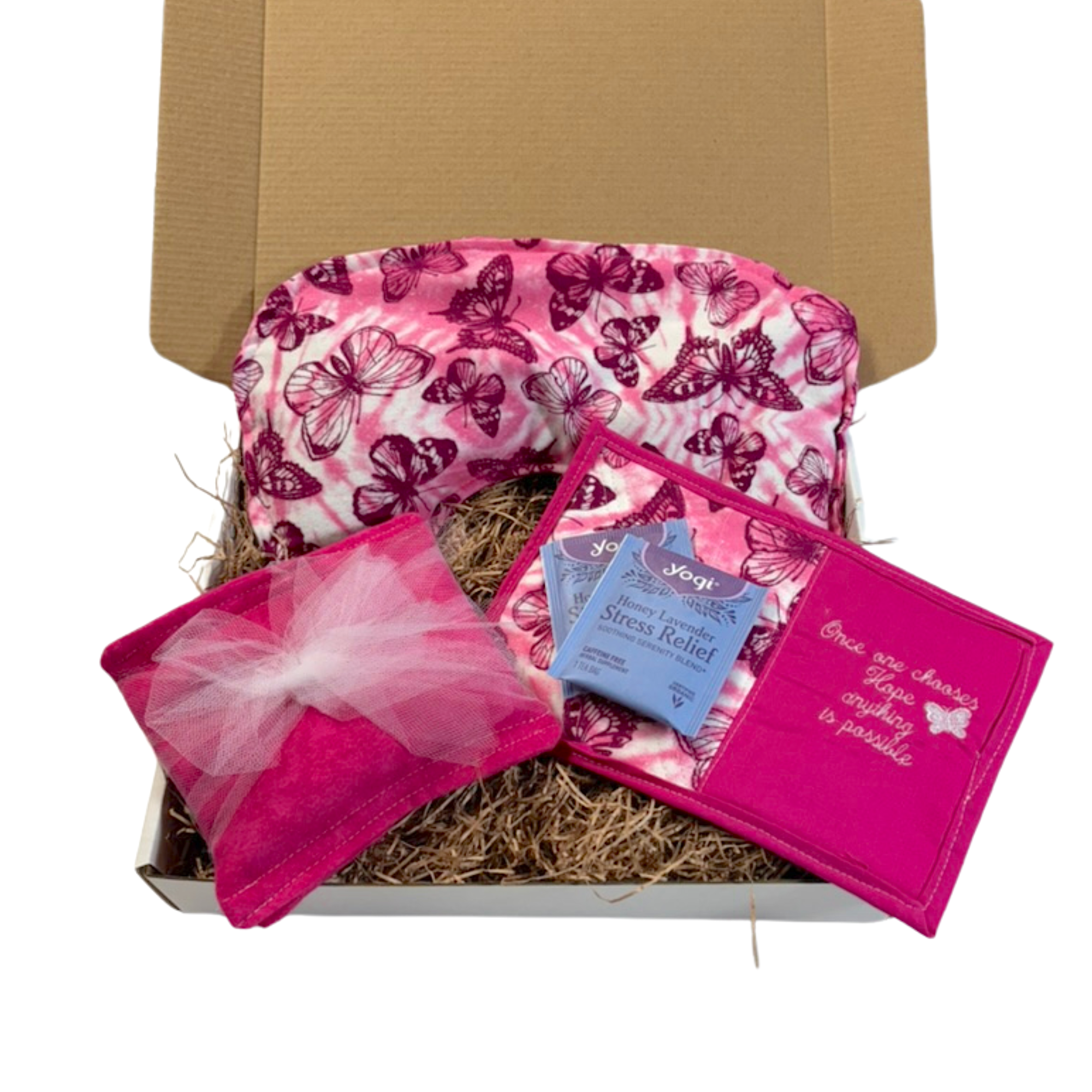 The handmade relaxation gift box features a pink butterfly theme with a message of Hope. Butterflies are considered to be symbols of transformation, hope, and rebirth. The color pink symbolizes love, compassion, nurturing, and femininity, blending the passion of red with the purity of white. It is widely recognized for its calming and gentle effect. Beyond emotion, pink represents hope, health, and a soothing, optimistic energy.
