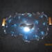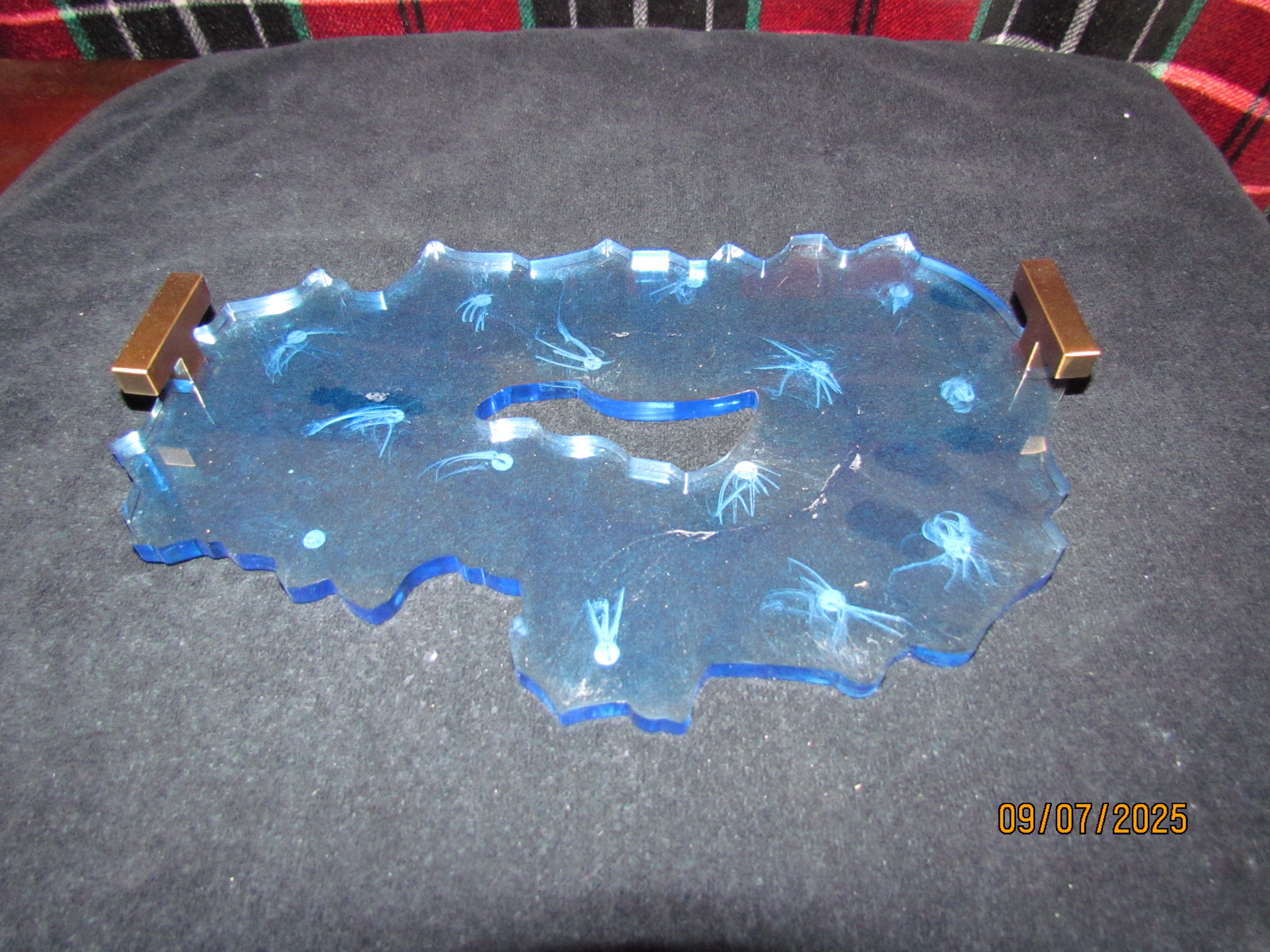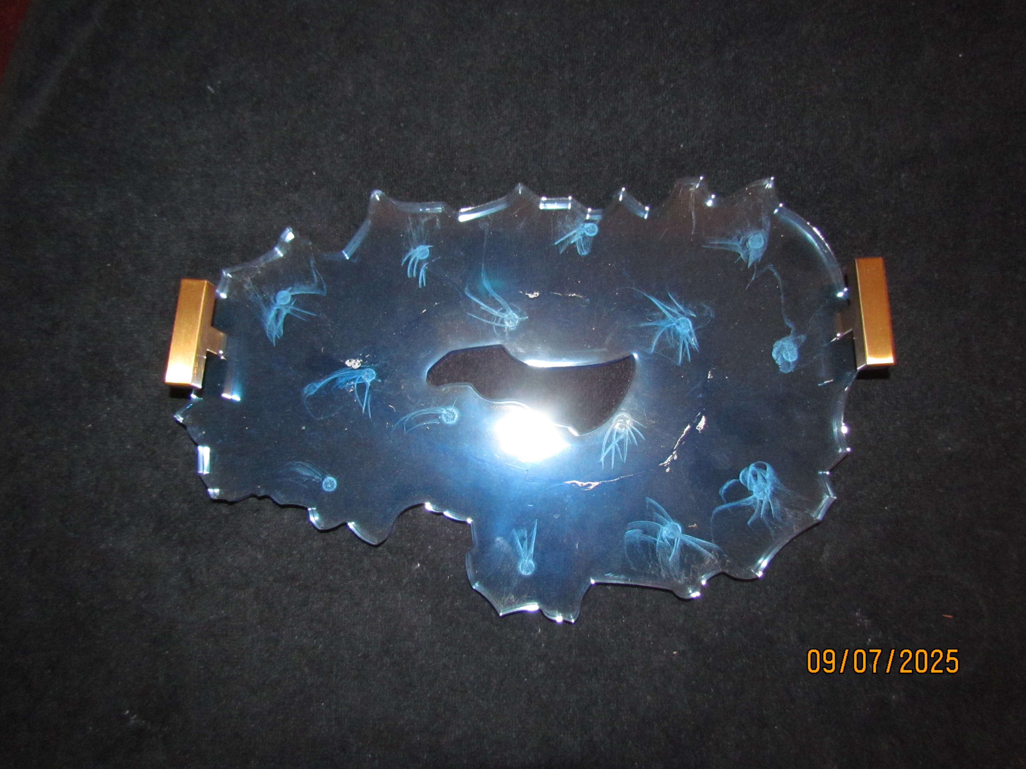 this resin serving tray is a beautiful blue with silver swirls inside of it.