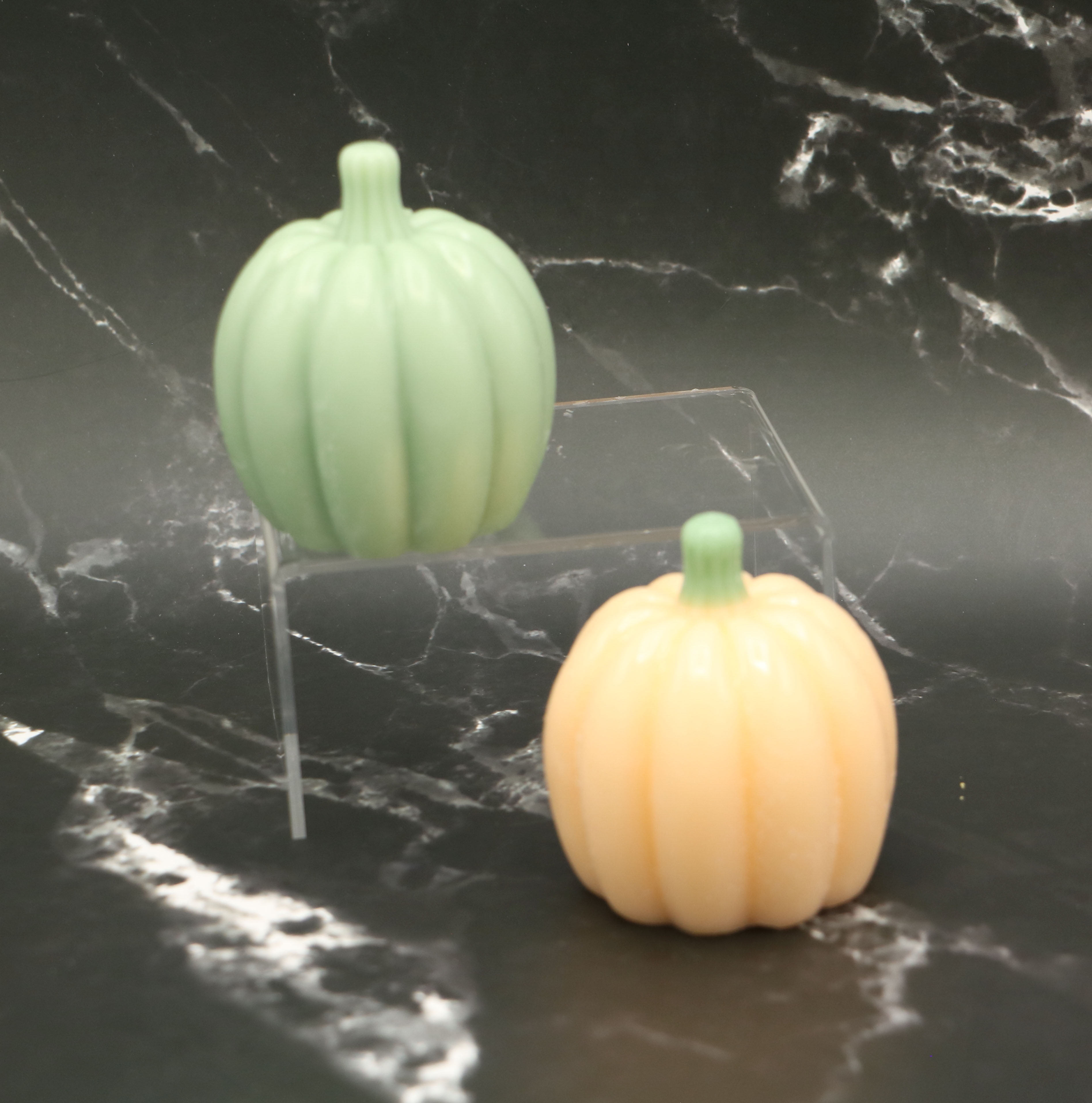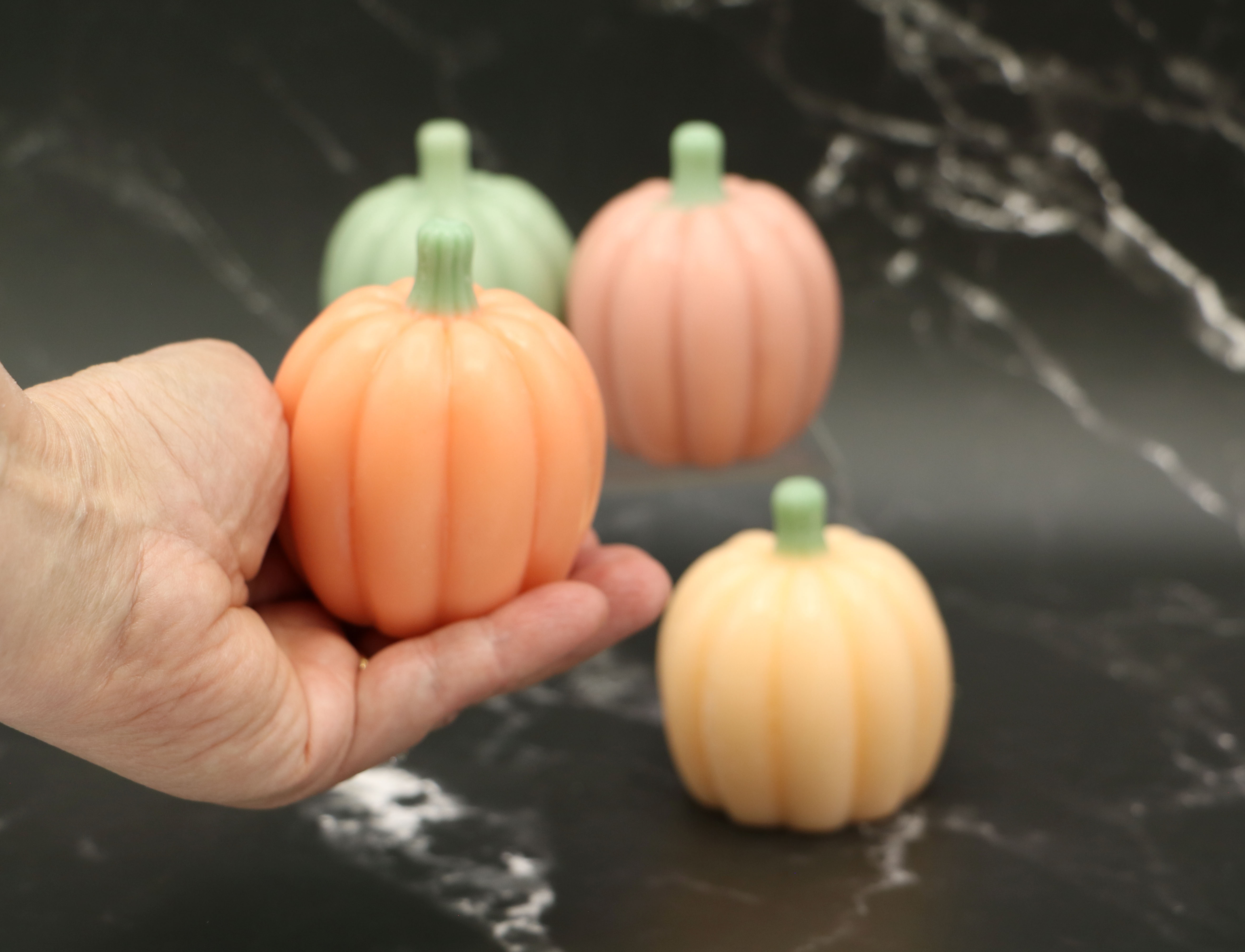 Pumpkins are made by first preparing the soap using the customer's requested soap color & scent. The molds are upside-down; therefore, the pumpkin stem is poured first using green colored soap. When this soap has hardened, I add the remaining soap to the mold to fill the pumpkin mold. After the soap has completely hardened, I gently remove the soap from the mold and place them into clear bags & seal them. Gloves are worn throughout the soap crafting process. All equipment is sanitized prior to use.