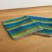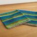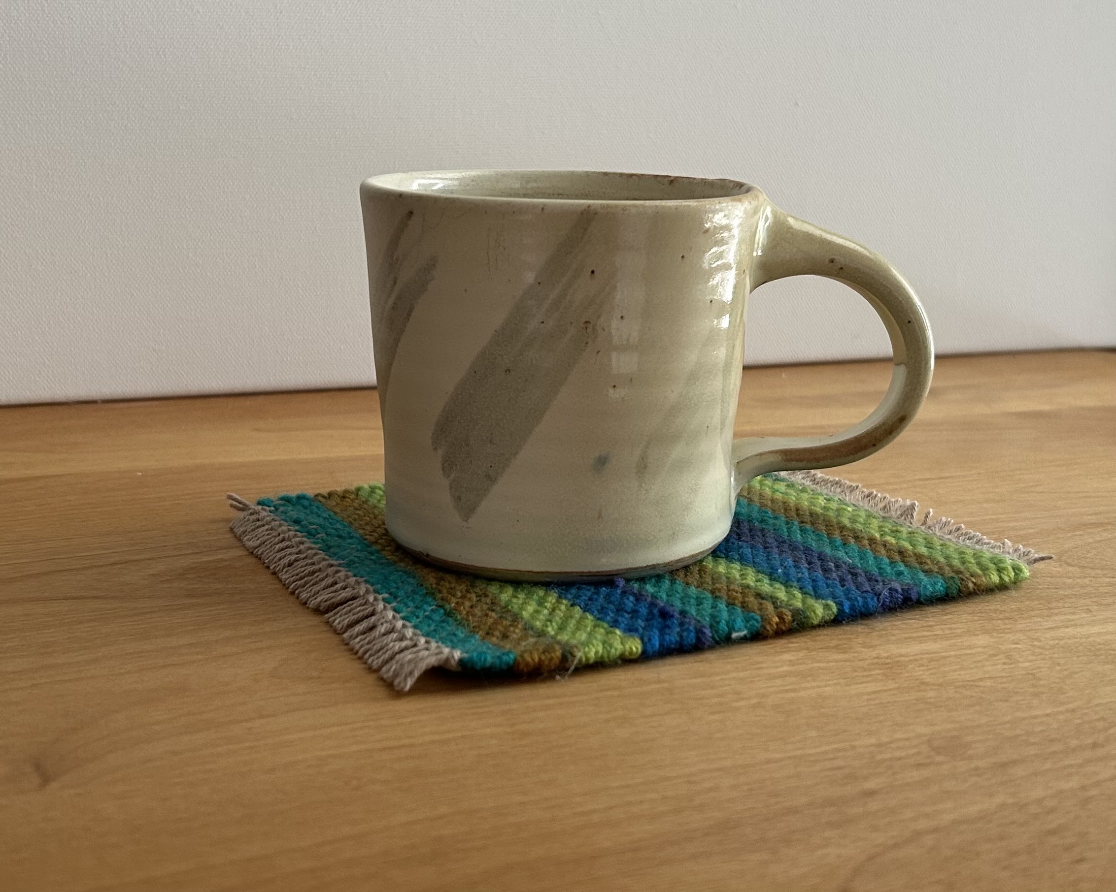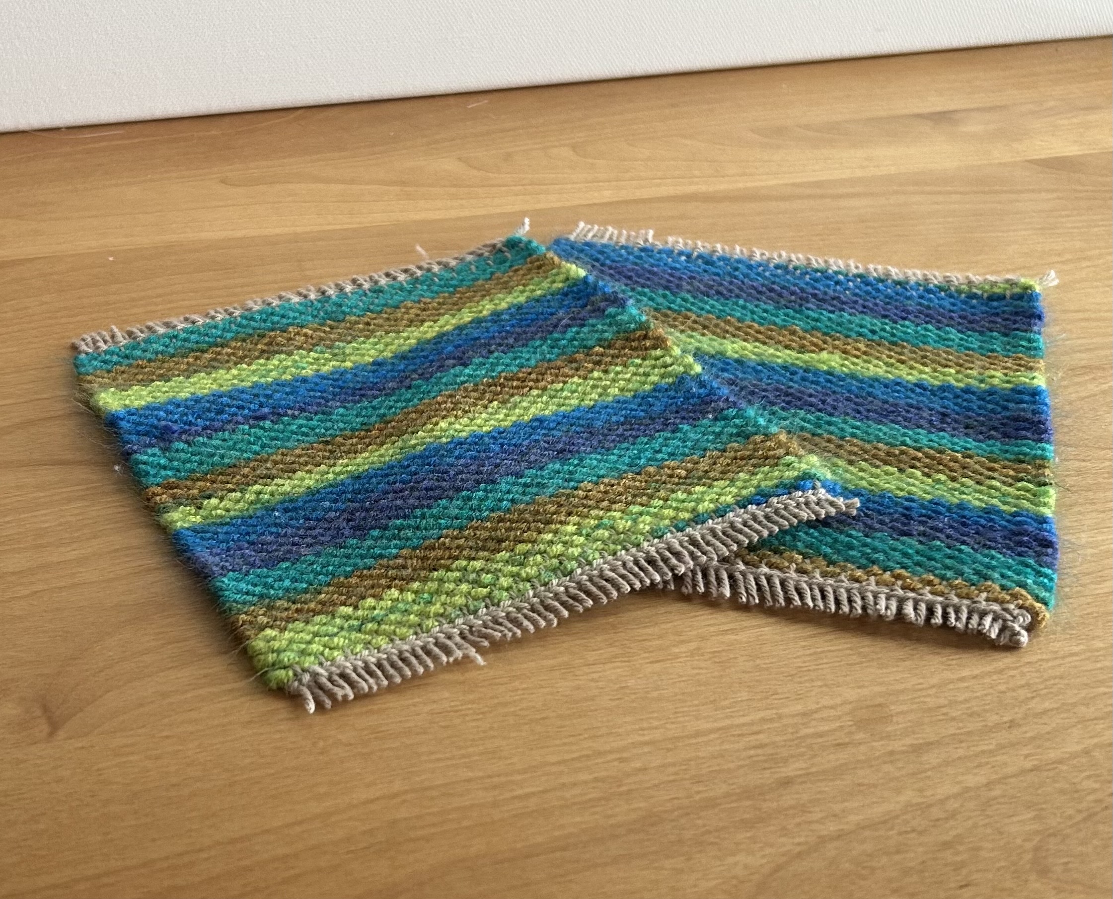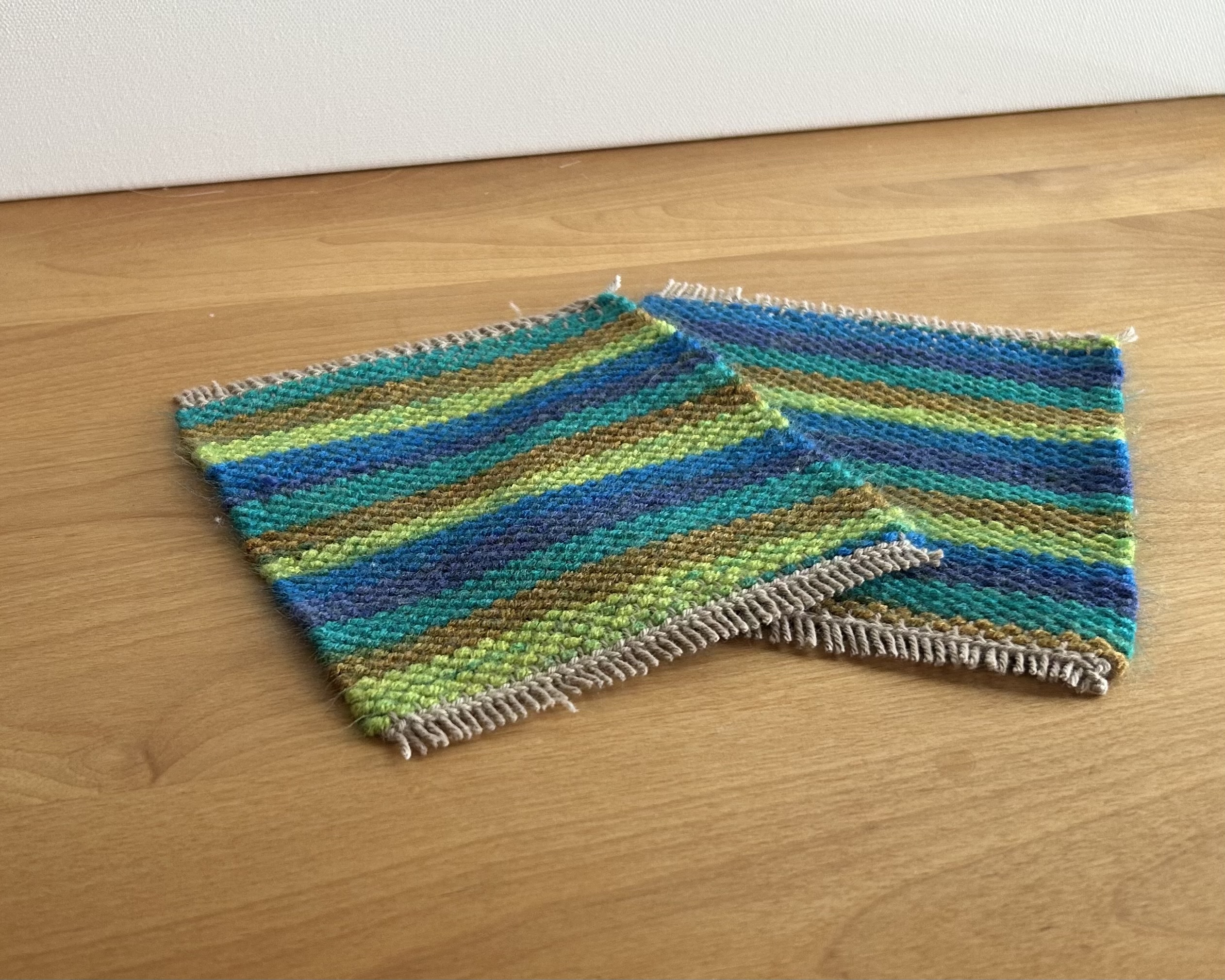 Woven on my smaller rigid heddle loom using tan 8/4 rug warp and a self-striping acrylic yarn these little 5-1/2 by 5-3/4 inch rugs with a short fringe, resemble throw rugs.