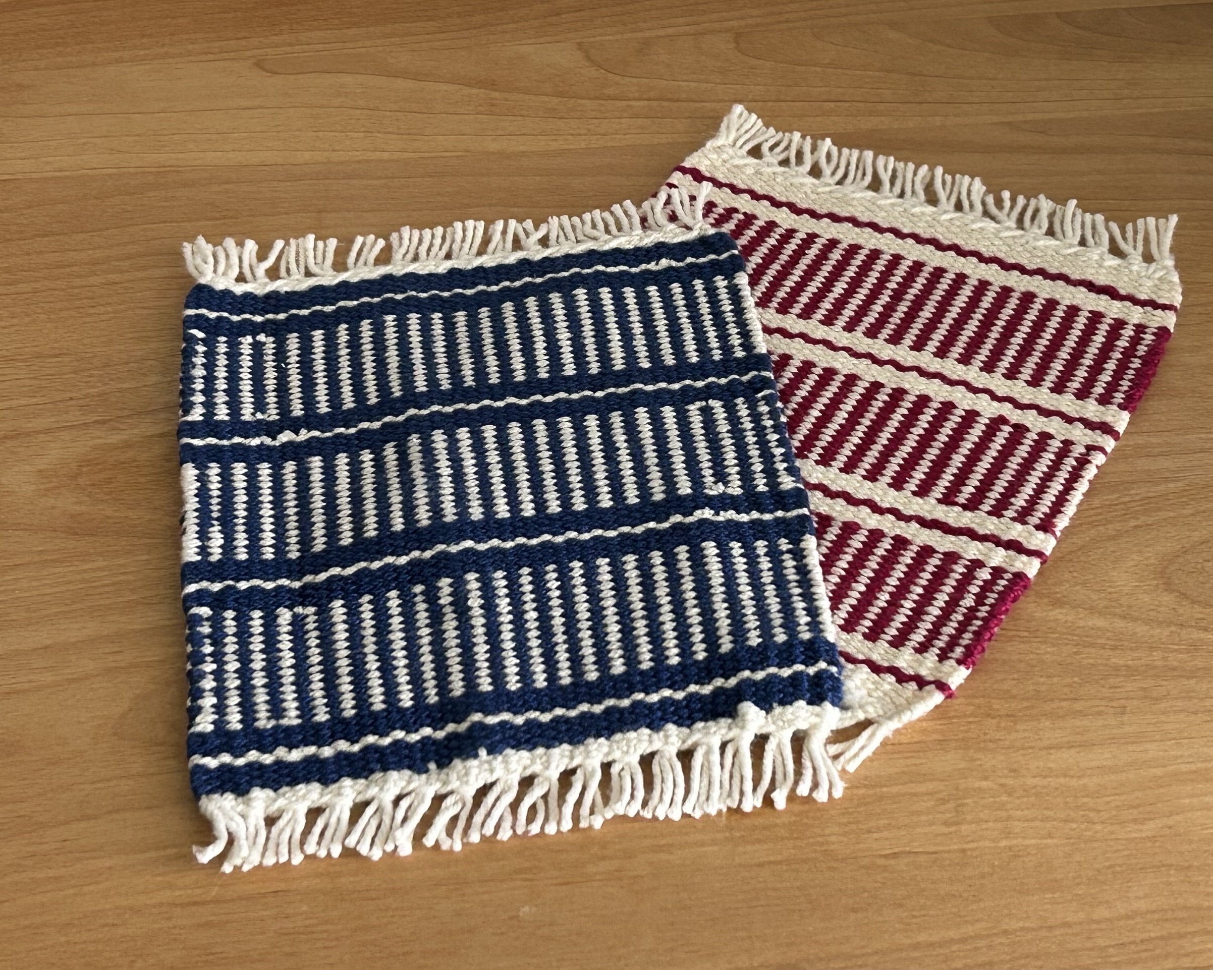 This summer I have been experimenting with different weaving techniques and re-visiting some I haven't used in a while. This set of two approximately 5-3/4-inch by 4-3/4-inch (not including fringe) mug rugs, were handwoven by me on my small rigid heddle loom, using a weft faced technique that essentially hides the warp yarns except for the fringe. This technique takes more time than a balanced weave due to beating each weft throw with a tapestry shuttle multiple times to completely hide the warp.