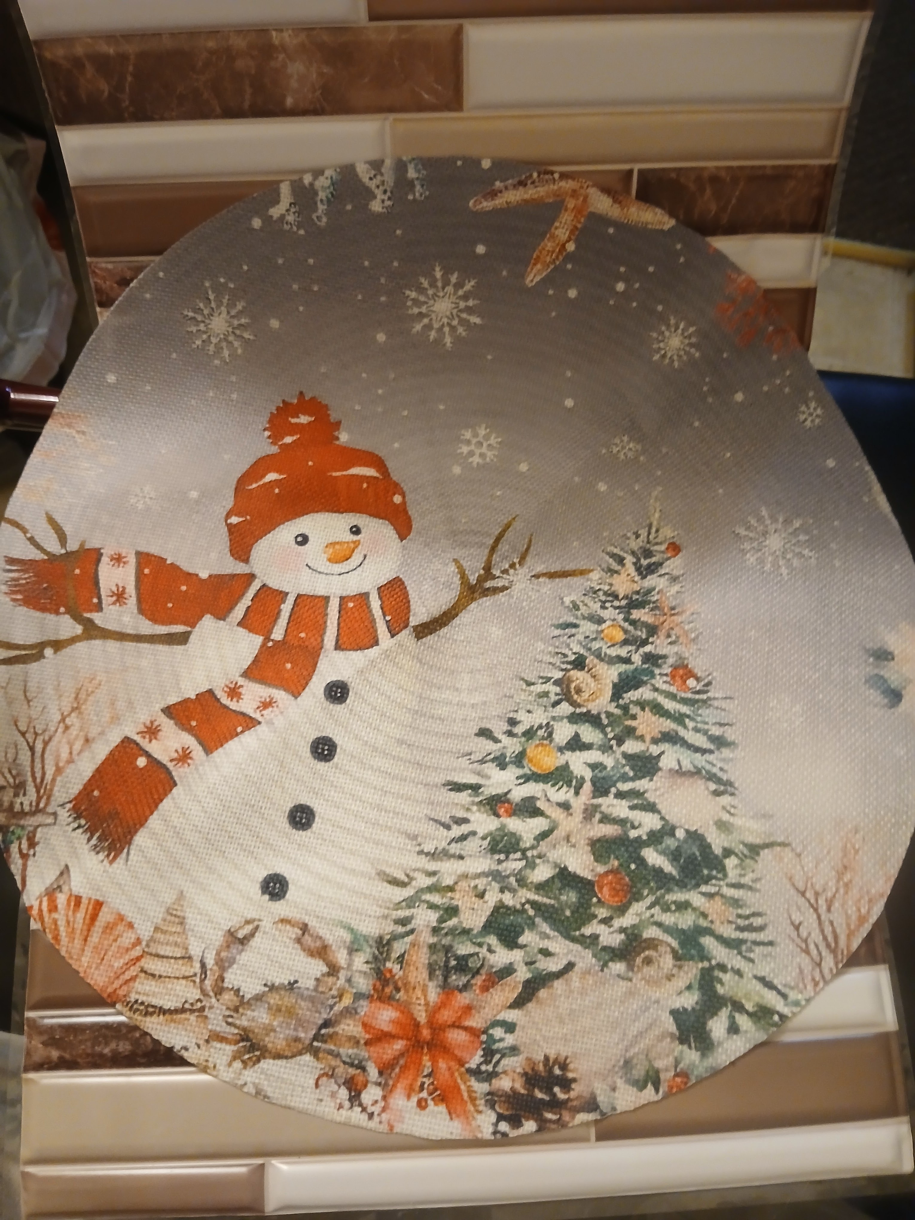 These 15" round placemats feature a snowman and a Christmas tree on a white and grey background these with make and table fun and festive for the holidays
