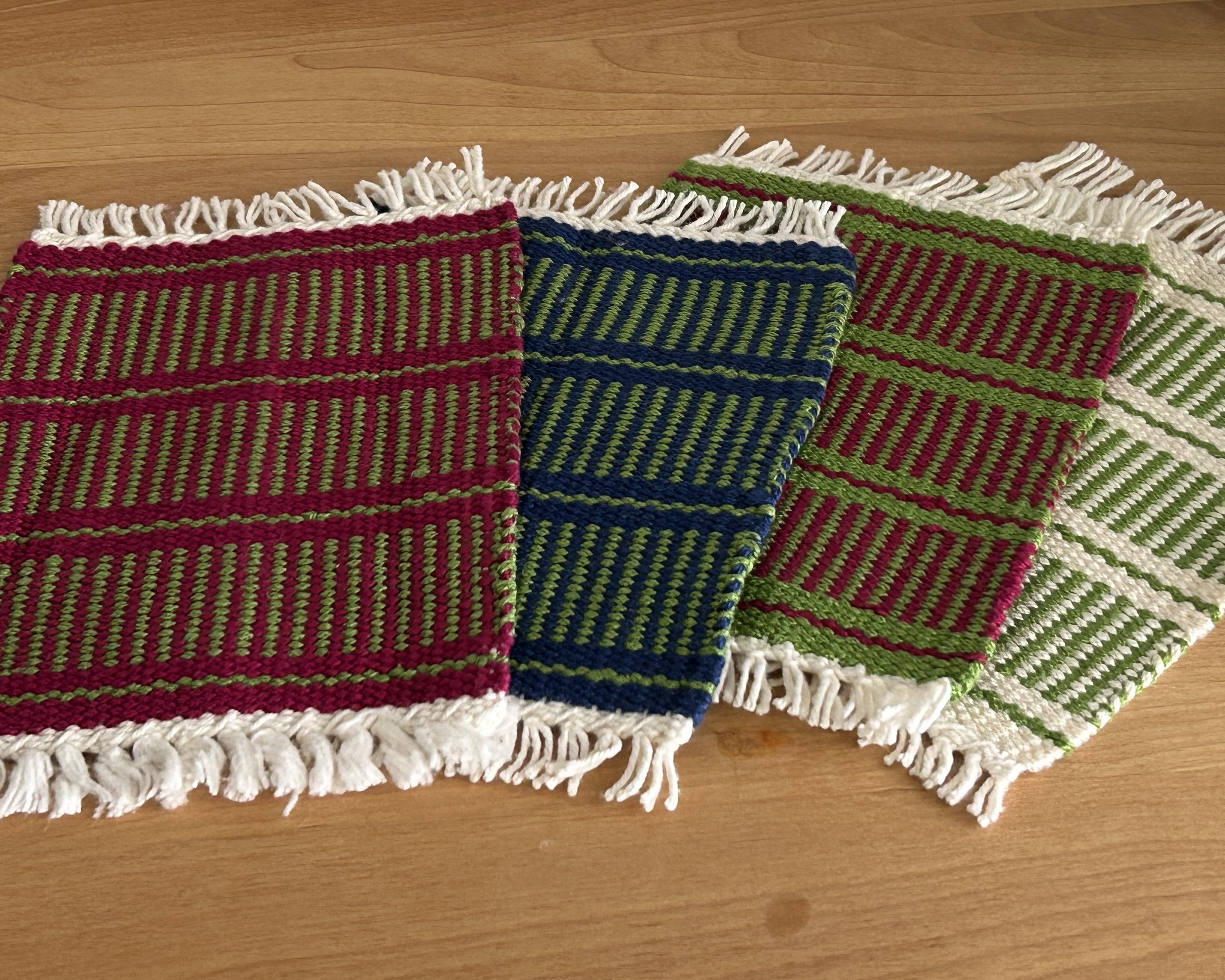 This summer I have been experimenting with different weaving techniques and re-visiting some I haven't used in a while. This set of four approximately 6-inch by 4-3/4-inch (not including fringe) mug rugs, were handwoven by me on my small rigid heddle loom, using a weft faced technique that essentially hides the warp yarns except for the fringe. This technique takes more time than a balanced weave due to beating each weft throw with a tapestry shuttle to completely hide the warp.