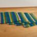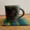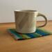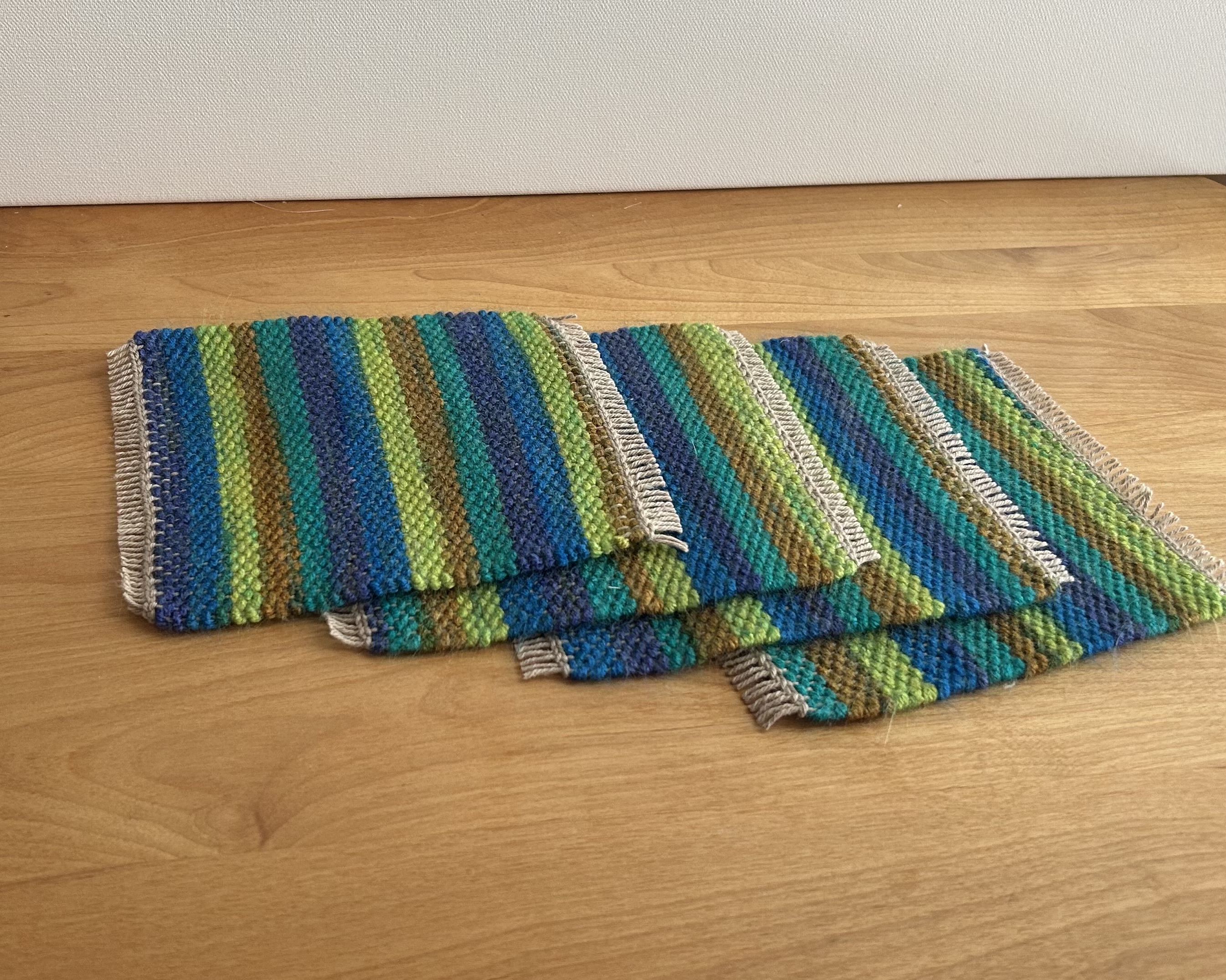 Woven on my smaller rigid heddle loom using tan 8/4 rug warp and a self-striping acrylic yarn these little 5-1/2 by 5-3/4 inch rugs with a short fringe, resemble throw rugs.