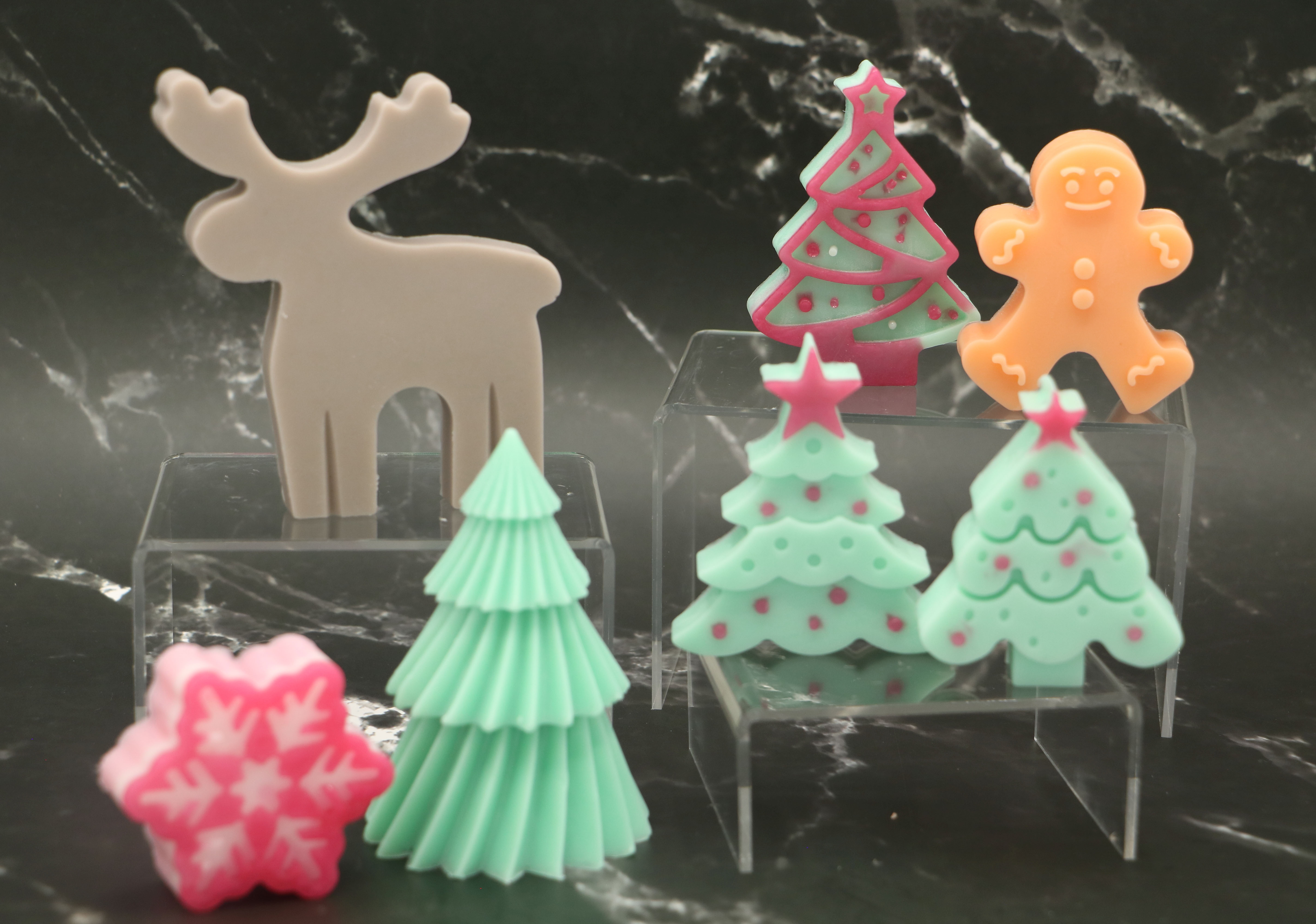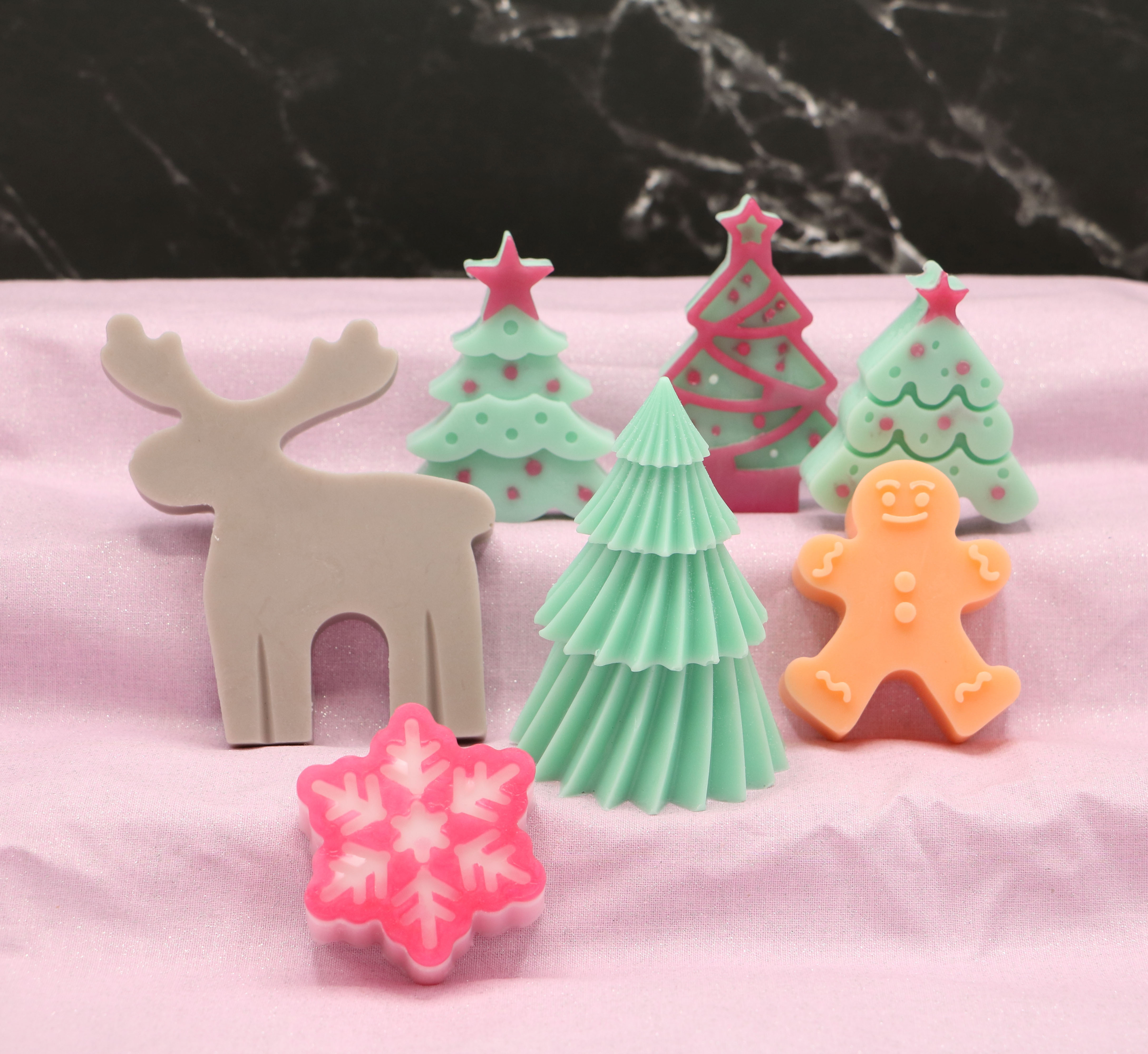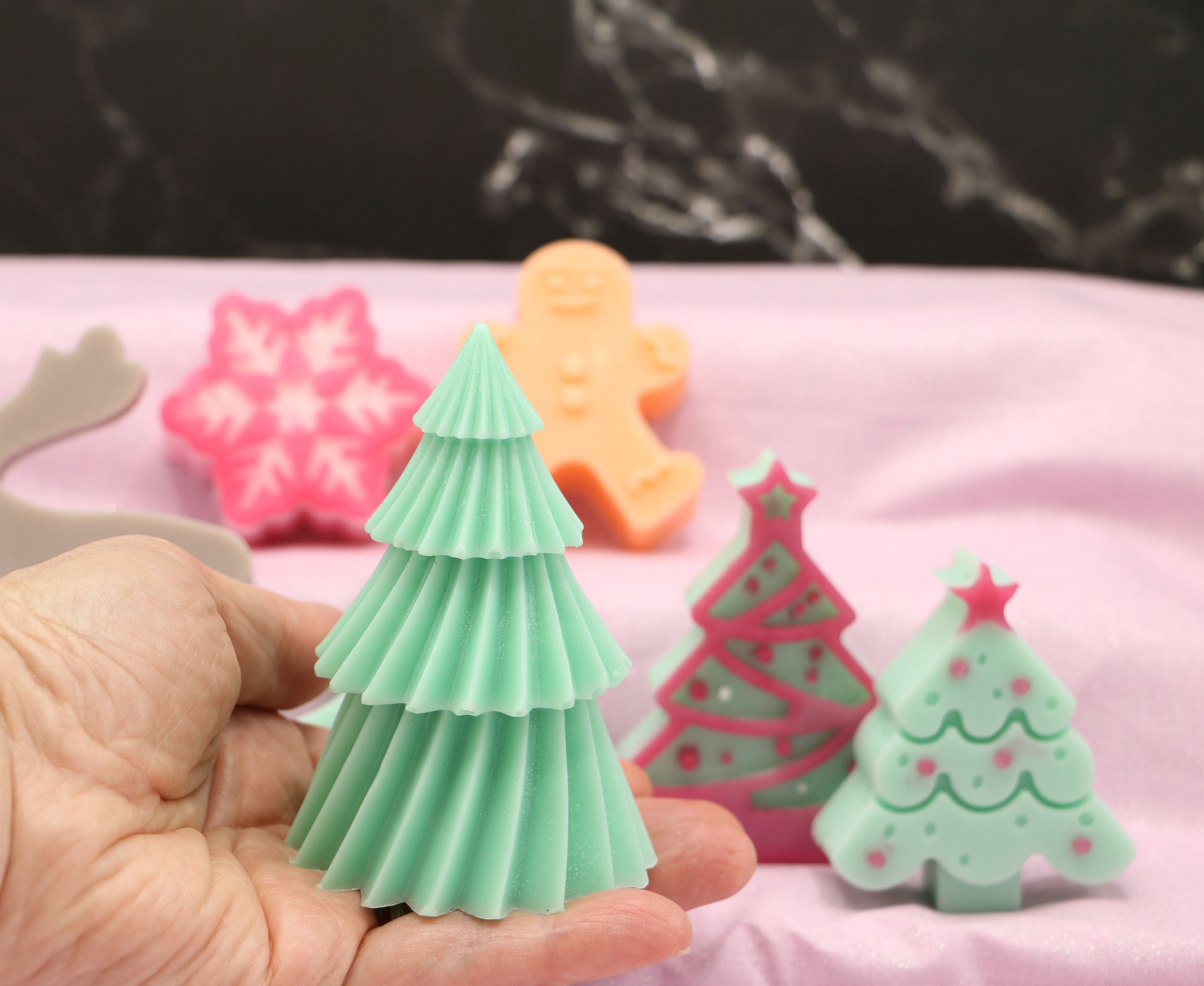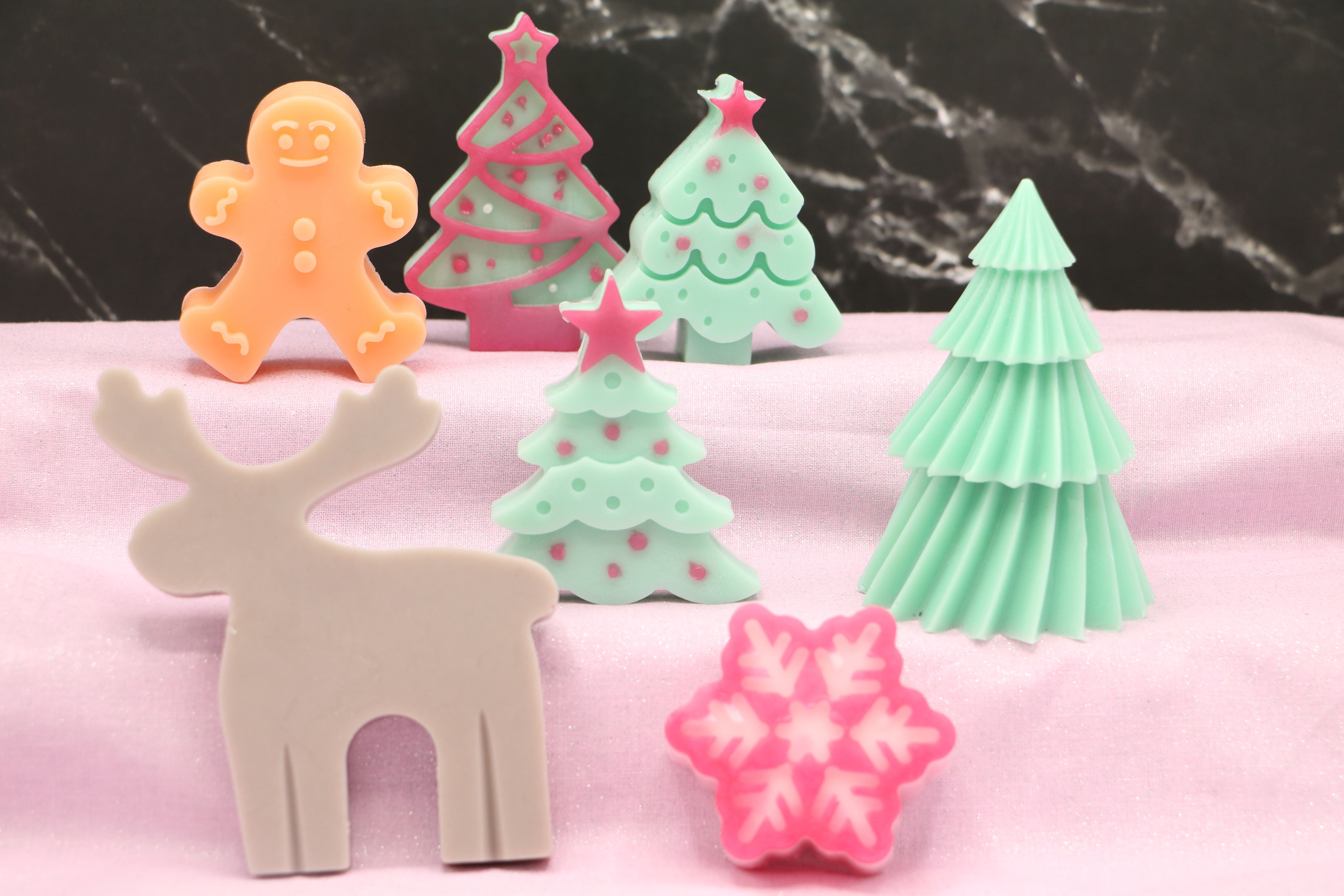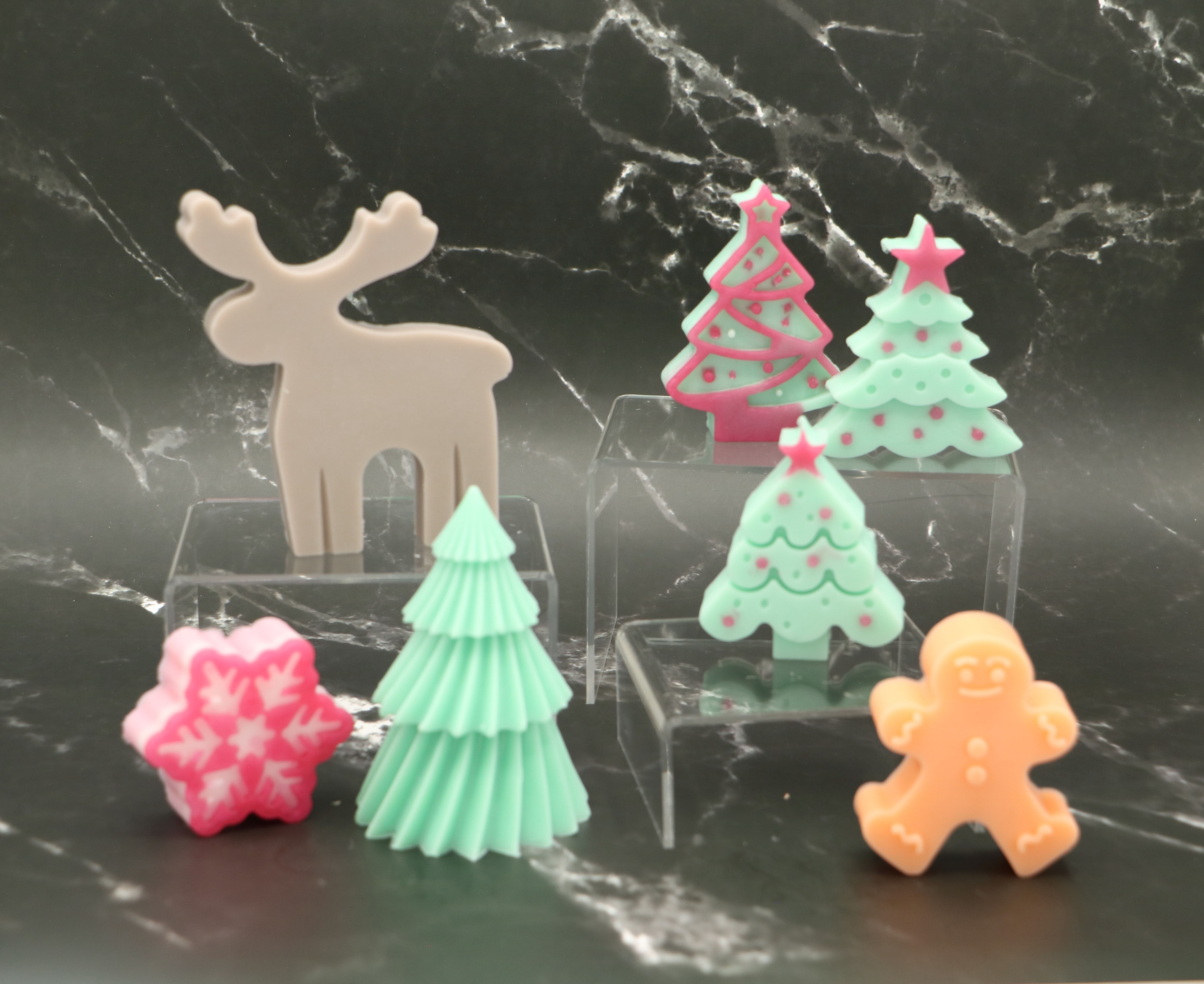 Celebrate the Christmas season with our Set of 7 Christmas holiday themed soaps! These beautiful holiday soaps come in 7 special designs, perfect for adding a touch of fun to bath time. Everyone will love this soap set, consisting of 3 Christmas trees, one Gingerbread Boy, a detailed Snowflake, Large Moose & Large 3D Pine Tree! This Set of 7 Christmas Themed Soaps makes a wonderful soap gift for family or friends. Another use for them is for holiday party favors! The soap set also looks festive adorning your home as a seasonal decoration!